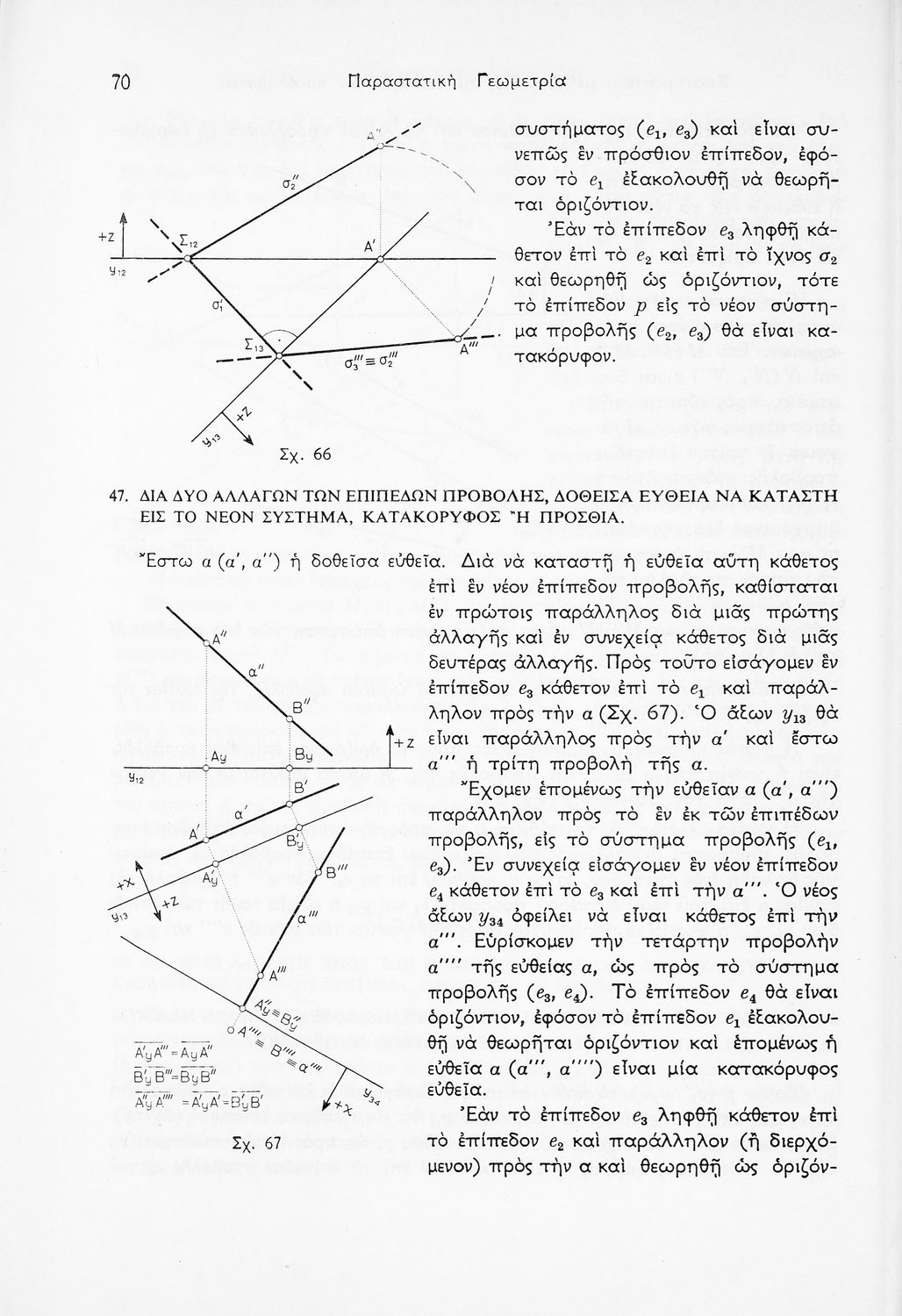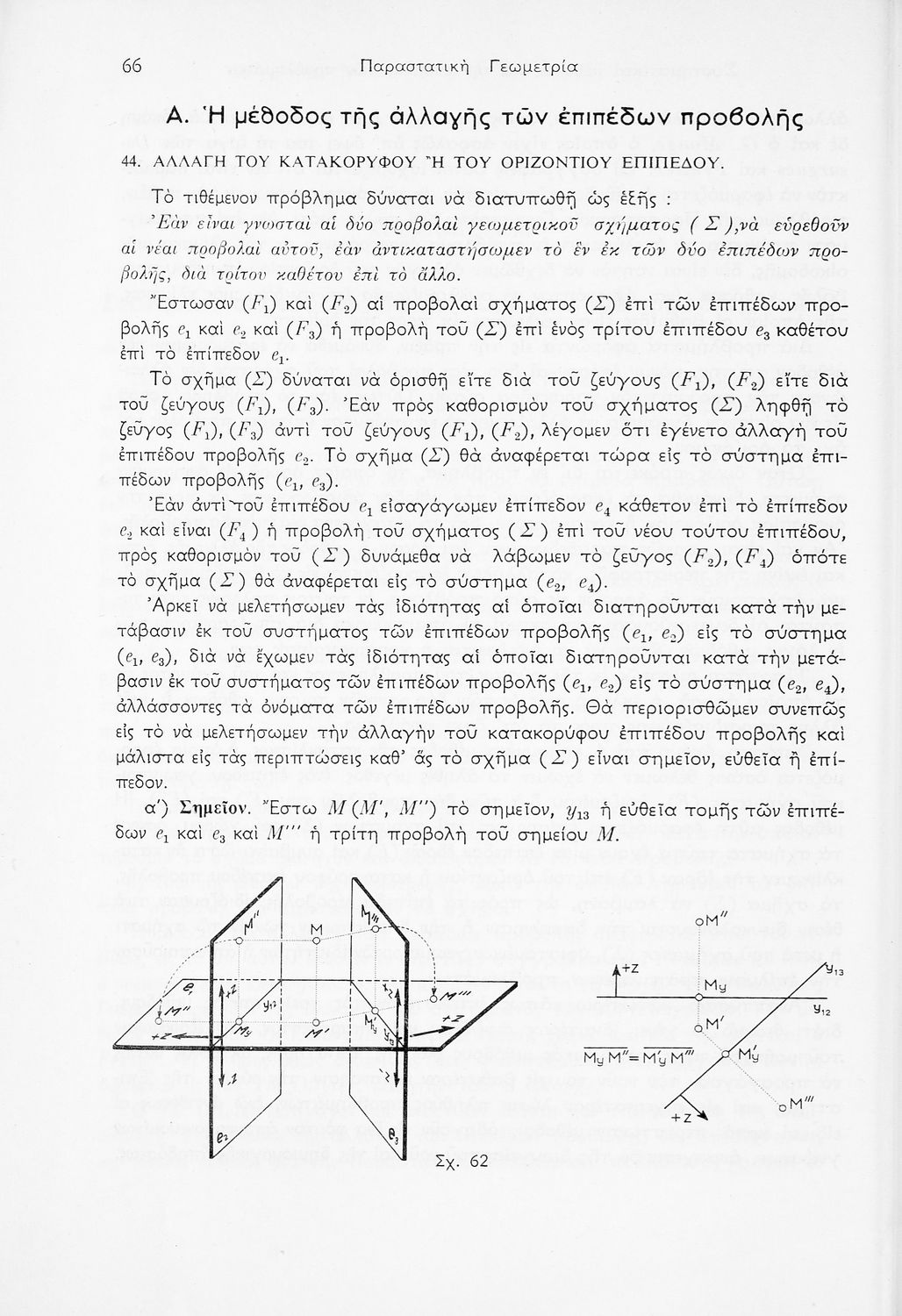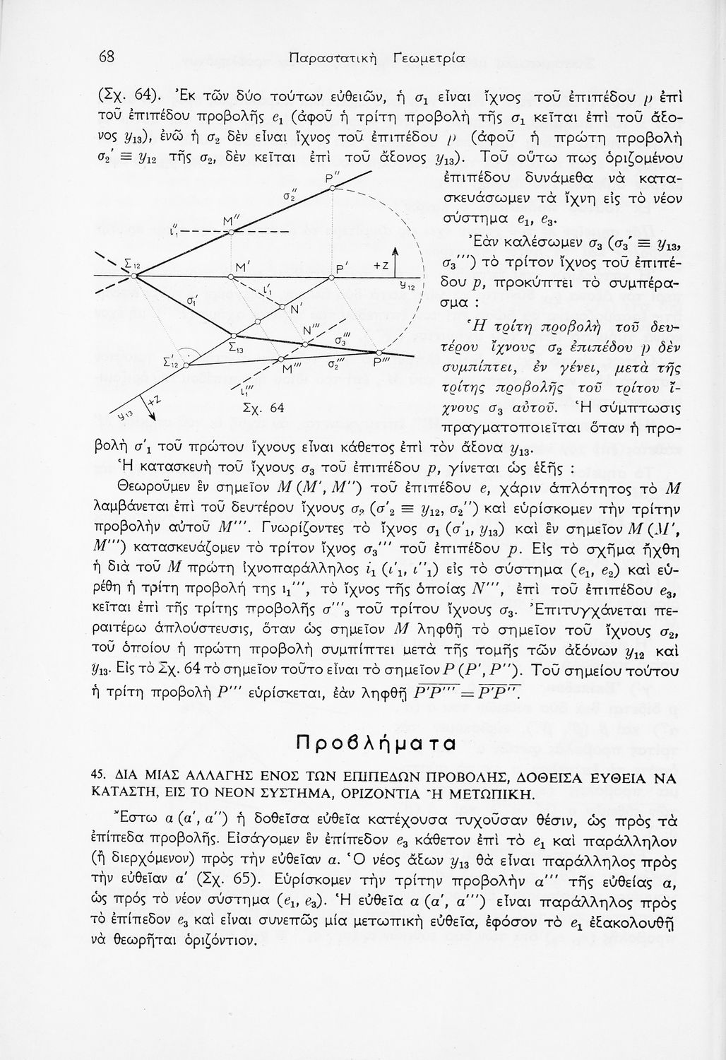 Σχολικό εγχειρίδιο Παραστατικής Γεωμετρίας για τις Ε΄ και ΣΤ΄ Γυμνασίου χωρισμένο σε θεωρία και ασκήσεις που περιλαμβάνει παράρτημα με έγχρωμα διαγράμματα σε Χ, Ψ, Ζ άξονα. Ο συγγραφέας ήταν καθηγητής στο ΕΜΠ. Φέρει το σύμβολο της δικτατορίας.