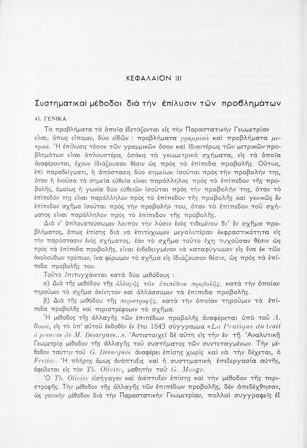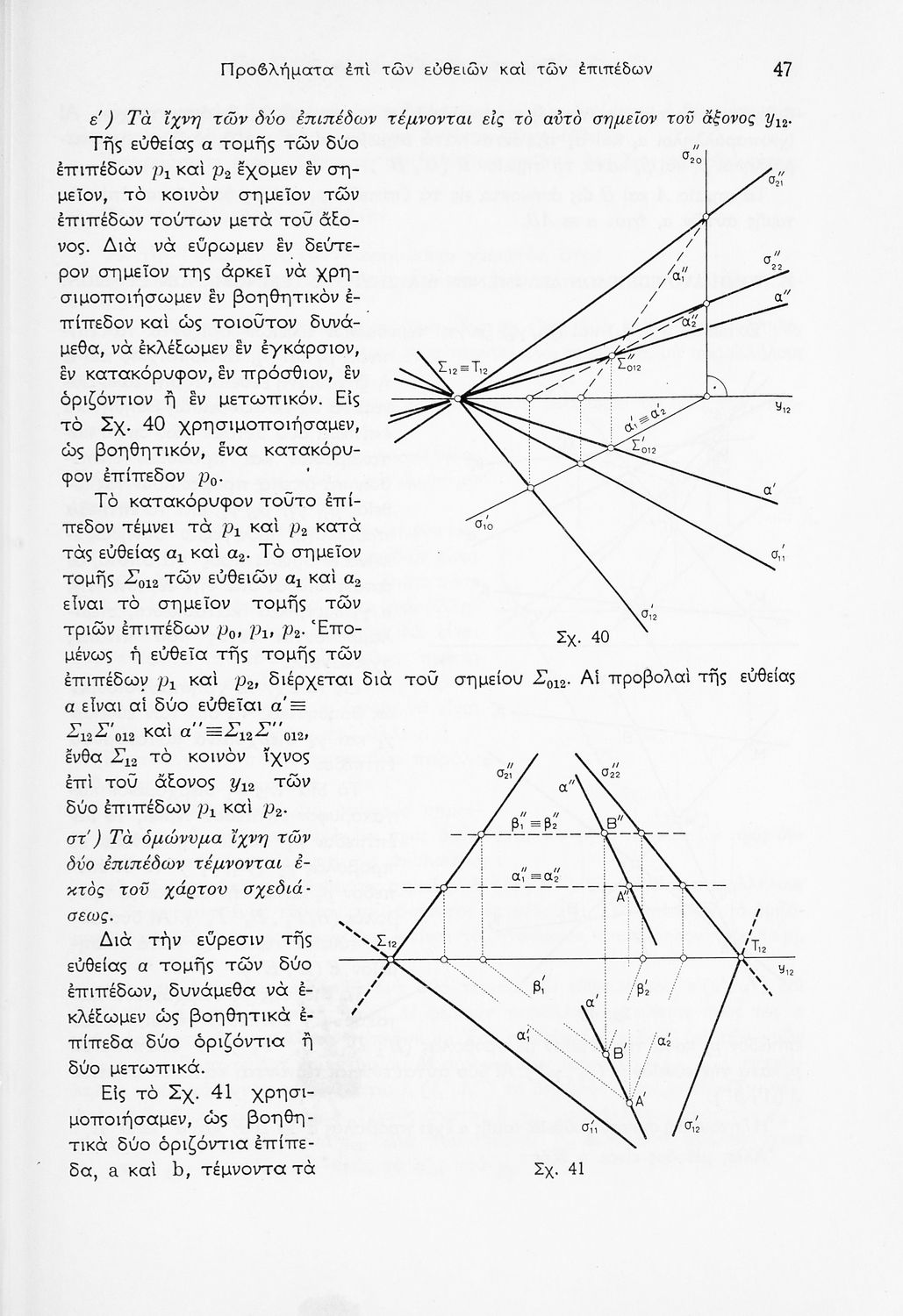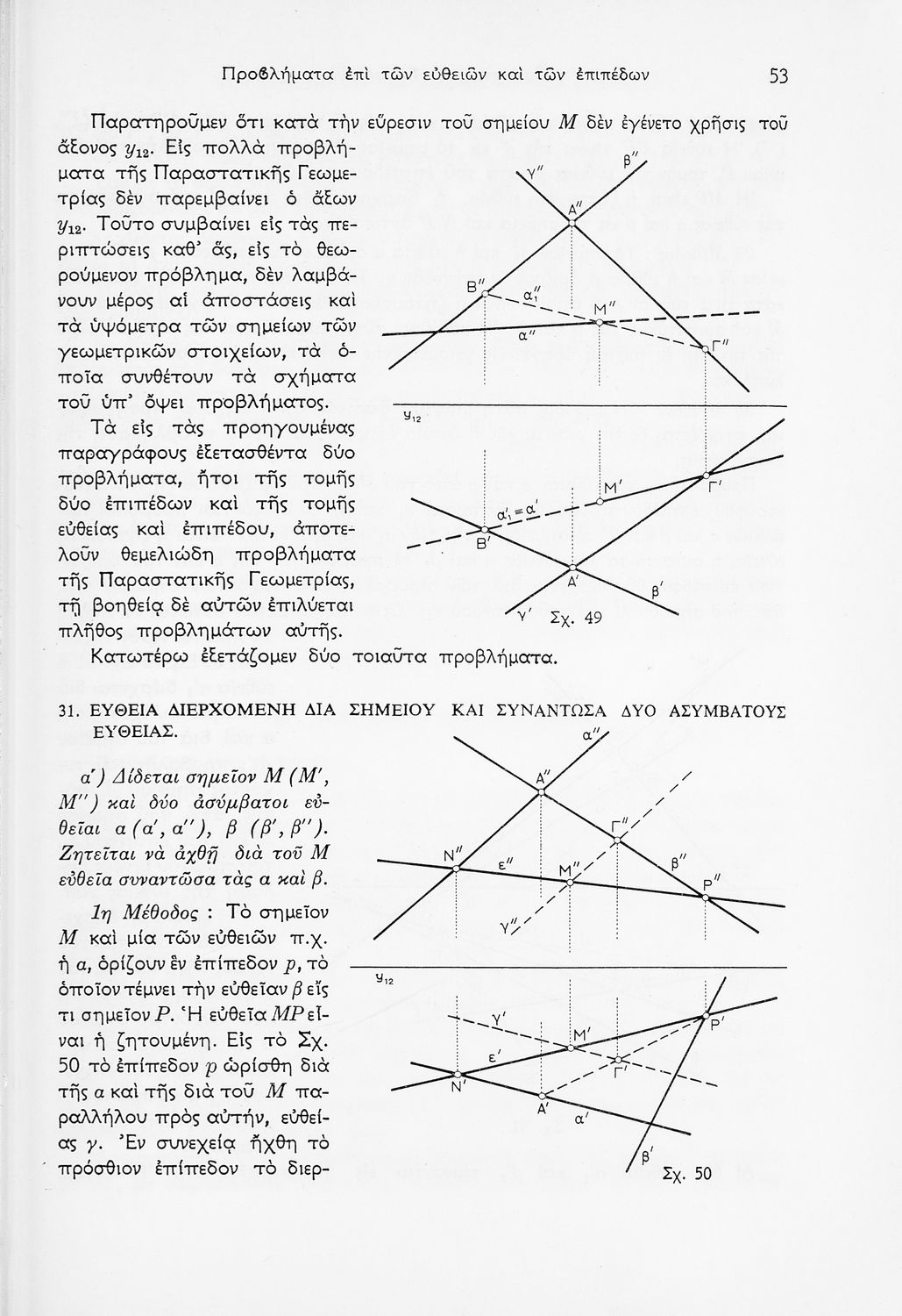 Σχολικό εγχειρίδιο Παραστατικής Γεωμετρίας για τις Ε΄ και ΣΤ΄ Γυμνασίου χωρισμένο σε θεωρία και ασκήσεις που περιλαμβάνει παράρτημα με έγχρωμα διαγράμματα σε Χ, Ψ, Ζ άξονα. Ο συγγραφέας ήταν καθηγητής στο ΕΜΠ. Φέρει το σύμβολο της δικτατορίας.