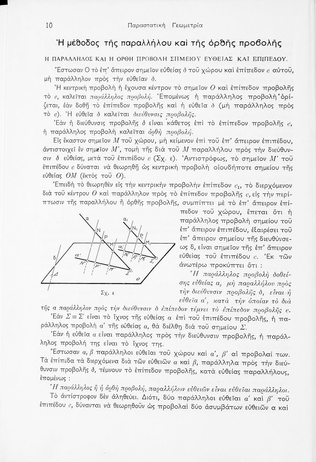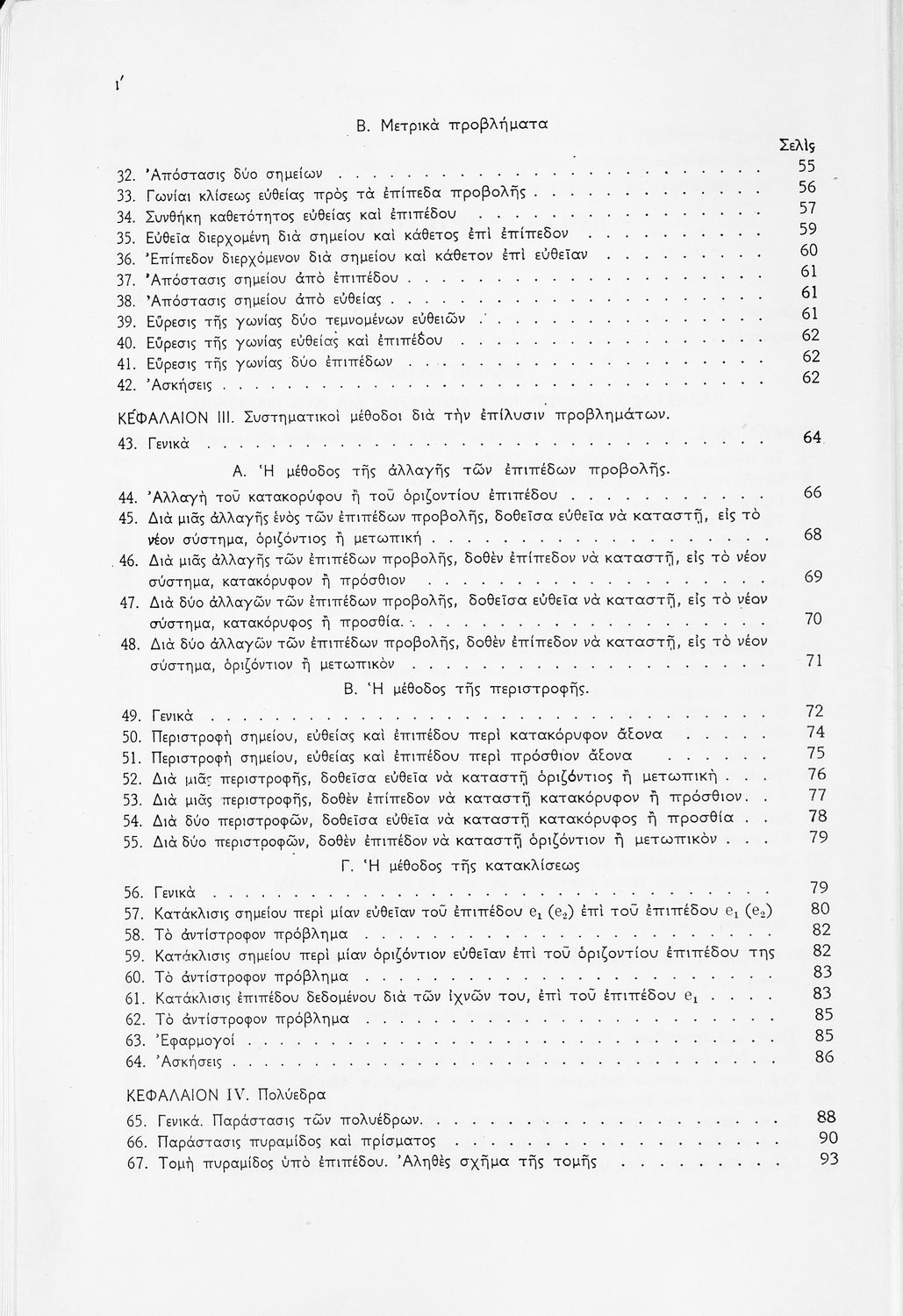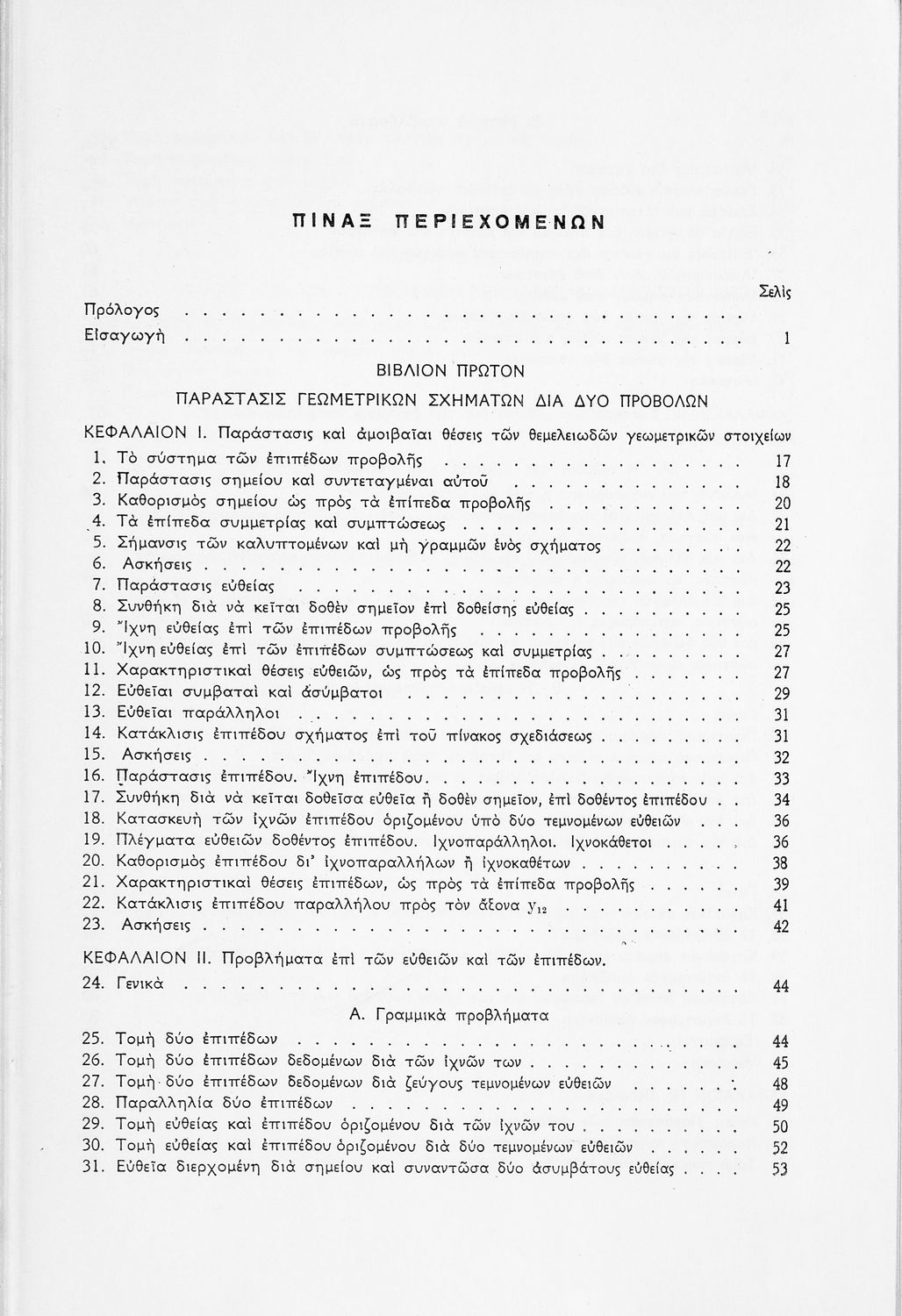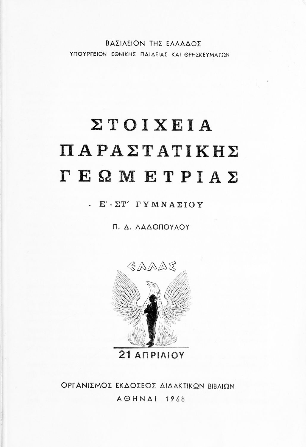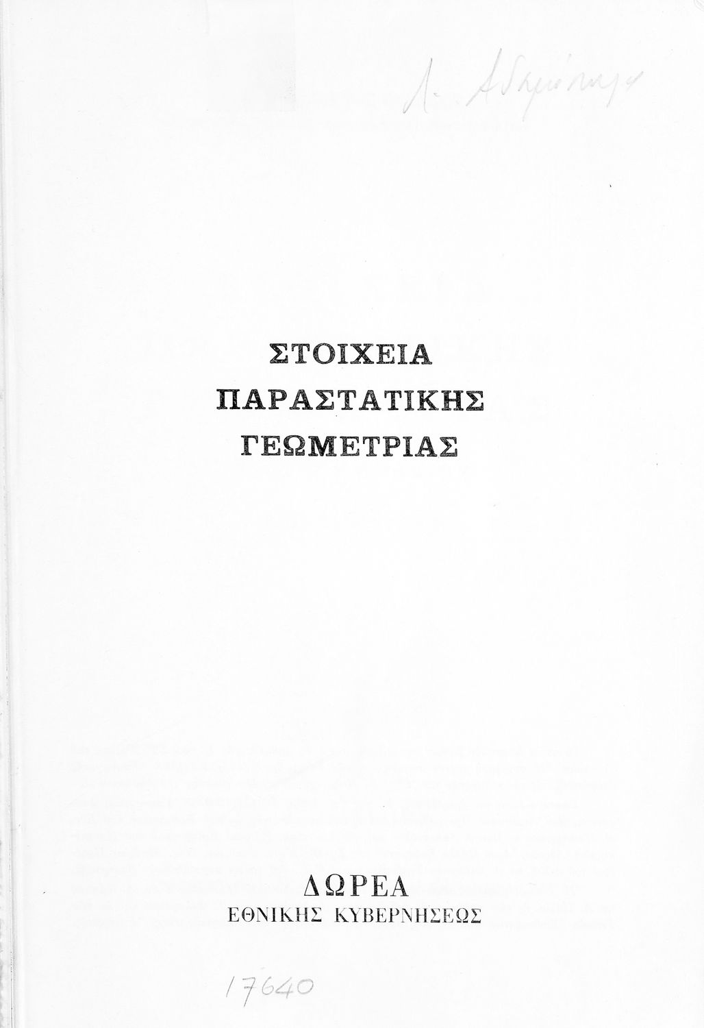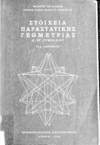 Σχολικό εγχειρίδιο Παραστατικής Γεωμετρίας για τις Ε΄ και ΣΤ΄ Γυμνασίου χωρισμένο σε θεωρία και ασκήσεις που περιλαμβάνει παράρτημα με έγχρωμα διαγράμματα σε Χ, Ψ, Ζ άξονα. Ο συγγραφέας ήταν καθηγητής στο ΕΜΠ. Φέρει το σύμβολο της δικτατορίας.
