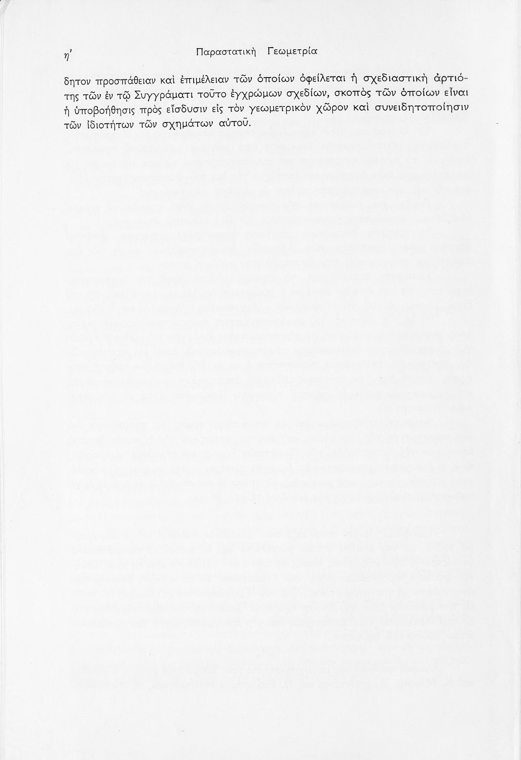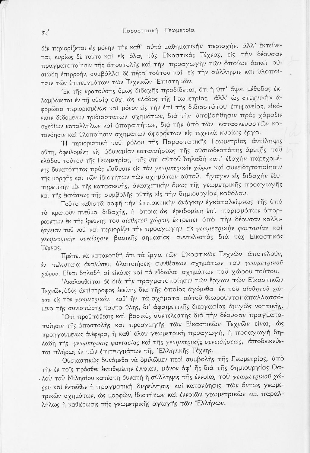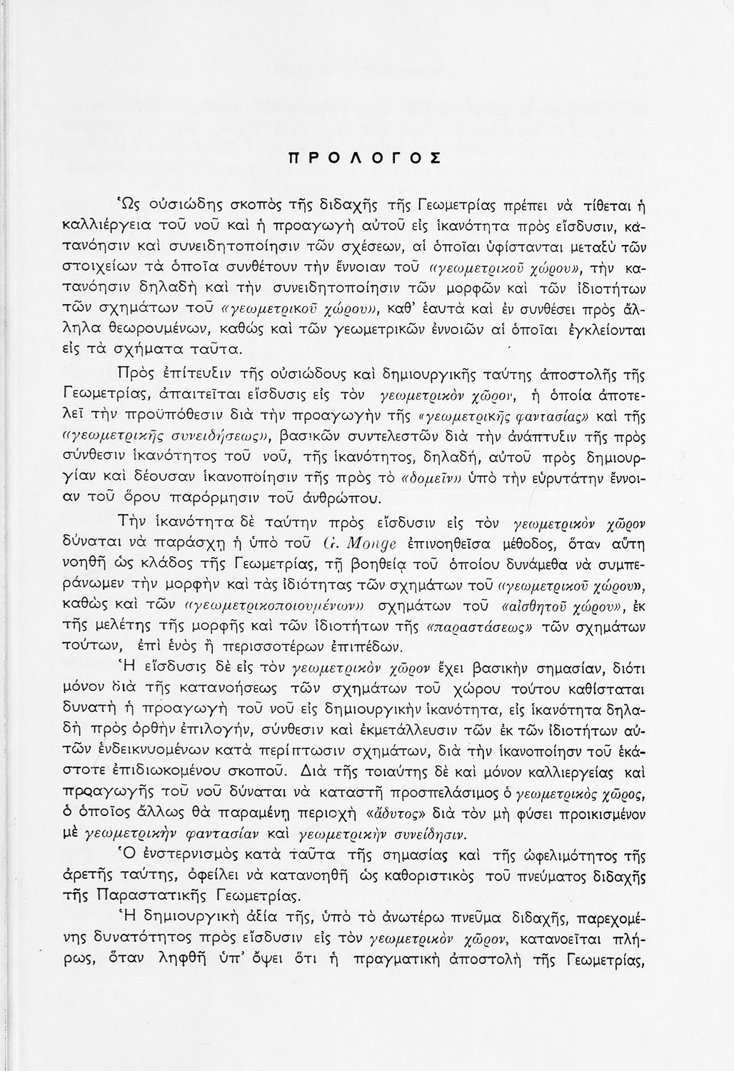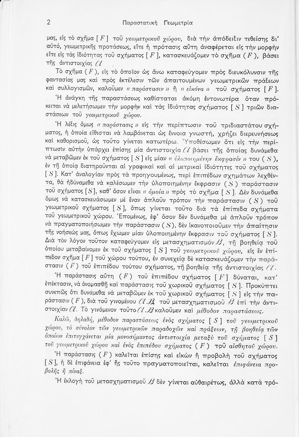 Σχολικό εγχειρίδιο Παραστατικής Γεωμετρίας για τις Ε΄ και ΣΤ΄ Γυμνασίου χωρισμένο σε θεωρία και ασκήσεις που περιλαμβάνει παράρτημα με έγχρωμα διαγράμματα σε Χ, Ψ, Ζ άξονα. Ο συγγραφέας ήταν καθηγητής στο ΕΜΠ. Φέρει το σύμβολο της δικτατορίας.