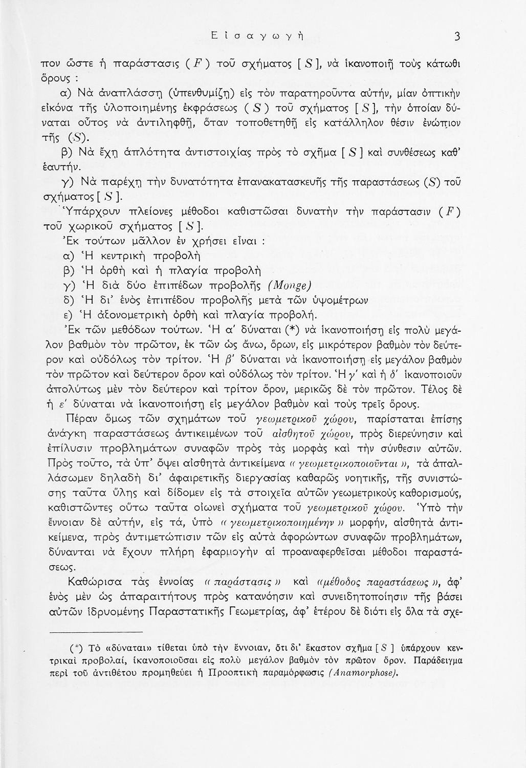 Παρουσίαση περιεχομένου: Σχολικό εγχειρίδιο Παραστατικής Γεωμετρίας για τις Ε΄ και ΣΤ΄ Γυμνασίου χωρισμένο σε θεωρία και ασκήσεις που περιλαμβάνει παράρτημα με έγχρωμα διαγράμματα σε Χ, Ψ, Ζ άξονα. Ο συγγραφέας ήταν καθηγητής στο ΕΜΠ. Φέρει το σύμβολο της δικτατορίας.