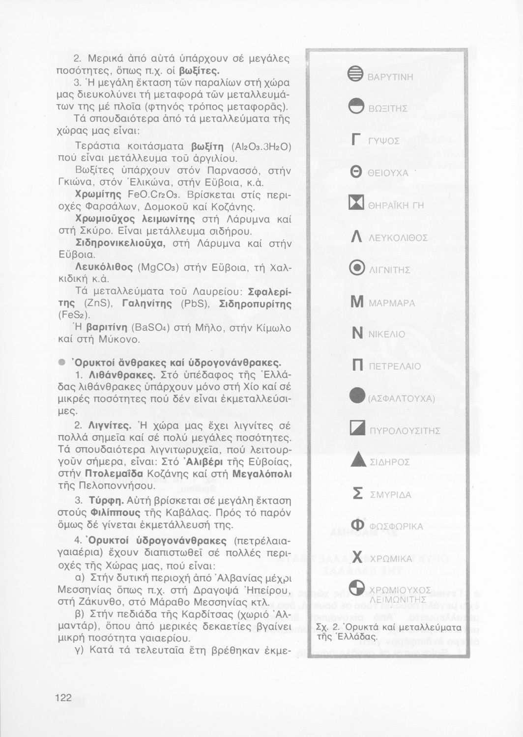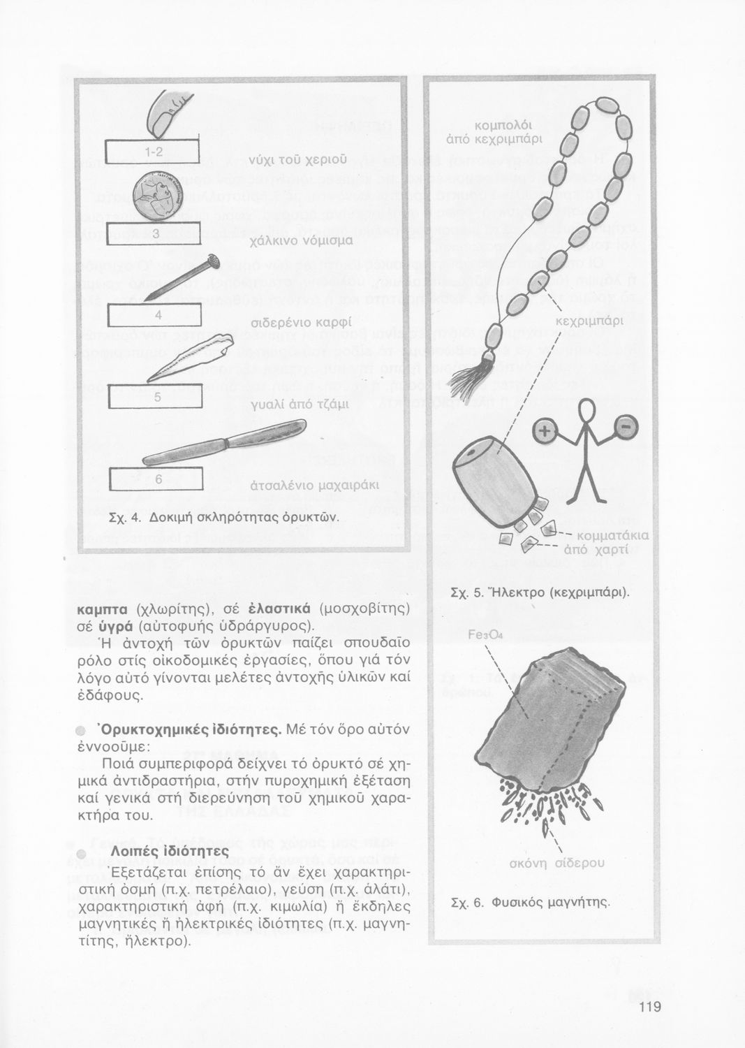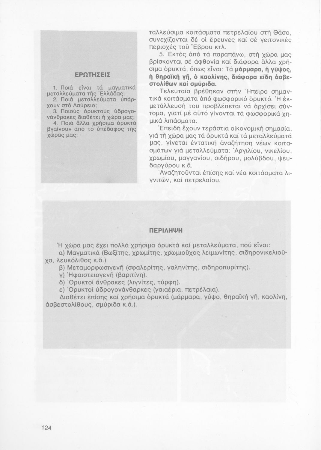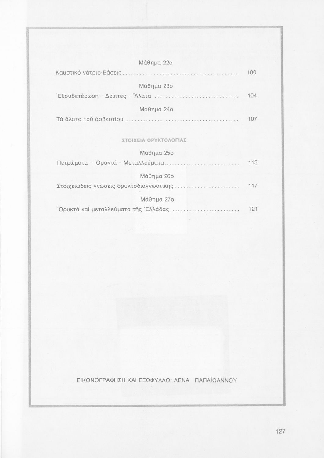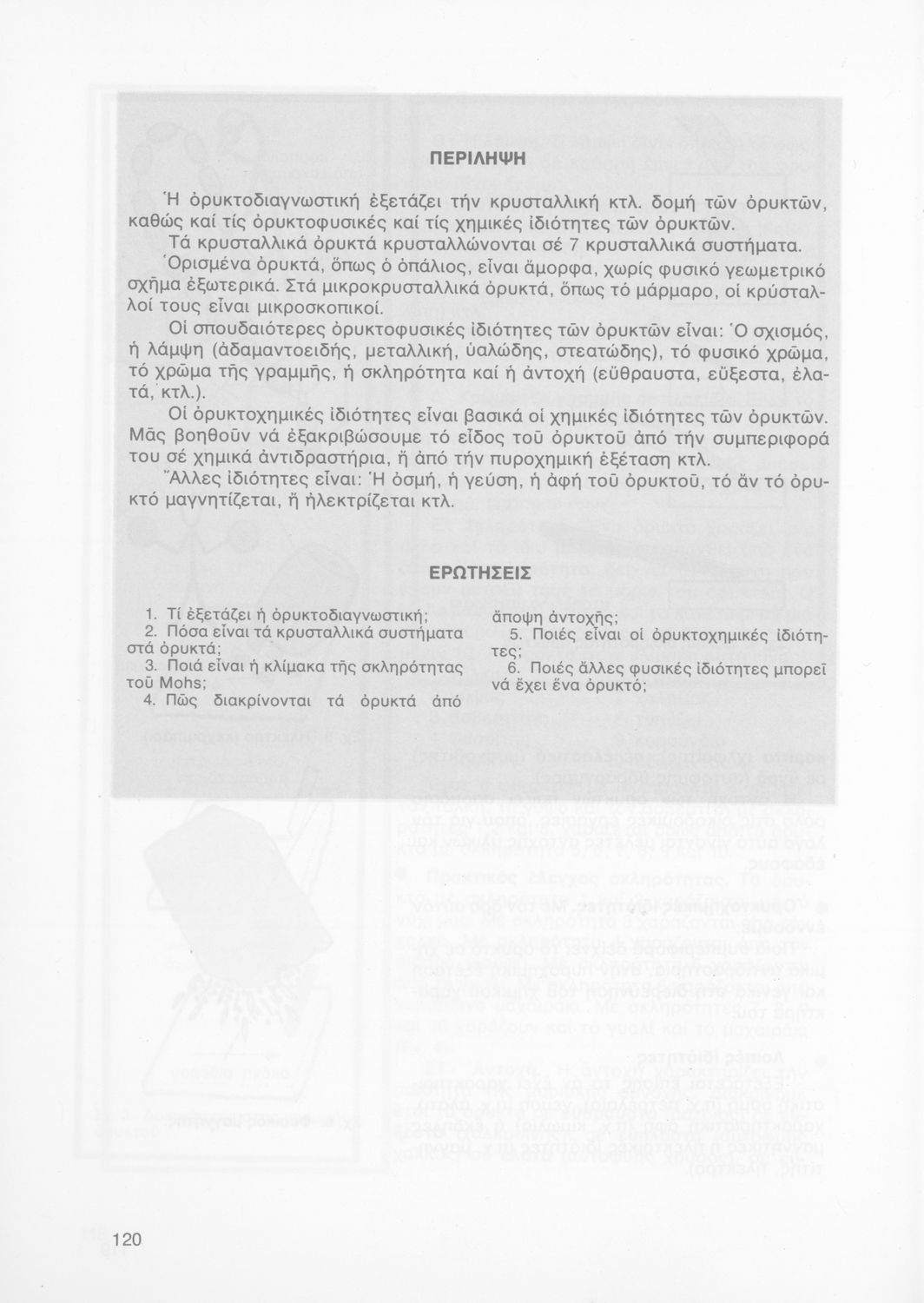 Σχολικό εγχειρίδιο Γεωλογίας/Ορυκτολογίας για τη Β΄ Γυμνασίου που παρουσιάζει τα ορυκτά με βάση την κλάση στην οποία ανήκουν. Περιέχει και πίνακα των γεωλογικών περιόδων.