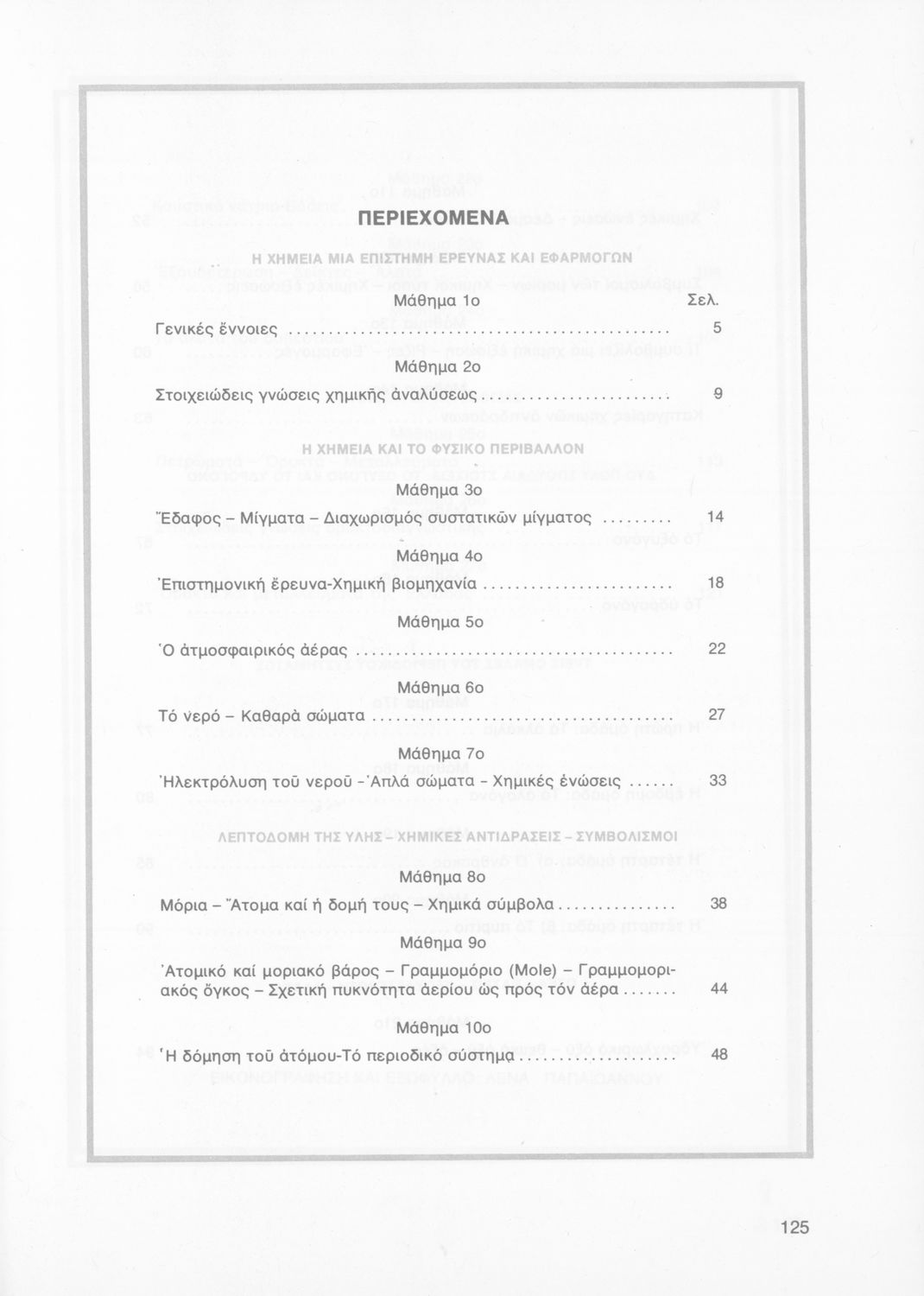 Το συγκεκριμένο εγχειρίδιο αφορά το μάθημα της Χημείας και αναφέρεται σε μαθητές της Β΄ τάξης των Οκταταξίων Γυμνασίων. Περιγράφει τις χημικές ενώσεις των σωμάτων και τα μείγματα τους, φυσικούς και τεχνικούς ...