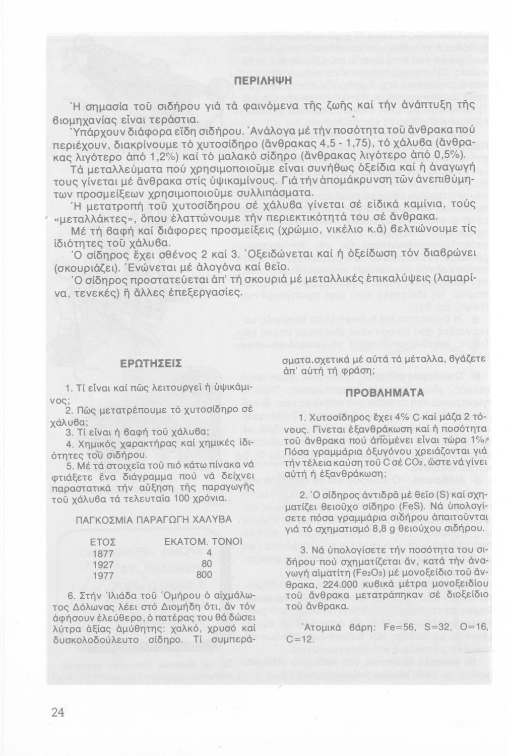 Βαθμίδα εκπαίδευσης: Δευτεροβάθμια Τάξη: Γ' Γυμνασίου Μάθημα: Χημεία Γλώσσα: Δημοτική Παρουσίαση περιεχομένου: Σχολικό εγχειρίδιο Χημείας Γ΄ Γυμνασίου στο οποίο περιγράφονται τα είδη της χημικής ενέργειας (θερμοχημεία, ηλεκτροχημεία), προσδιορίζονται στοιχεία και ενώσεις οργανικής χημείας, στοιχεία και ιδιότητες μετάλλων και αναλύει τον τρόπο με τον οποίο η Χημεία συμβάλλει στη σύγχρονη ζωή του ανθρώπου. |