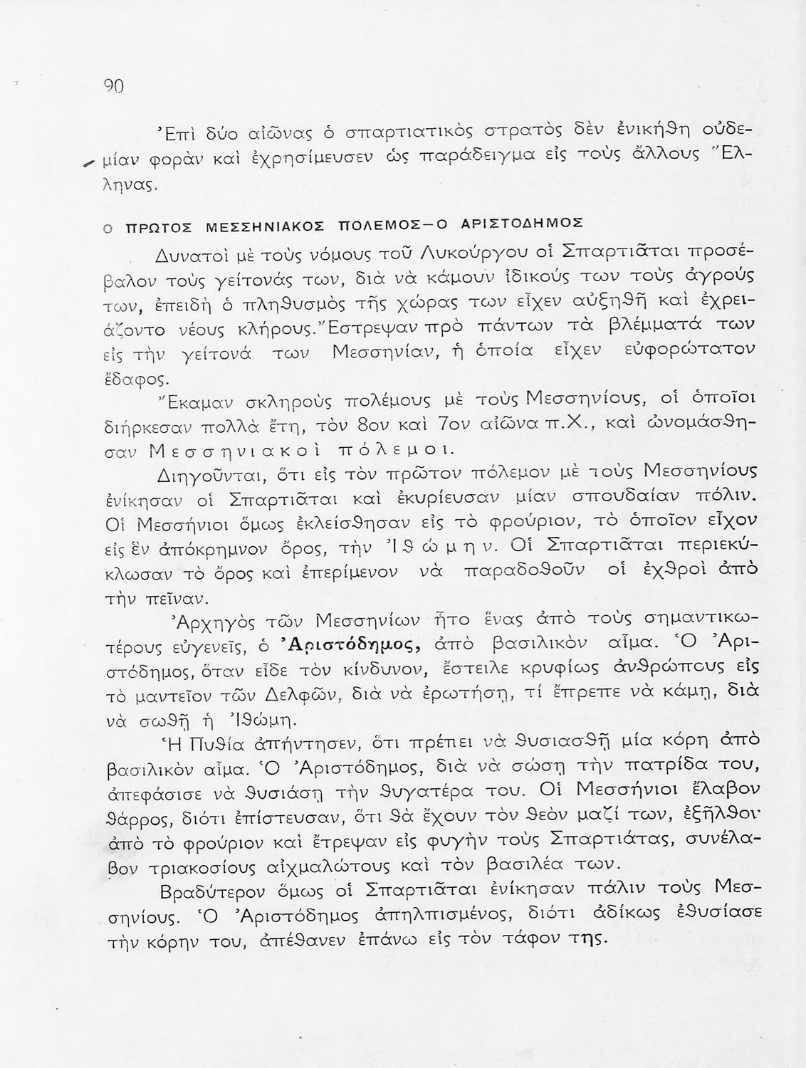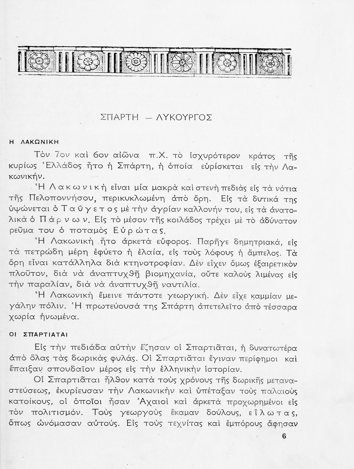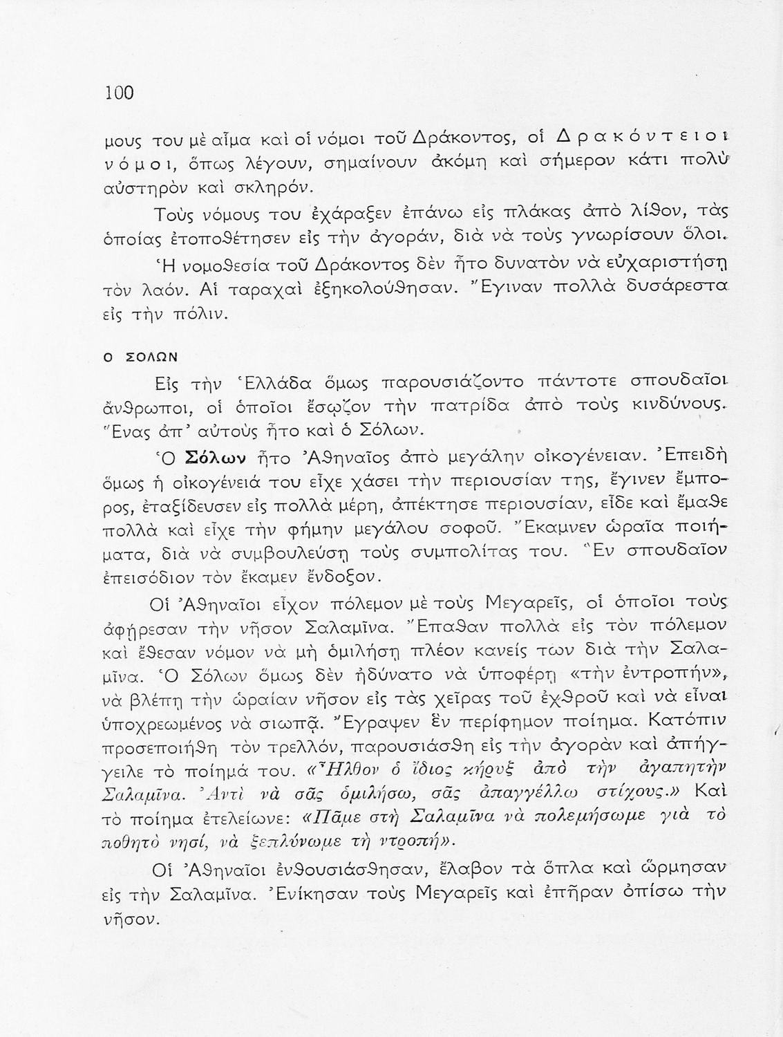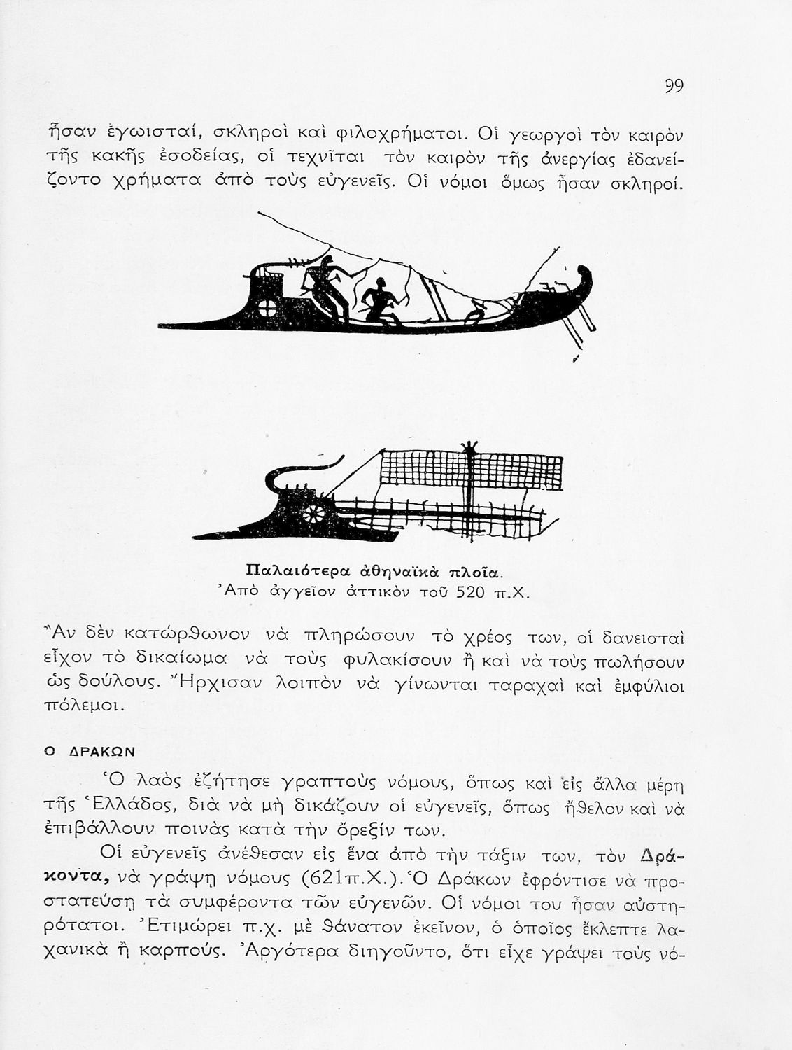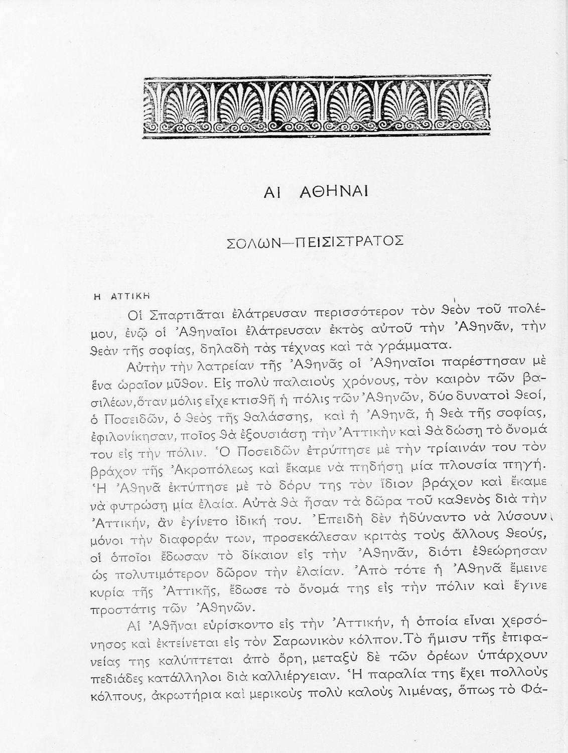 Σχολικό εγχειρίδιο Ιστορίας Α΄ Γυμνασίου και Αστικού Σχολείου που καλύπτει την περίοδο από τους προϊστορικούς χρόνους ως τις μεταρρυθμίσεις του Κλεισθένη. Περιέχει και εκτενή αναφορά στην ανάπτυξη των γραμμάτων, των τεχνών και του εμπορίου.