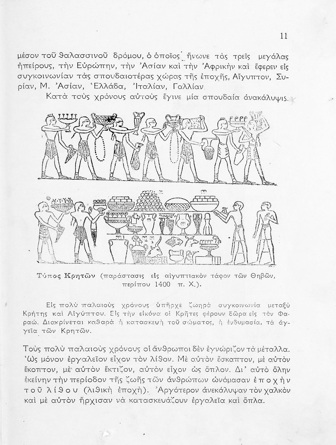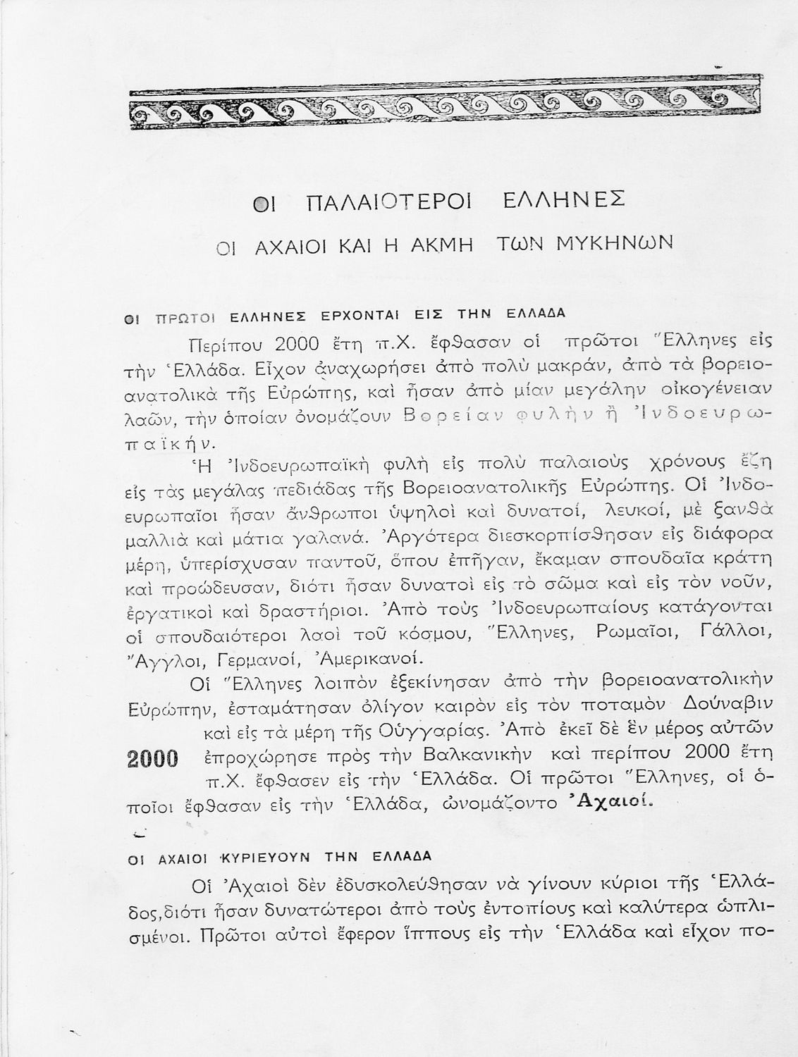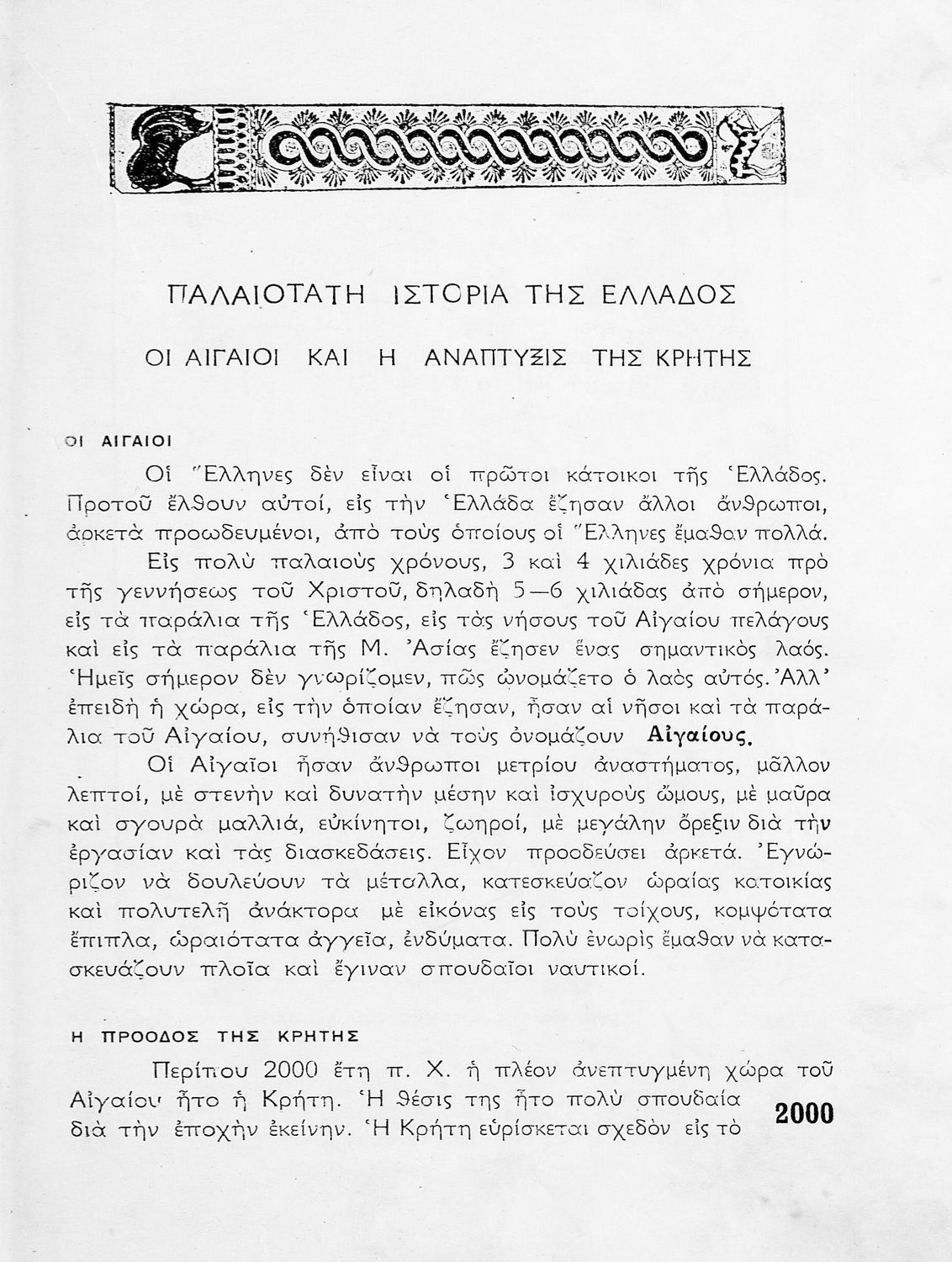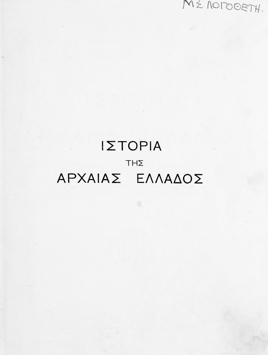 Σχολικό εγχειρίδιο Ιστορίας Α΄ Γυμνασίου και Αστικού Σχολείου που καλύπτει την περίοδο από τους προϊστορικούς χρόνους ως τις μεταρρυθμίσεις του Κλεισθένη. Περιέχει και εκτενή αναφορά στην ανάπτυξη των γραμμάτων, των τεχνών και του εμπορίου.