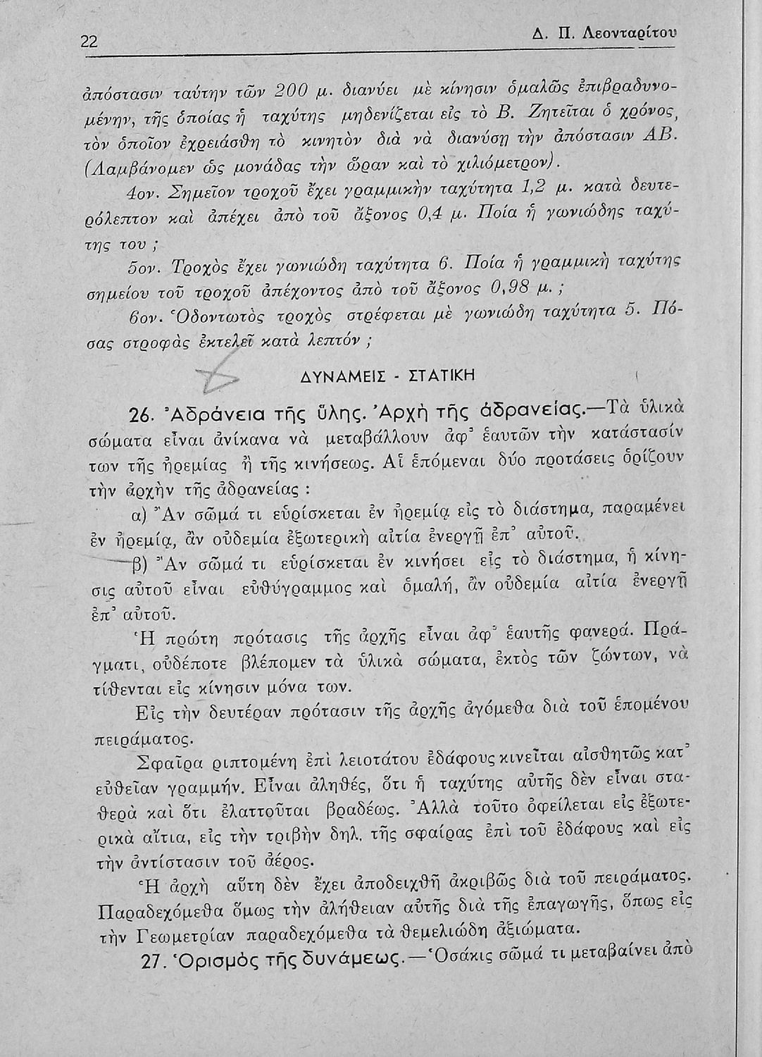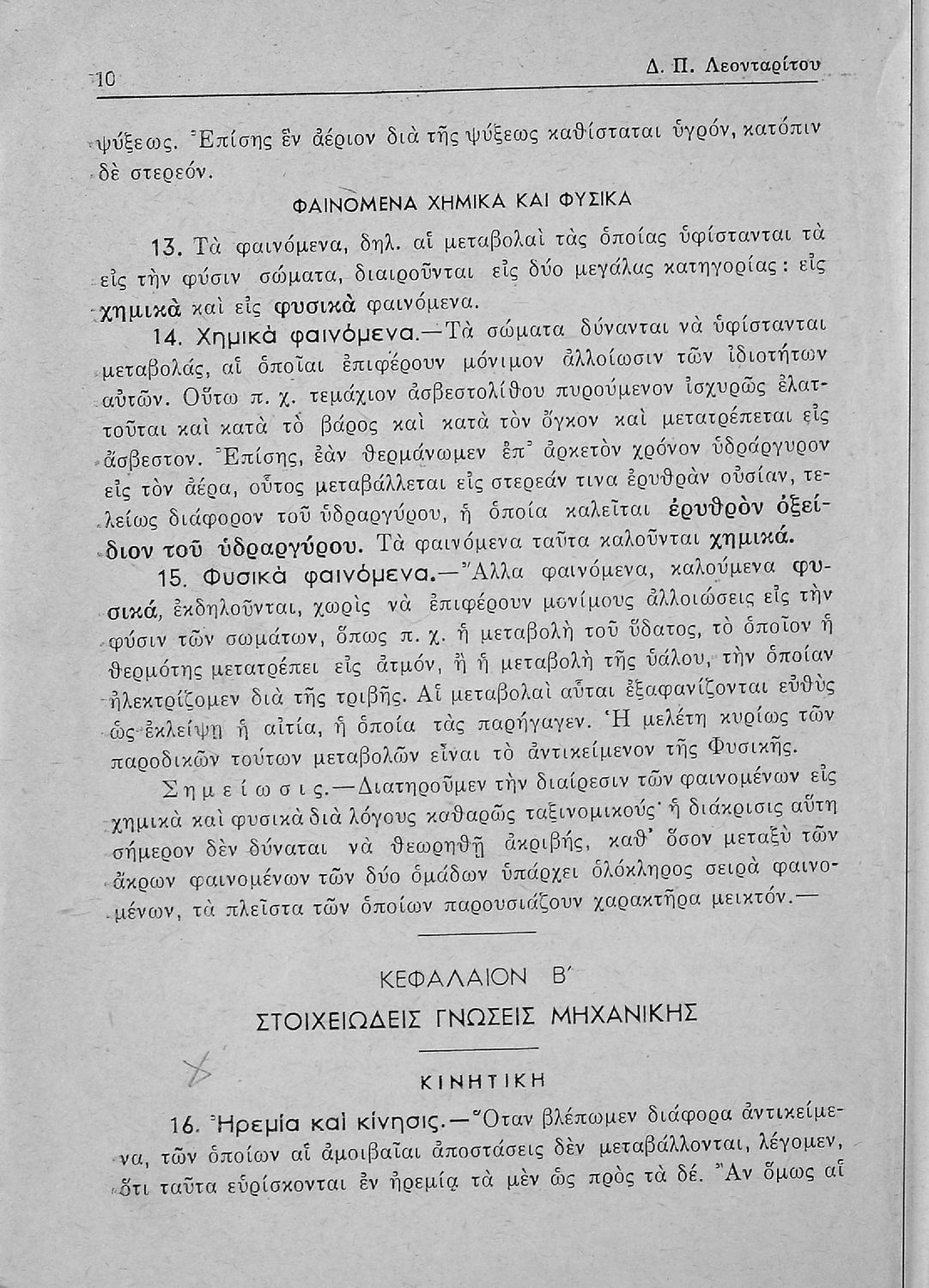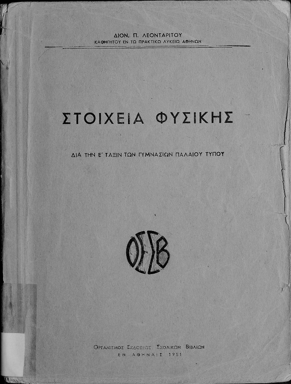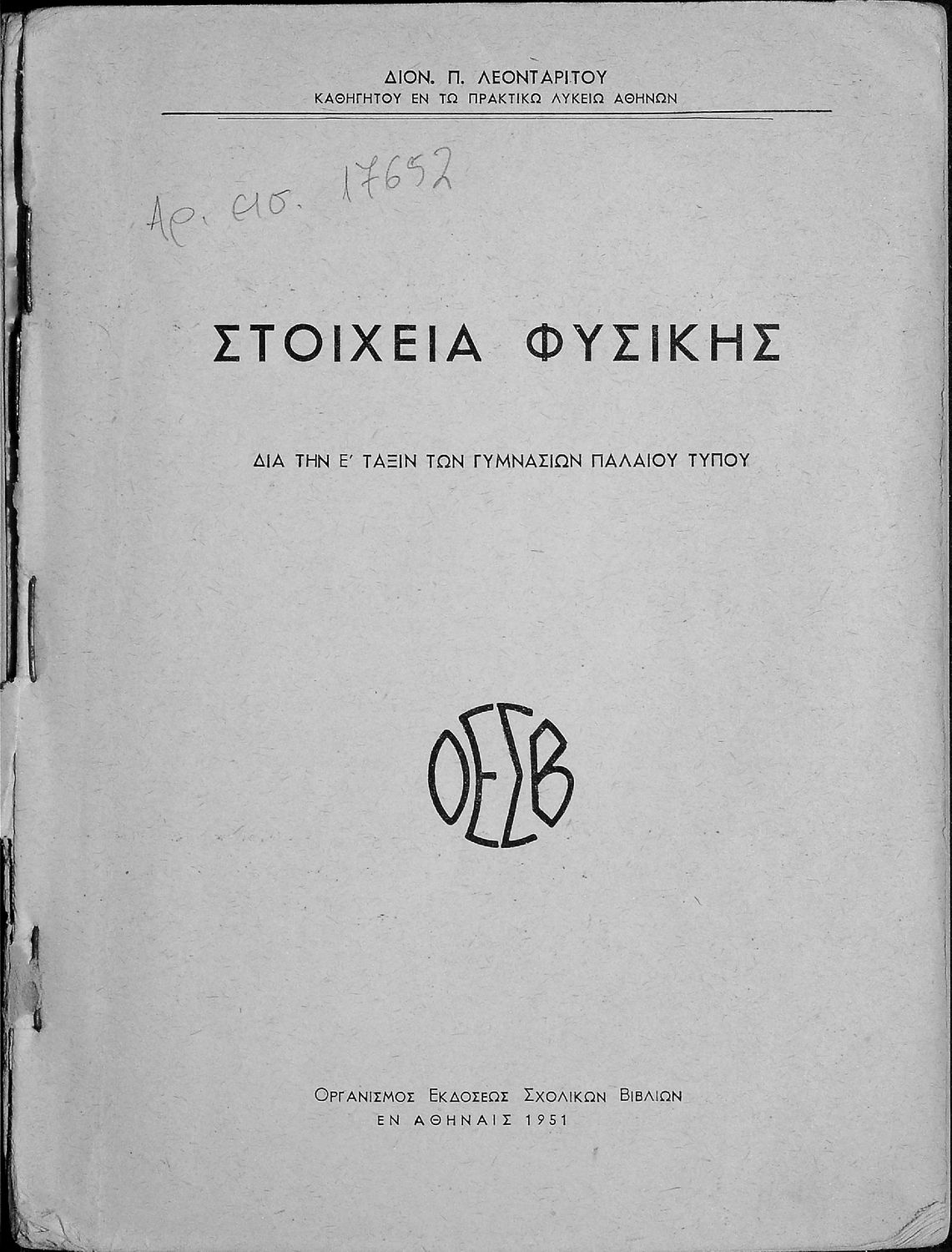 Κωδικός αναγνώρισης: 01-17652 Τίτλος: Στοιχεία Φυσικής δια την Ε΄ Τάξιν των Γυμνασίων Παλαιού Τύπου Συγγραφέας: Διον. Π. Λεονταρίτης Μέγεθος και υπόστρωμα: Σχολικό εγχειρίδιο, μαλακό εξώφυλλο, 254 σελίδες. Σκίτσα, σχεδιαγράμματα (ασπρόμαυρα). |