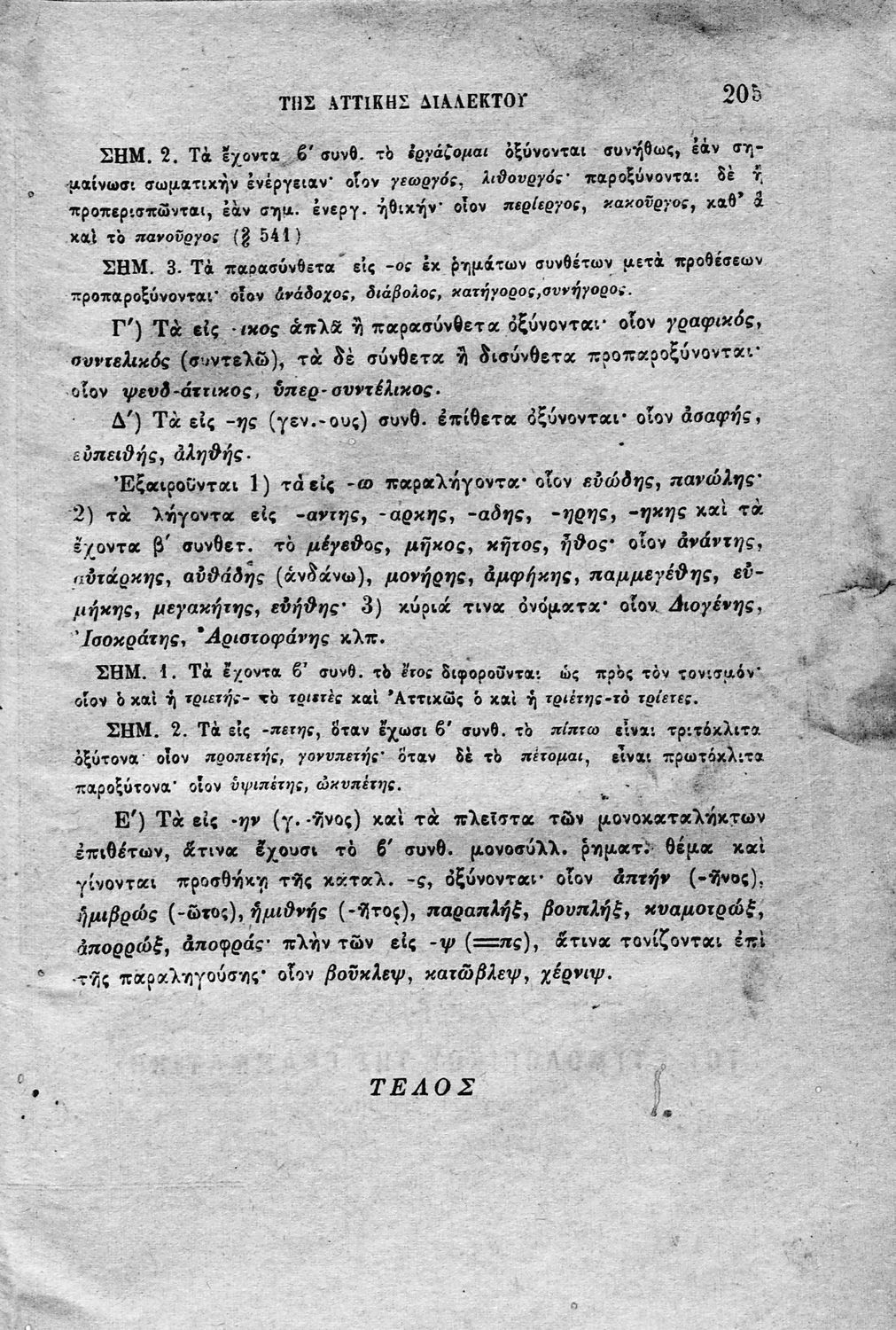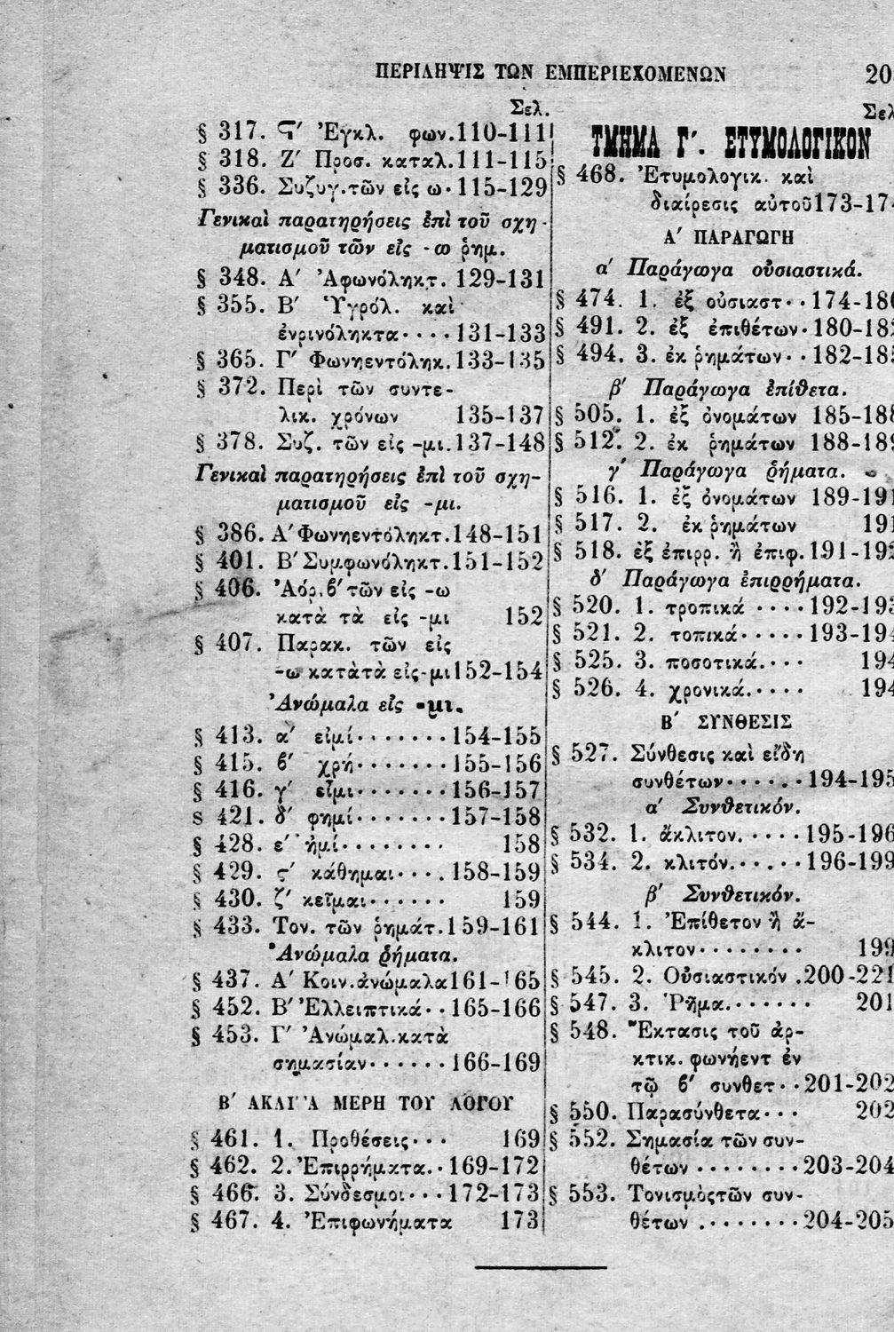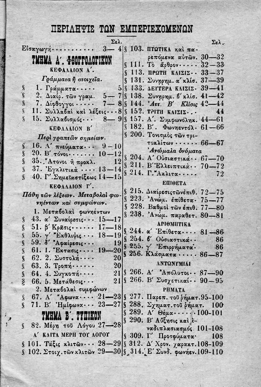 520 ## _aΣχολικό εγχειρίδιο Αρχαίων Ελληνικών για τα Ελληνικά Σχολεία, Παρθεναγωγεία και Γυμνάσια που περιέχει τους κανόνες γραμματικής και είναι χωρισμένο σε φθογγολογικό, τυπολογικό και ετυμολογικό μέρος.