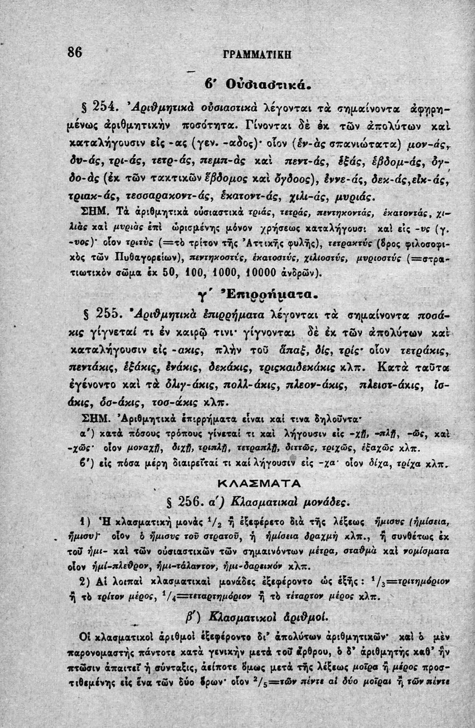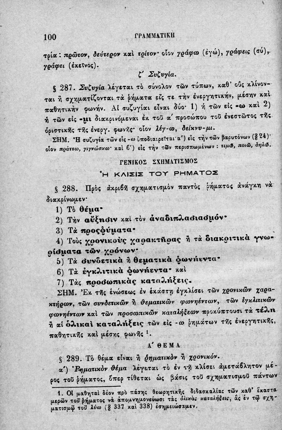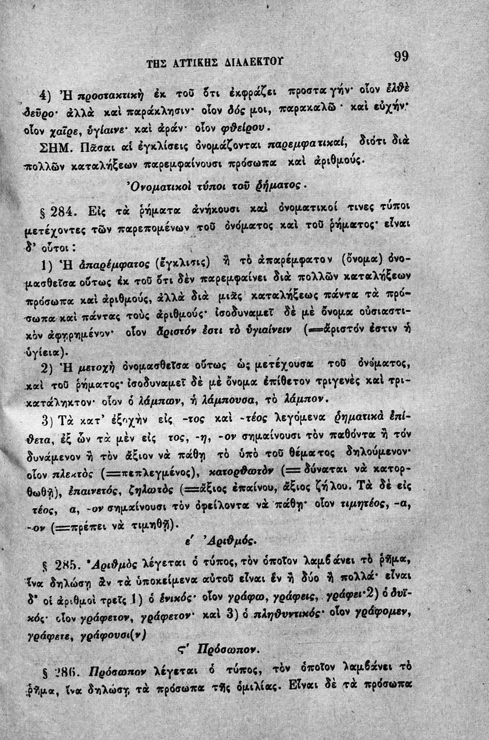 Σχολικό εγχειρίδιο Αρχαίων Ελληνικών για τα Ελληνικά Σχολεία, Παρθεναγωγεία και Γυμνάσια που περιέχει τους κανόνες γραμματικής και είναι χωρισμένο σε φθογγολογικό, τυπολογικό και ετυμολογικό μέρος.