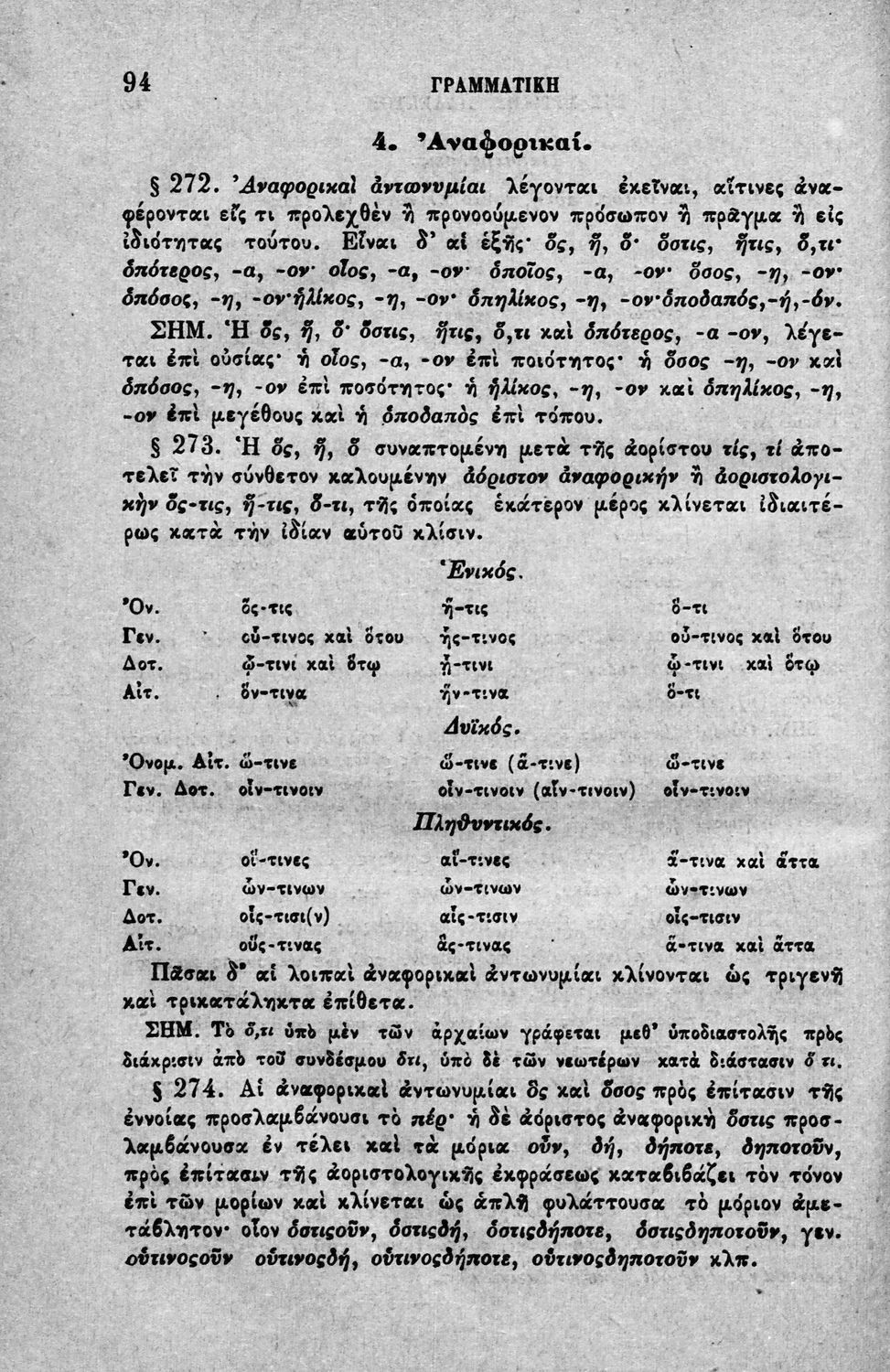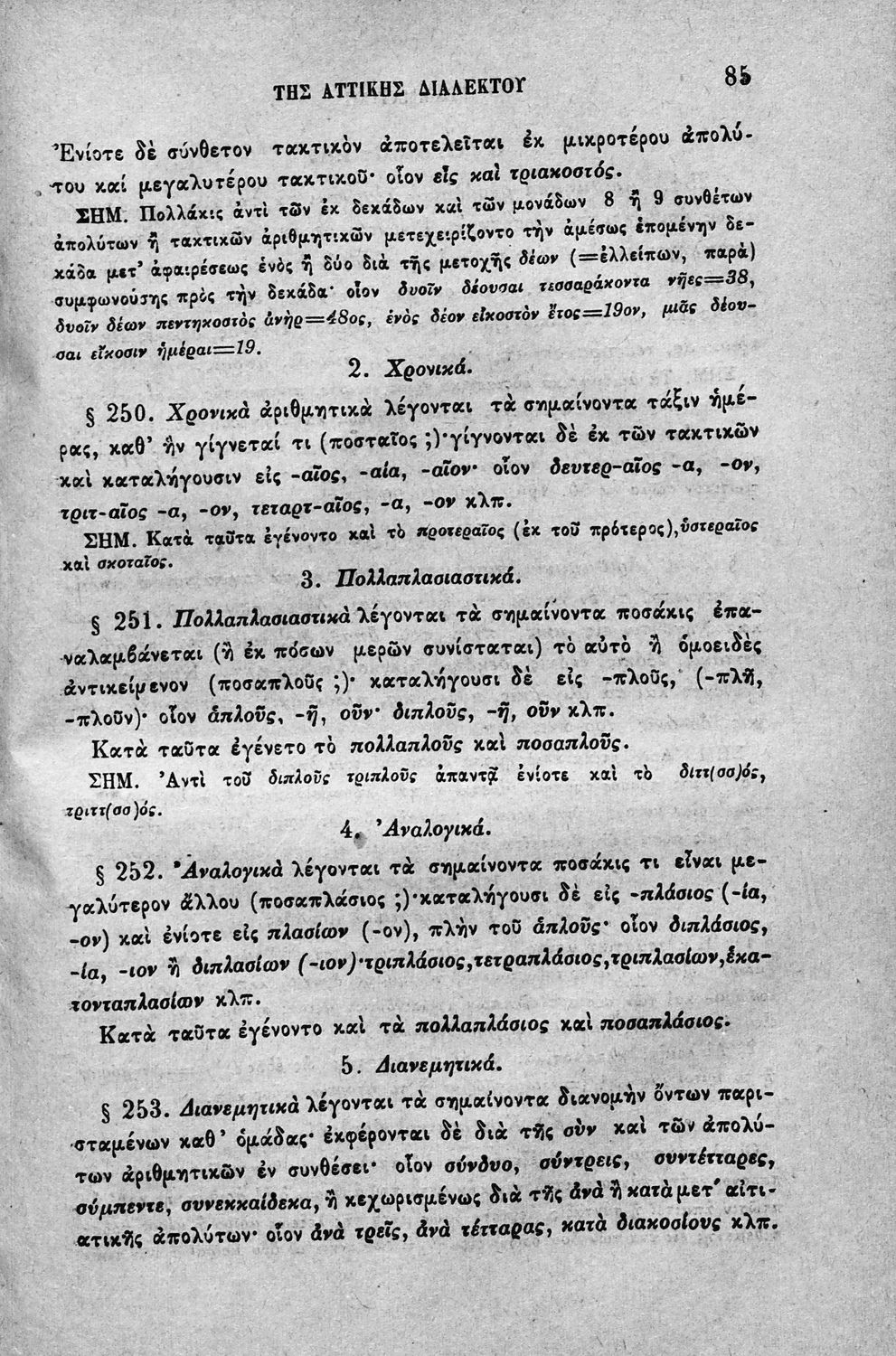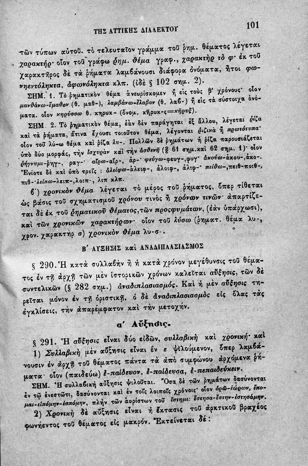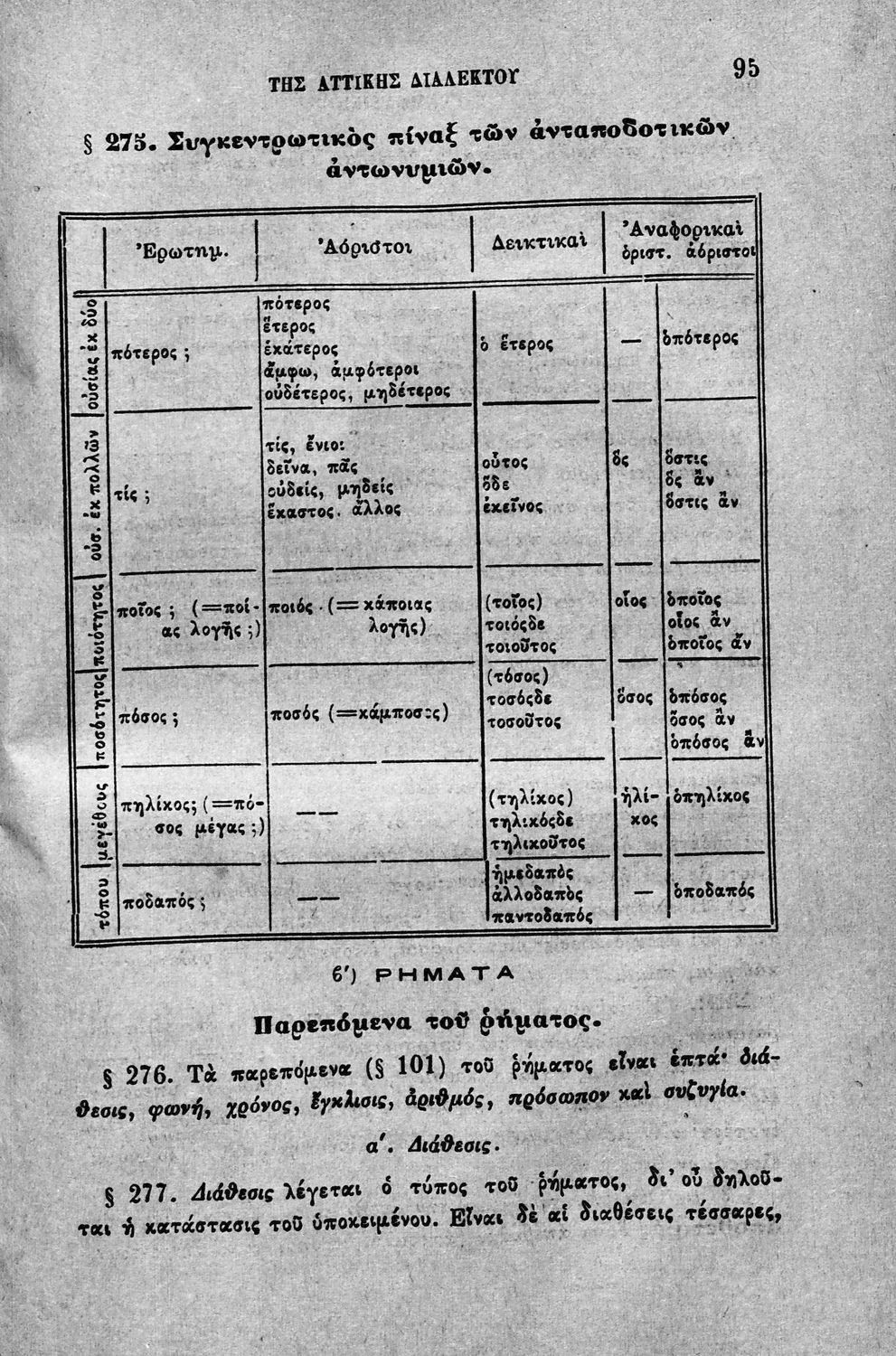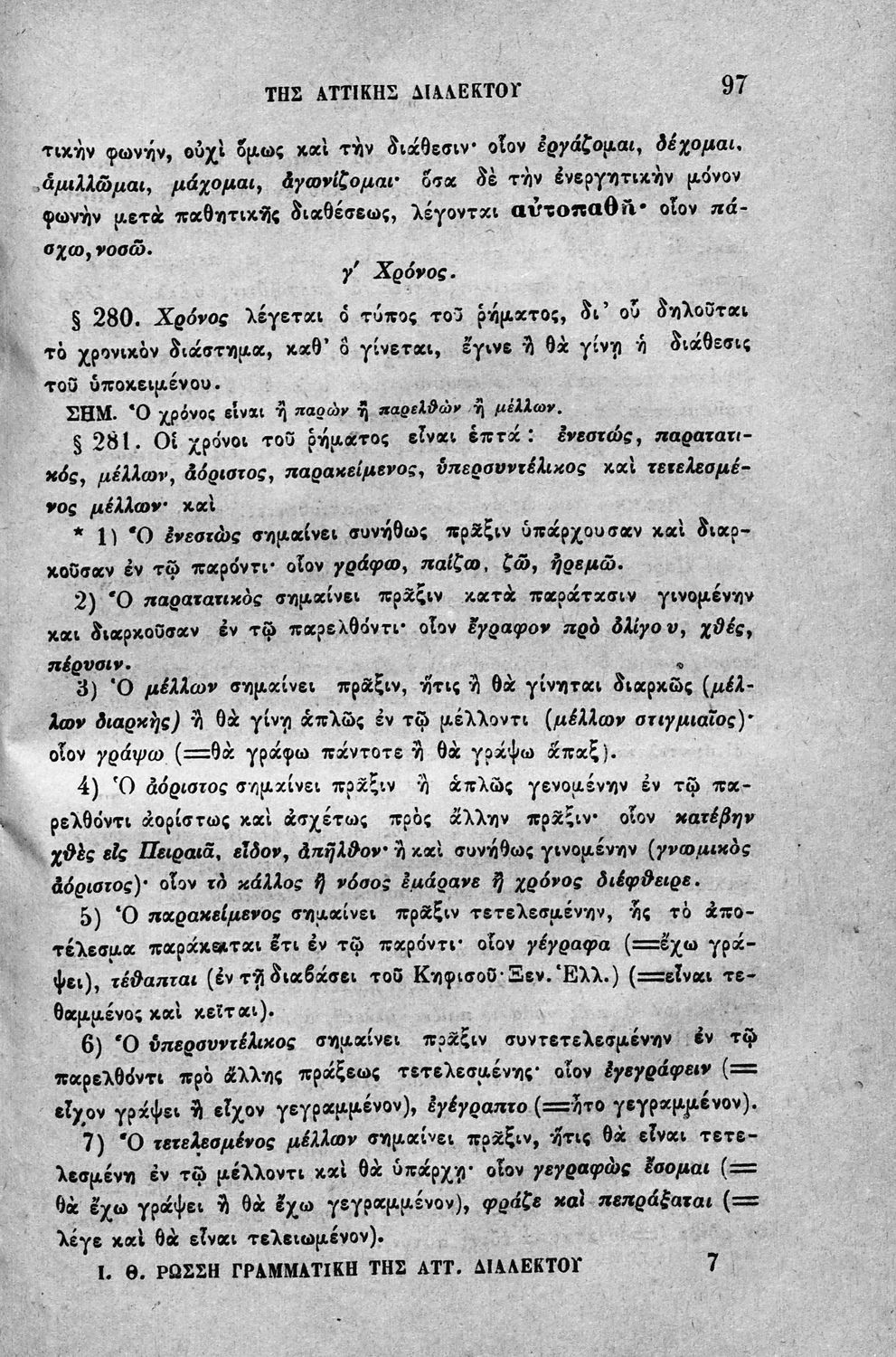 Σχολικό εγχειρίδιο Αρχαίων Ελληνικών για τα Ελληνικά Σχολεία και Παρθεναγωγεία που περιέχει τους κανόνες γραμματικής και είναι χωρισμένο σε φθογγολογικό, τυπολογικό και ετυμολογικό μέρος.