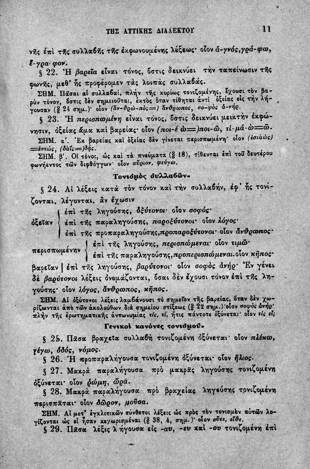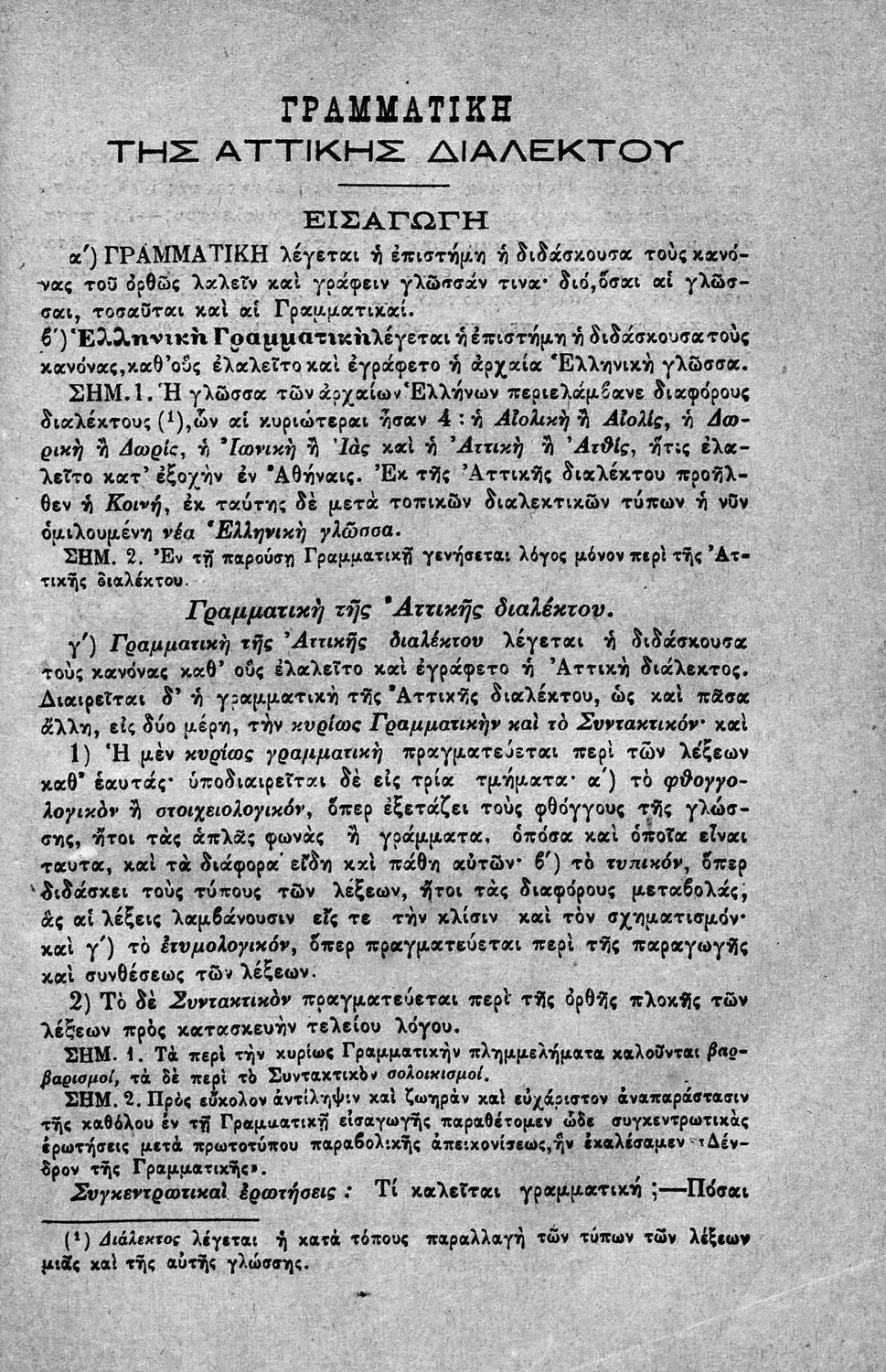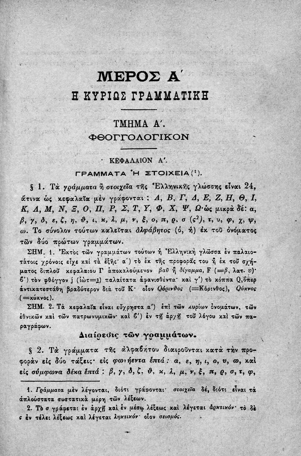 Σχολικό εγχειρίδιο Αρχαίων Ελληνικών για τα Ελληνικά Σχολεία, Παρθεναγωγεία και Γυμνάσια που περιέχει τους κανόνες γραμματικής και είναι χωρισμένο σε φθογγολογικό, τυπολογικό και ετυμολογικό μέρος.