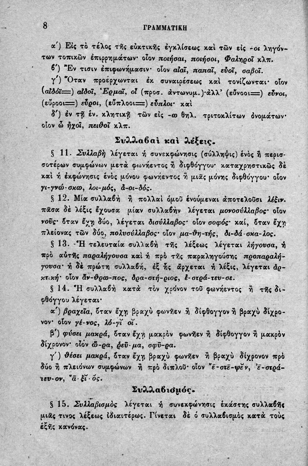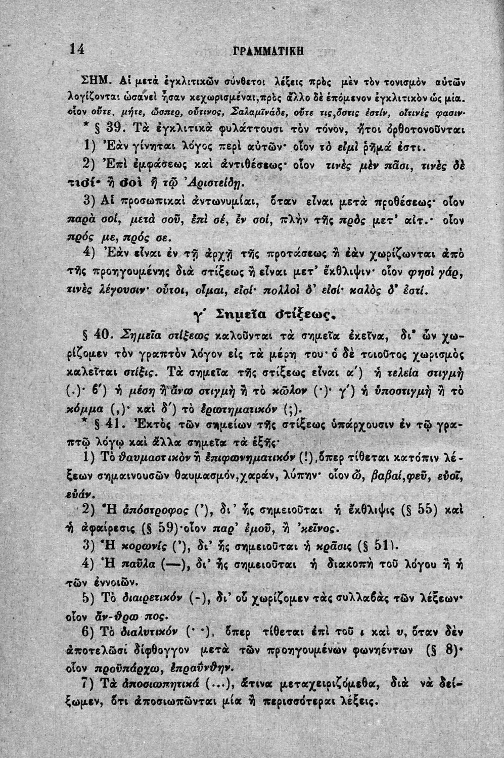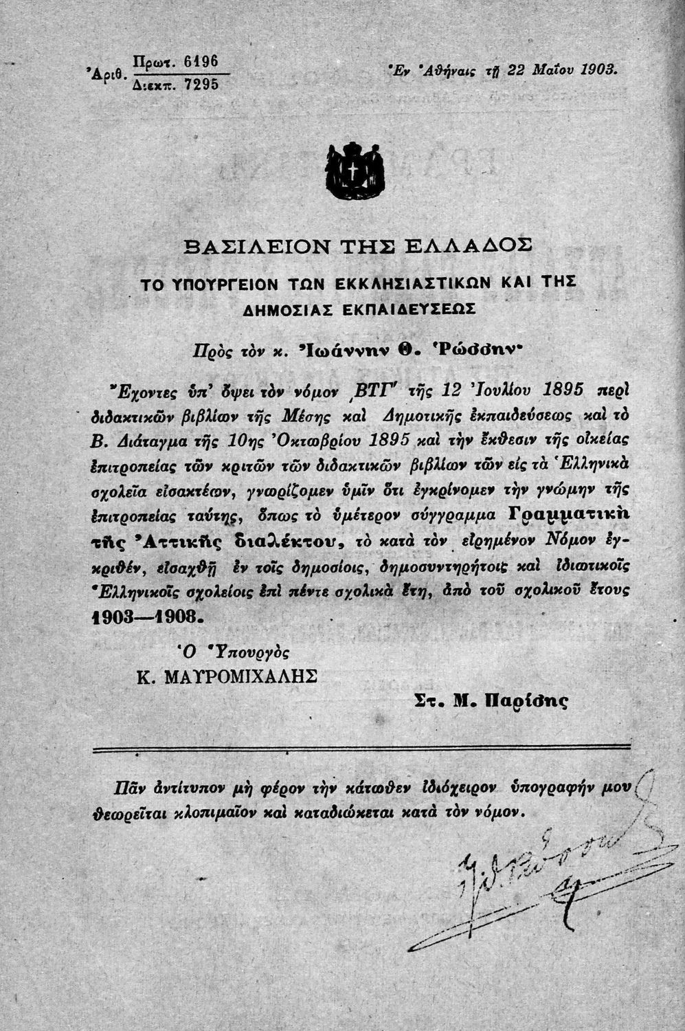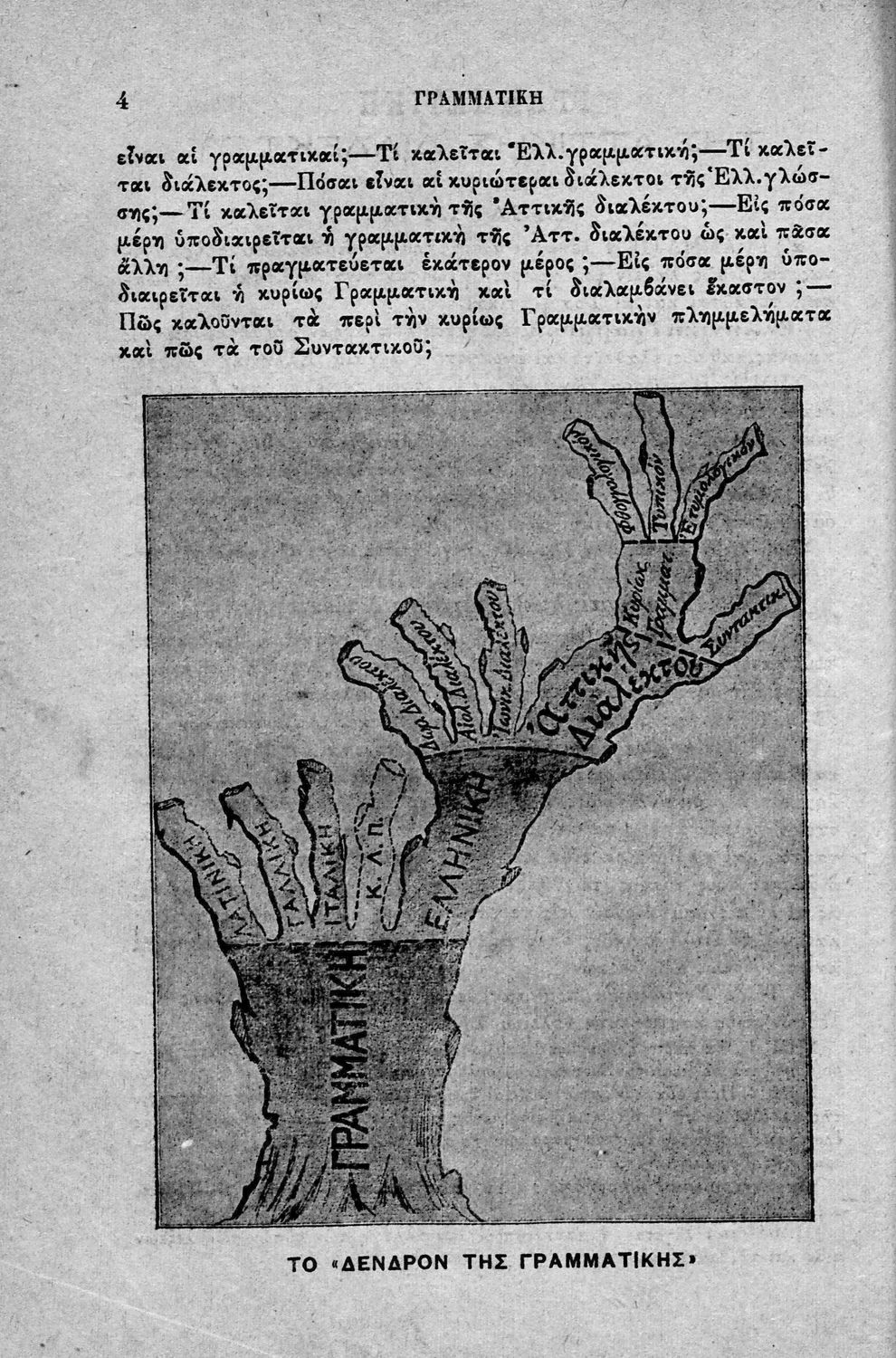 Σχολικό εγχειρίδιο Αρχαίων Ελληνικών για τα Ελληνικά Σχολεία και Παρθεναγωγεία που περιέχει τους κανόνες γραμματικής και είναι χωρισμένο σε φθογγολογικό, τυπολογικό και ετυμολογικό μέρος.