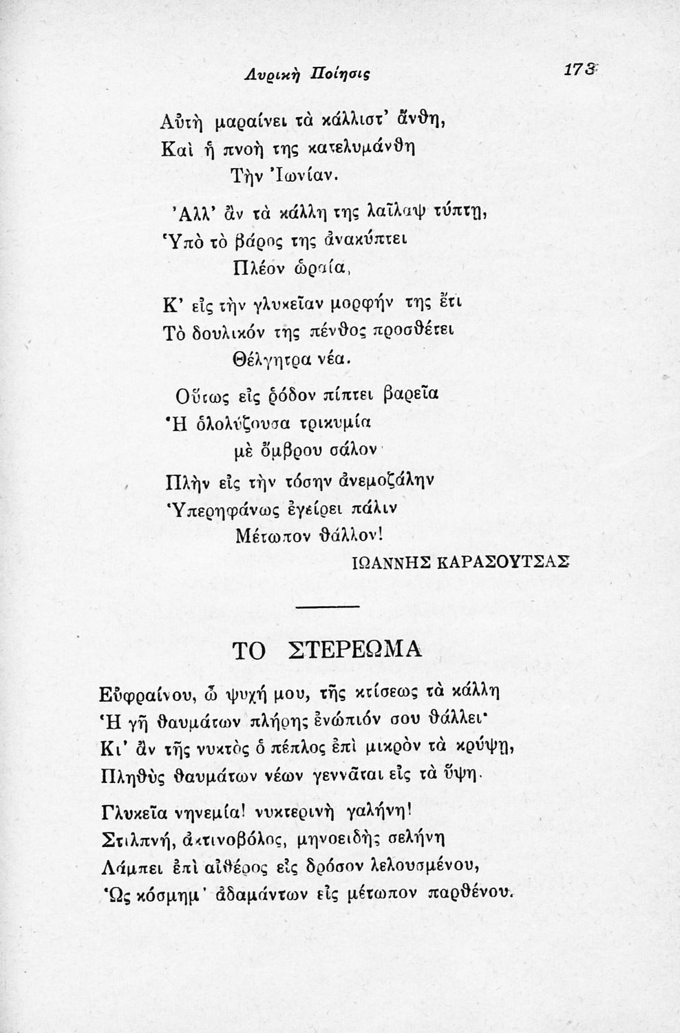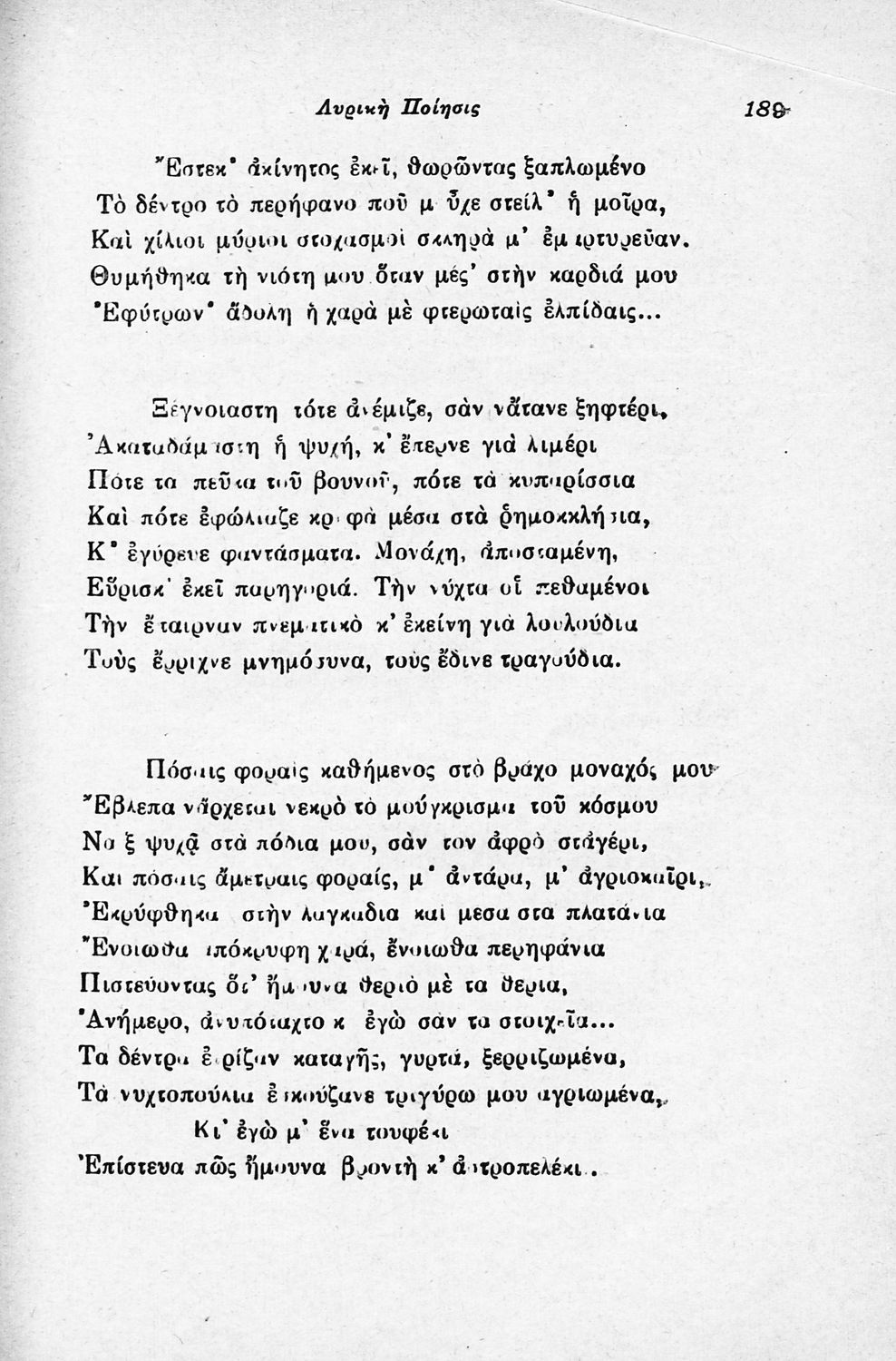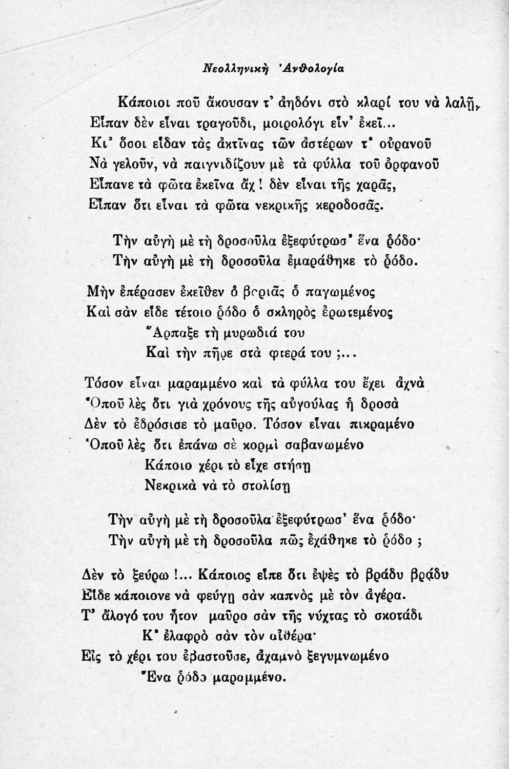 Σχολικό εγχειρίδιο Νέων Ελληνικών για τις τρεις τάξεις των Διδασκαλείων και Γ΄, Δ΄ Γυμνασίου. Ανθολόγιο νεοελληνικής ποίησης με αποσπάσματα από επικά, λυρικά και δραματικά ποιήματα. Περιέχει παράρτημα δυσνόητων λέξεων και βιογραφίες των ποιητών. Η θεματολογία είναι γύρω από την οικογενειακή ζωή και τα ιστορικά γεγονότα της χώρας.