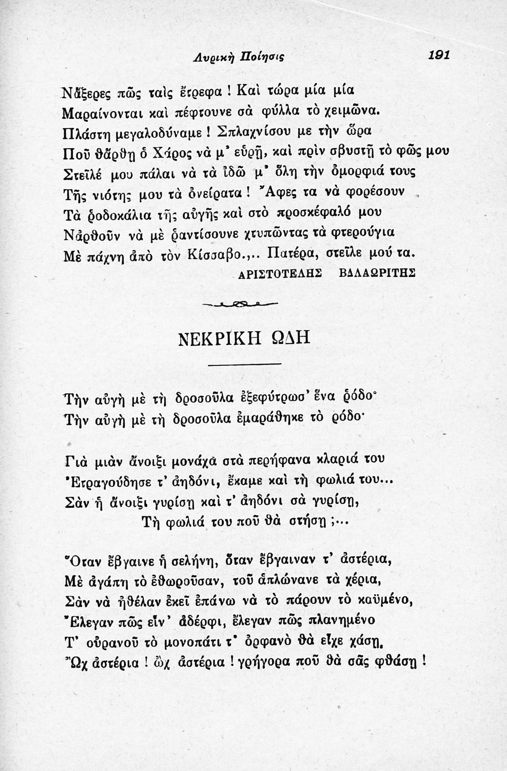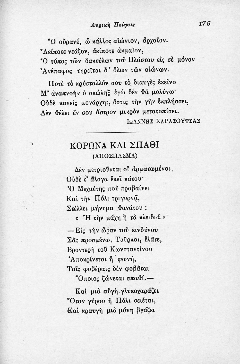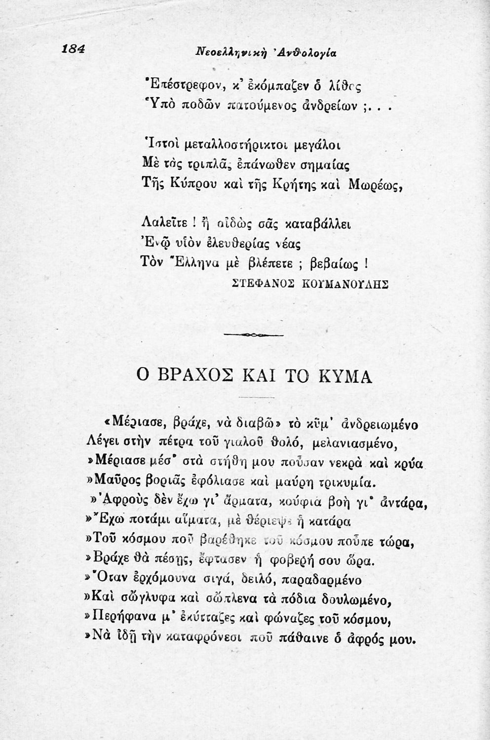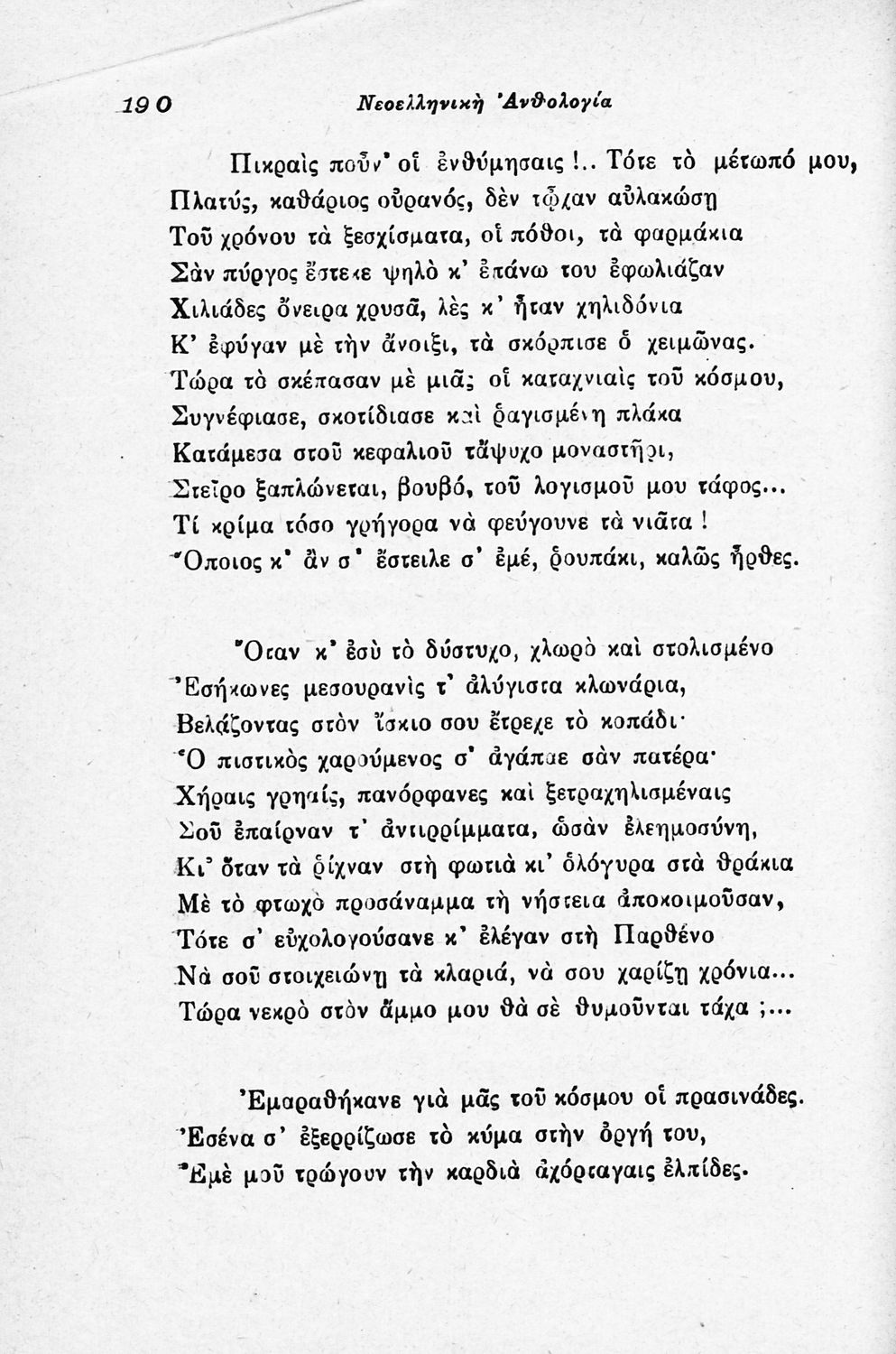 Σχολικό εγχειρίδιο Νέων Ελληνικών για τις τρεις τάξεις των Διδασκαλείων και Γ΄, Δ΄ Γυμνασίου. Ανθολόγιο νεοελληνικής ποίησης με αποσπάσματα από επικά, λυρικά και δραματικά ποιήματα. Περιέχει παράρτημα δυσνόητων λέξεων και βιογραφίες των ποιητών. Η θεματολογία είναι γύρω από την οικογενειακή ζωή και τα ιστορικά γεγονότα της χώρας.