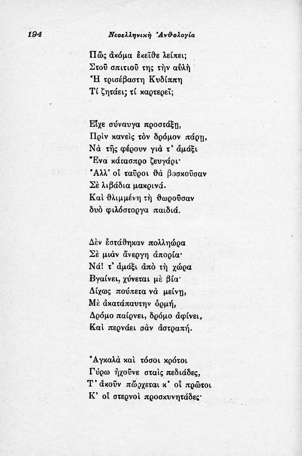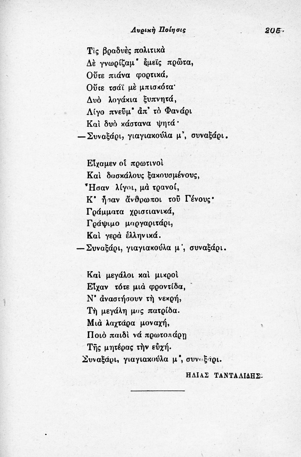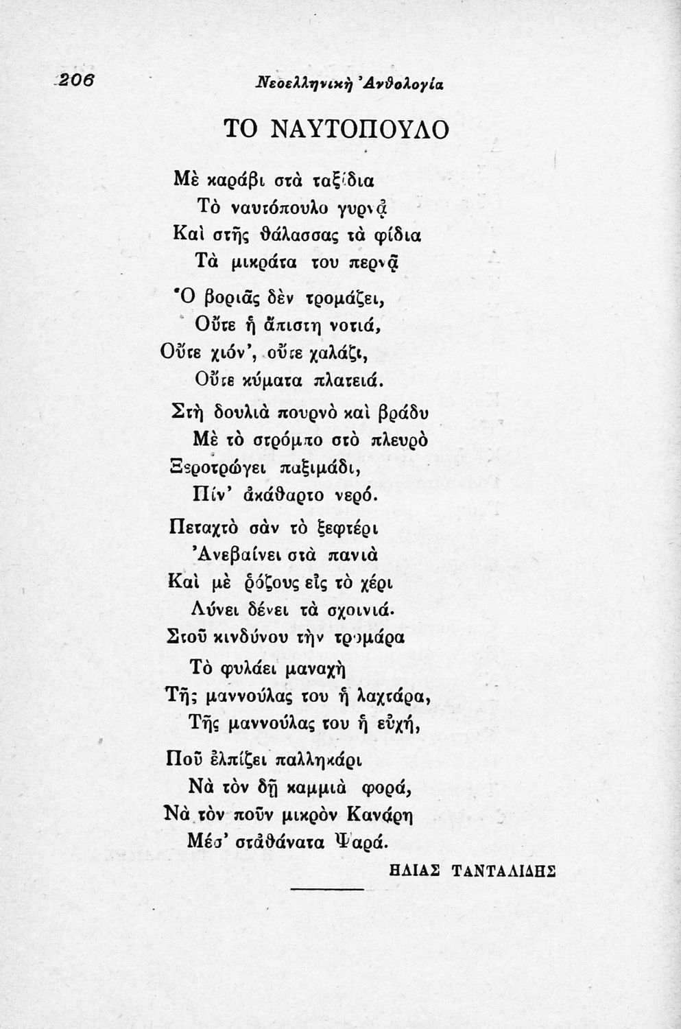 Σχολικό εγχειρίδιο Νέων Ελληνικών για τις τρεις τάξεις των Διδασκαλείων και Γ΄, Δ΄ Γυμνασίου. Ανθολόγιο νεοελληνικής ποίησης με αποσπάσματα από επικά, λυρικά και δραματικά ποιήματα. Περιέχει παράρτημα δυσνόητων λέξεων και βιογραφίες των ποιητών. Η θεματολογία είναι γύρω από την οικογενειακή ζωή και τα ιστορικά γεγονότα της χώρας.