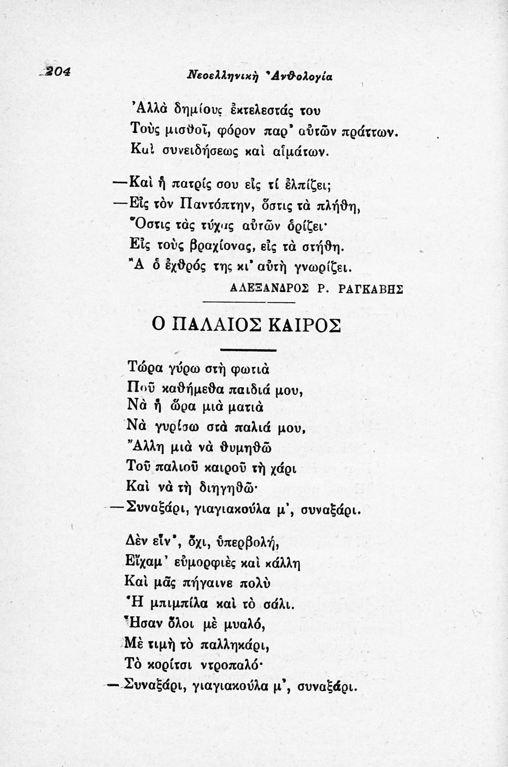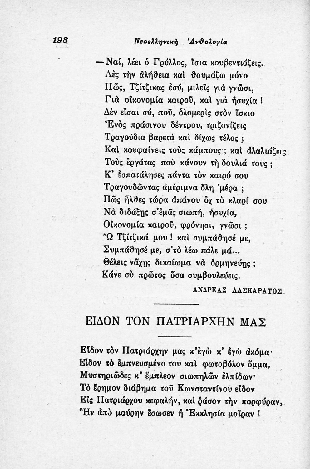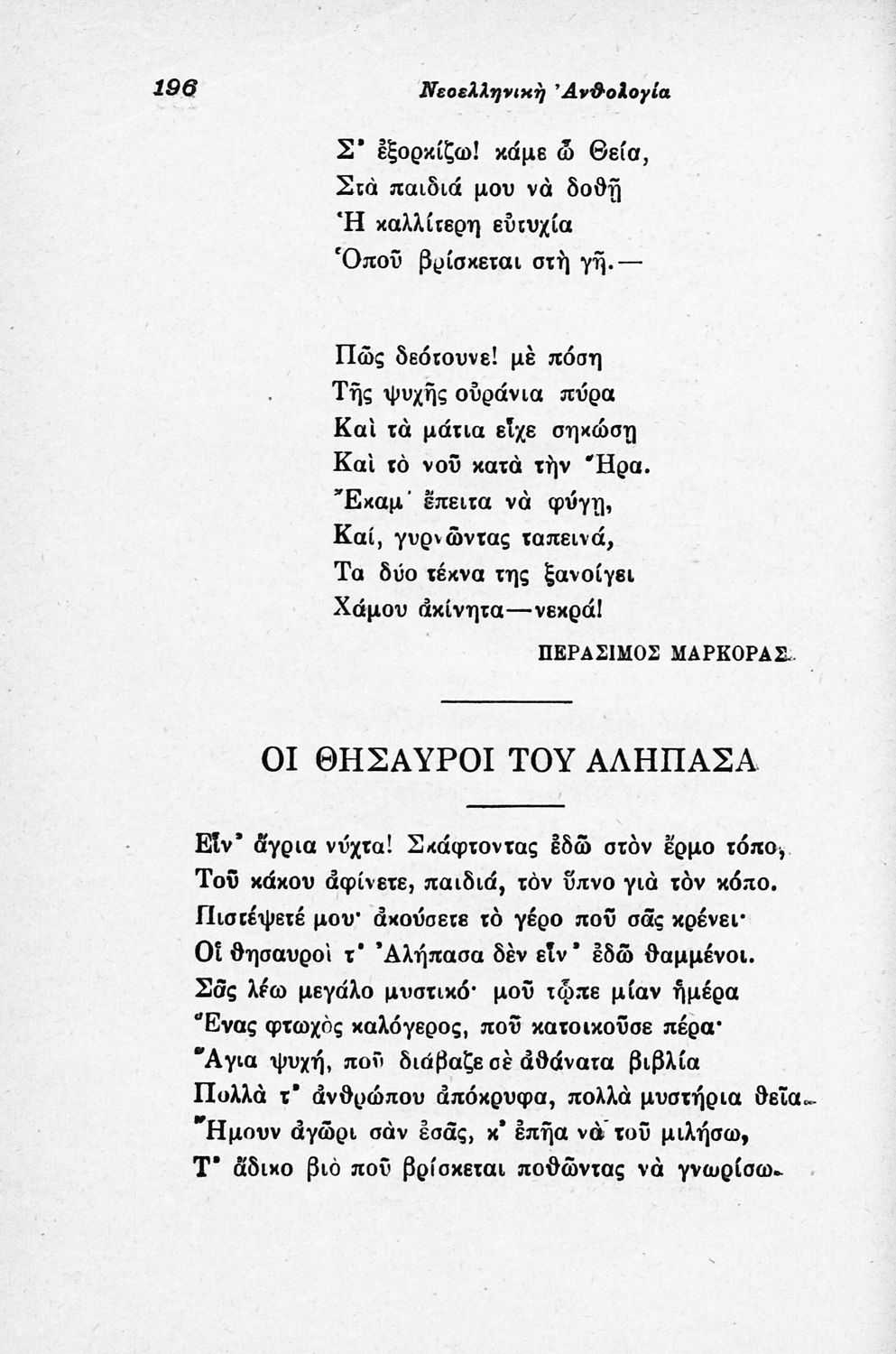 Σχολικό εγχειρίδιο Νέων Ελληνικών για τις τρεις τάξεις των Διδασκαλείων και Γ΄, Δ΄ Γυμνασίου. Ανθολόγιο νεοελληνικής ποίησης με αποσπάσματα από επικά, λυρικά και δραματικά ποιήματα. Περιέχει παράρτημα δυσνόητων λέξεων και βιογραφίες των ποιητών. Η θεματολογία είναι γύρω από την οικογενειακή ζωή και τα ιστορικά γεγονότα της χώρας.
