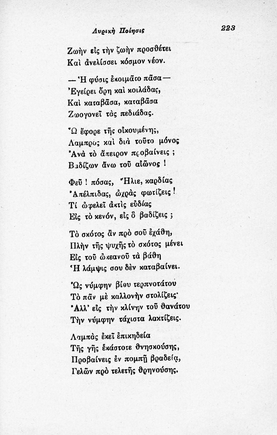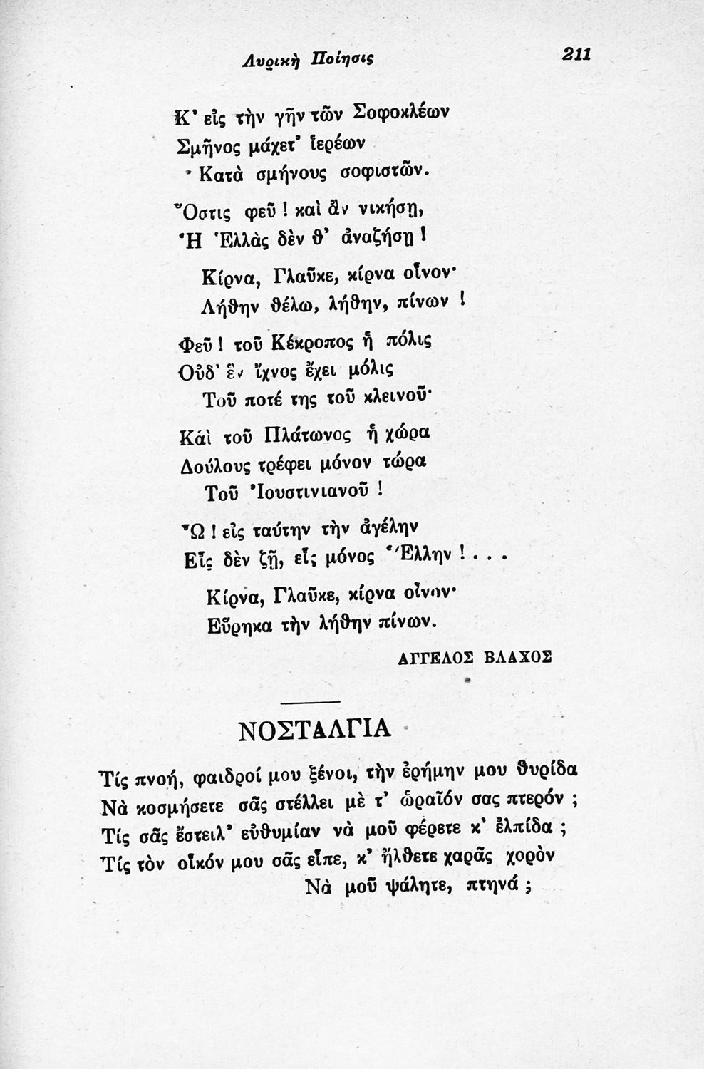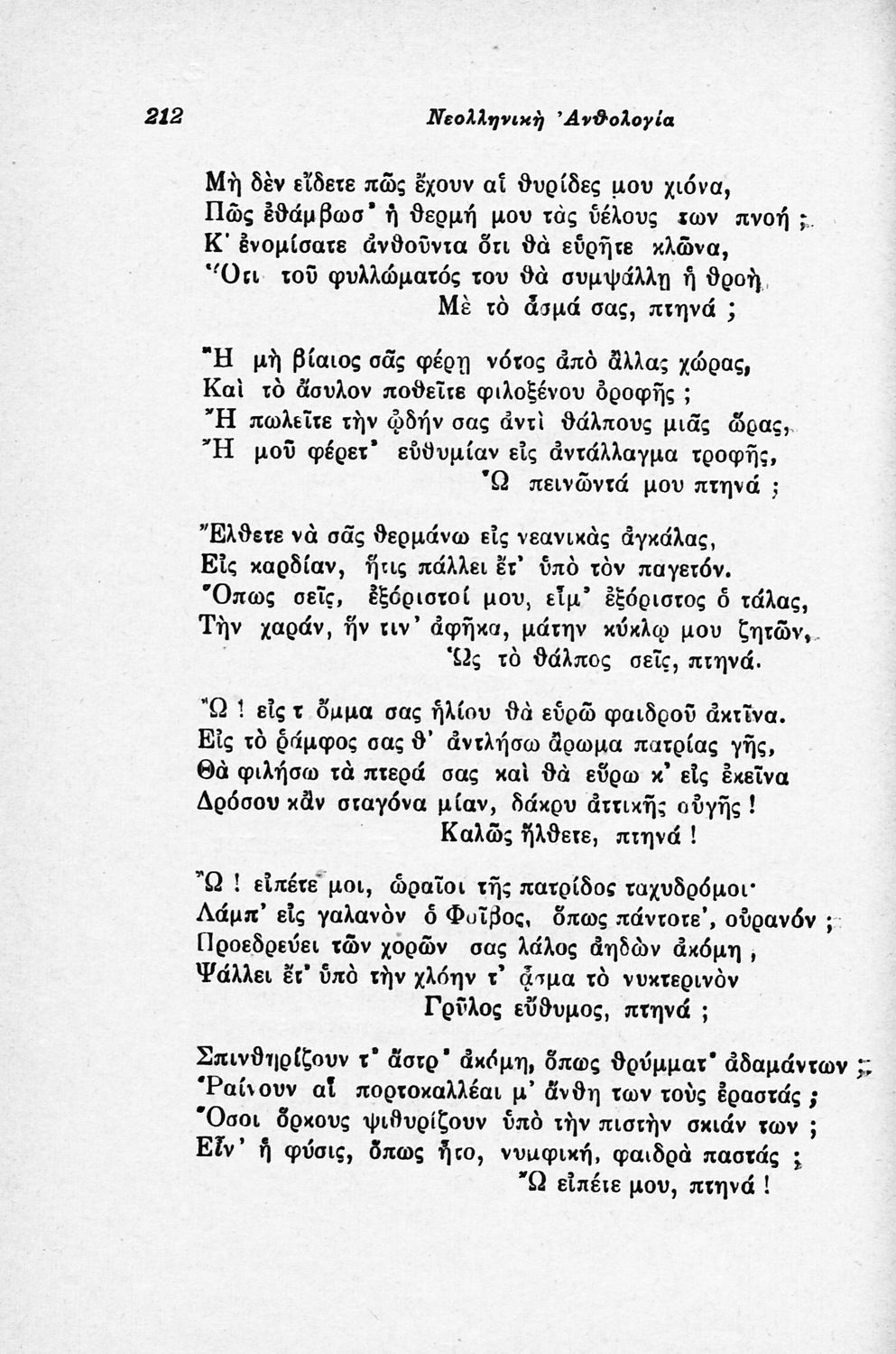 Σχολικό εγχειρίδιο Νέων Ελληνικών για τις τρεις τάξεις των Διδασκαλείων και Γ΄, Δ΄ Γυμνασίου. Ανθολόγιο νεοελληνικής ποίησης με αποσπάσματα από επικά, λυρικά και δραματικά ποιήματα. Περιέχει παράρτημα δυσνόητων λέξεων και βιογραφίες των ποιητών. Η θεματολογία είναι γύρω από την οικογενειακή ζωή και τα ιστορικά γεγονότα της χώρας.