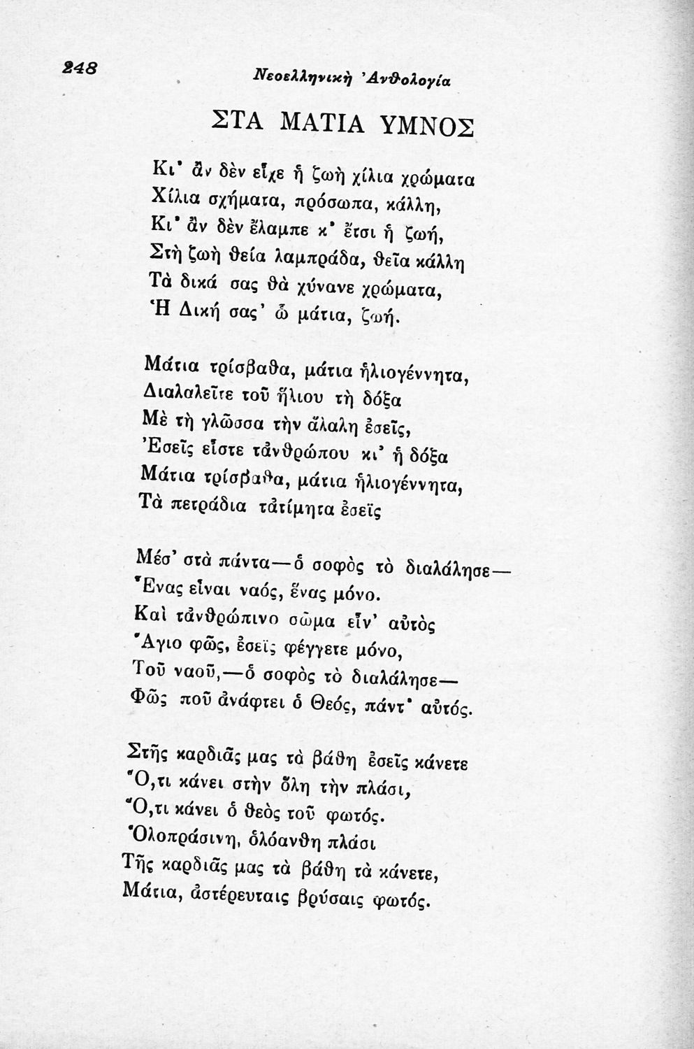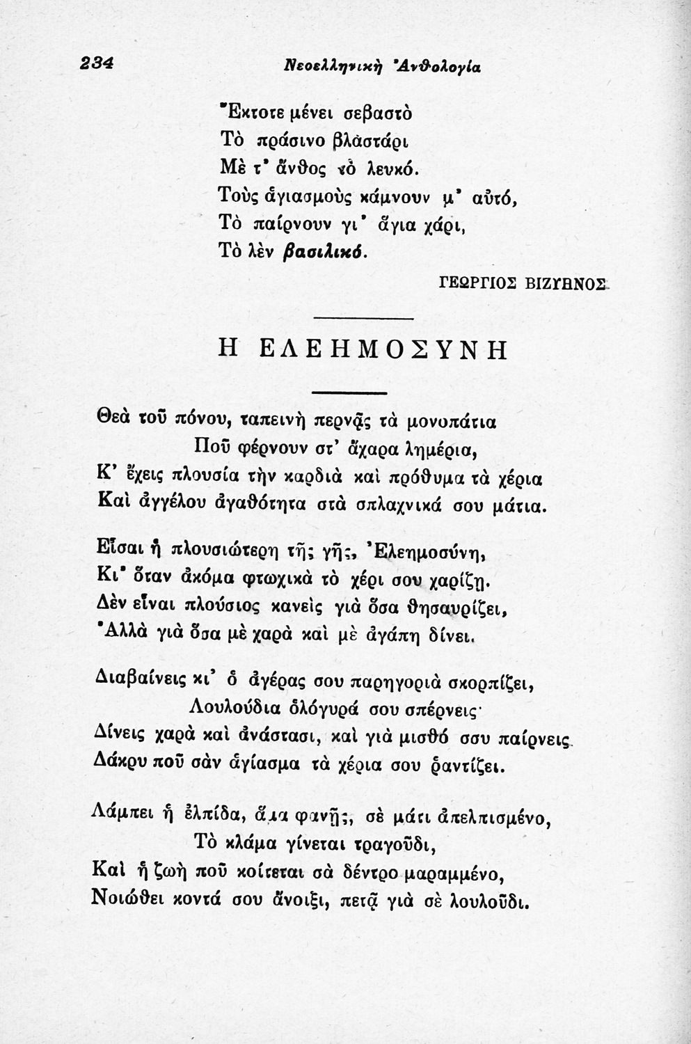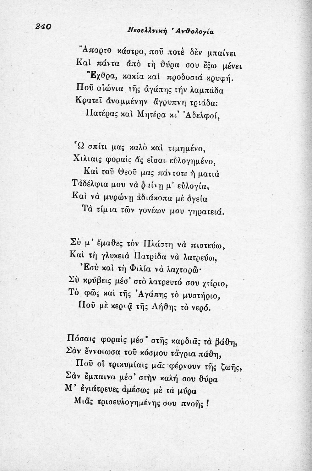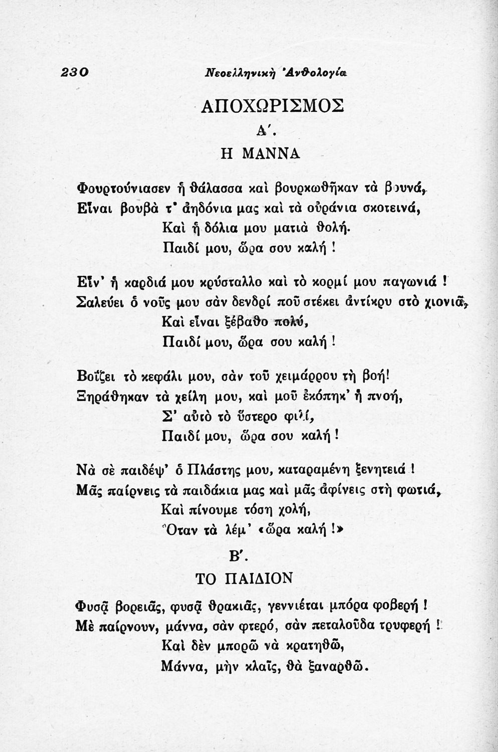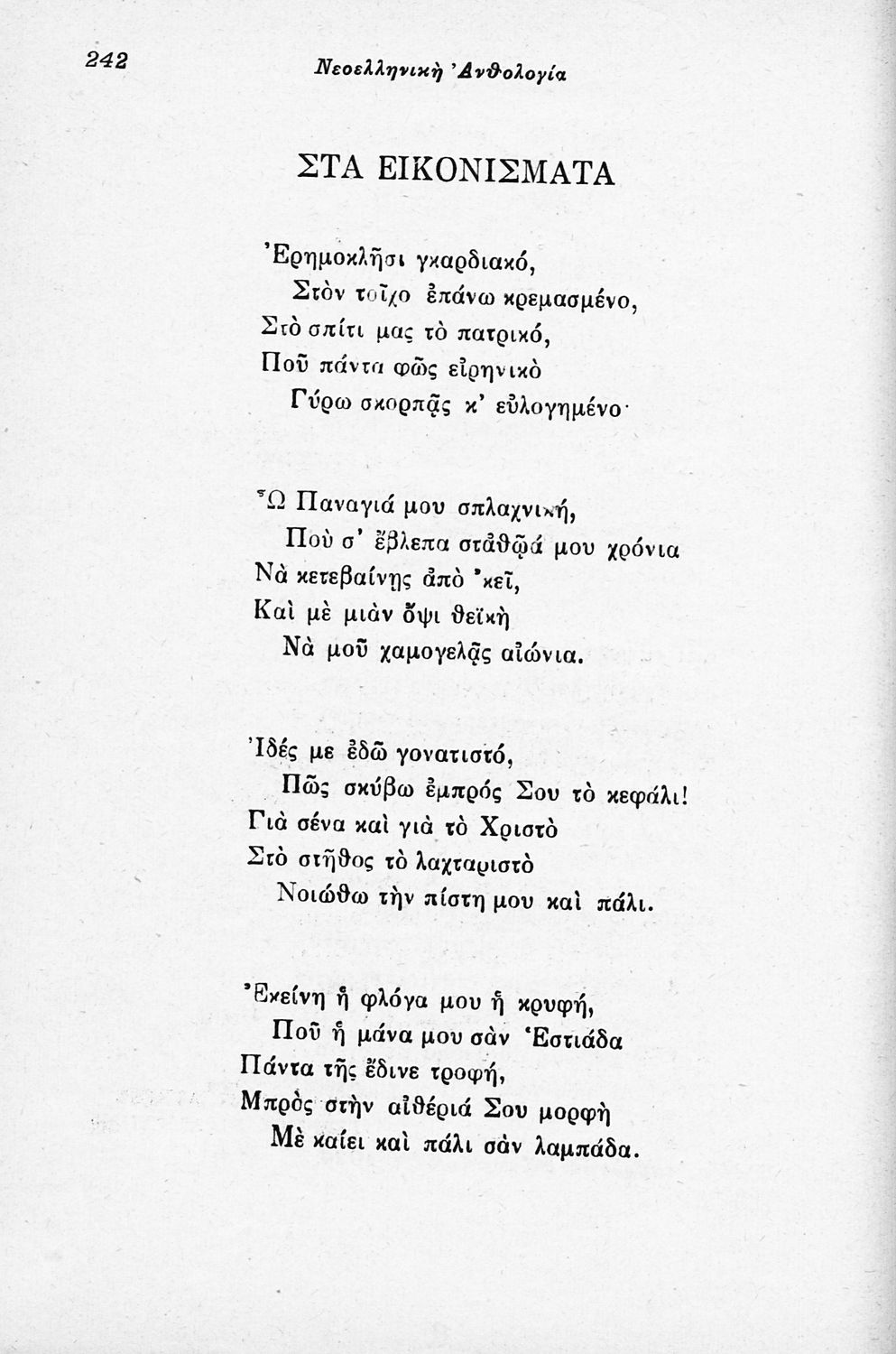 Σχολικό εγχειρίδιο Νέων Ελληνικών για τις τρεις τάξεις των Διδασκαλείων και Γ΄, Δ΄ Γυμνασίου. Ανθολόγιο νεοελληνικής ποίησης με αποσπάσματα από επικά, λυρικά και δραματικά ποιήματα. Περιέχει παράρτημα δυσνόητων λέξεων και βιογραφίες των ποιητών. Η θεματολογία είναι γύρω από την οικογενειακή ζωή και τα ιστορικά γεγονότα της χώρας.
