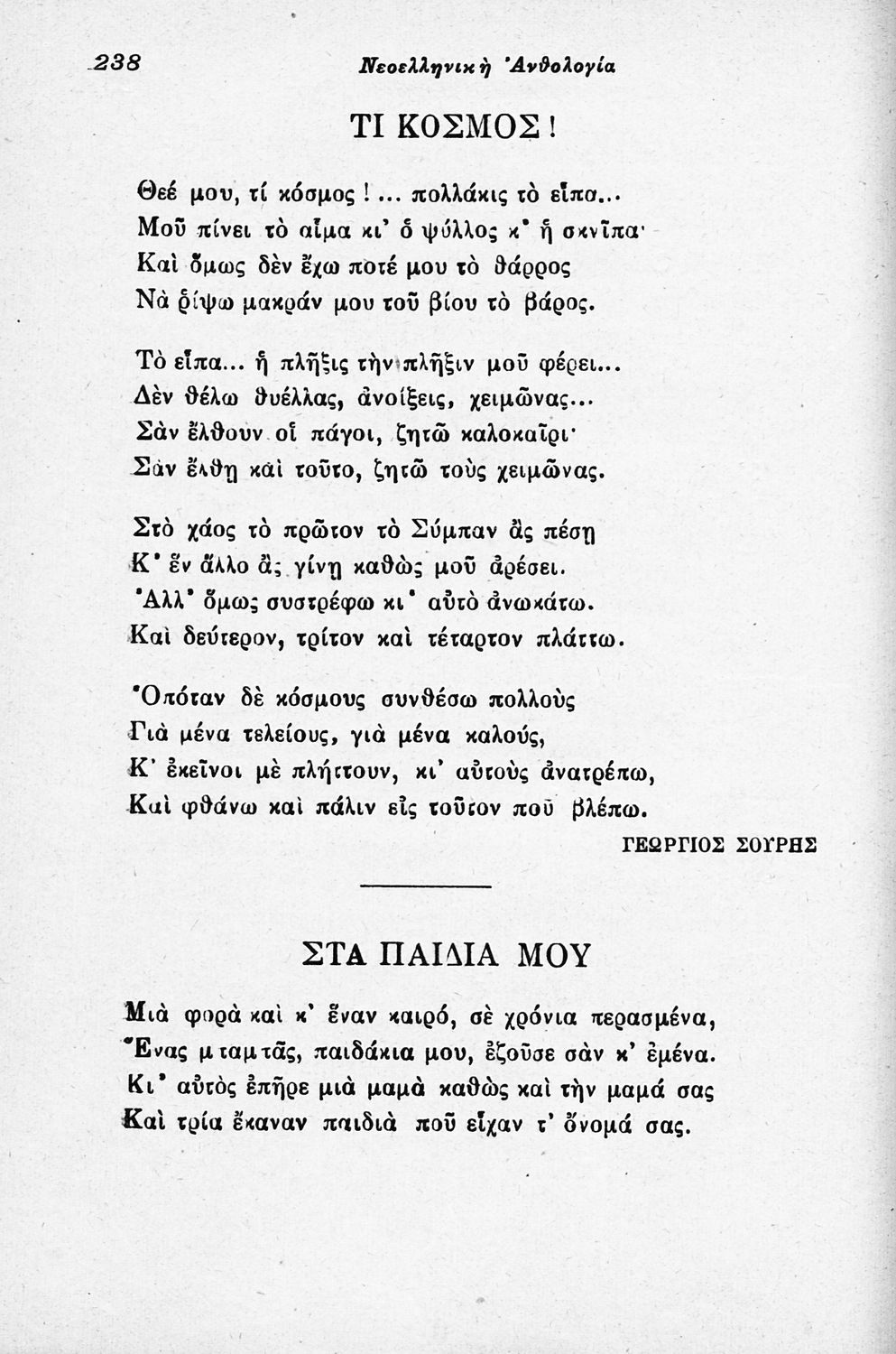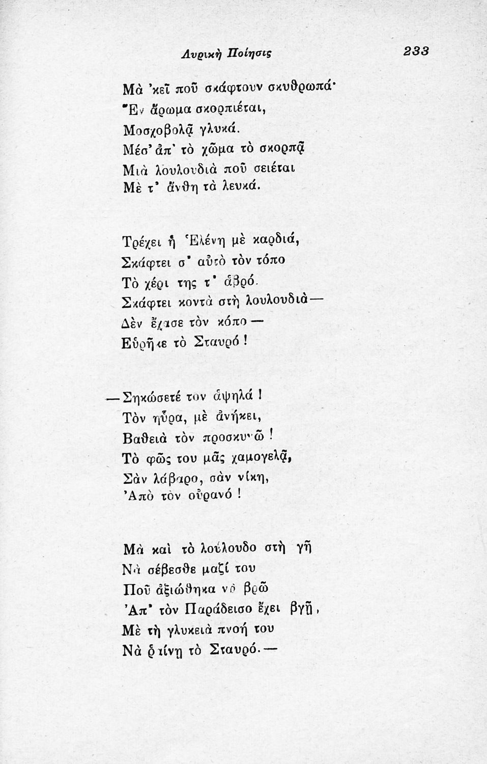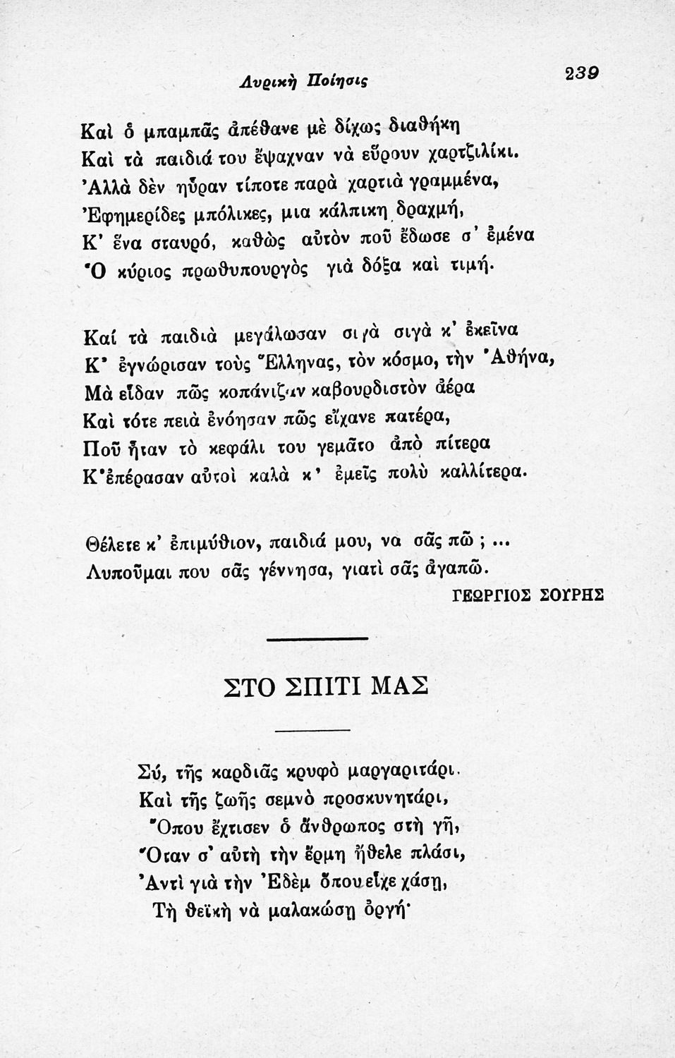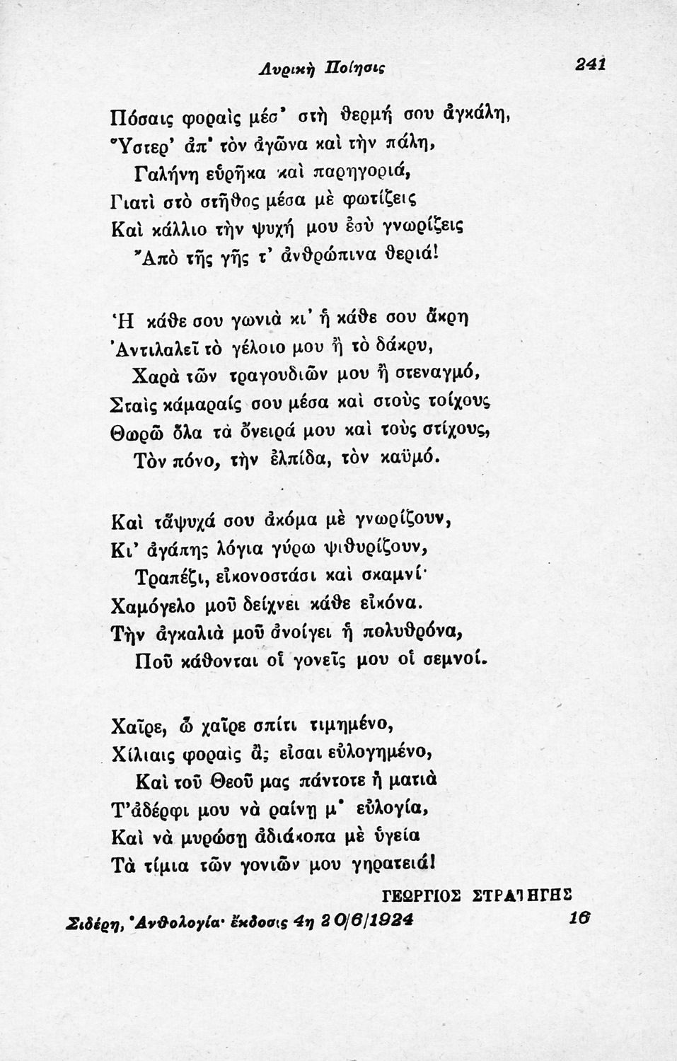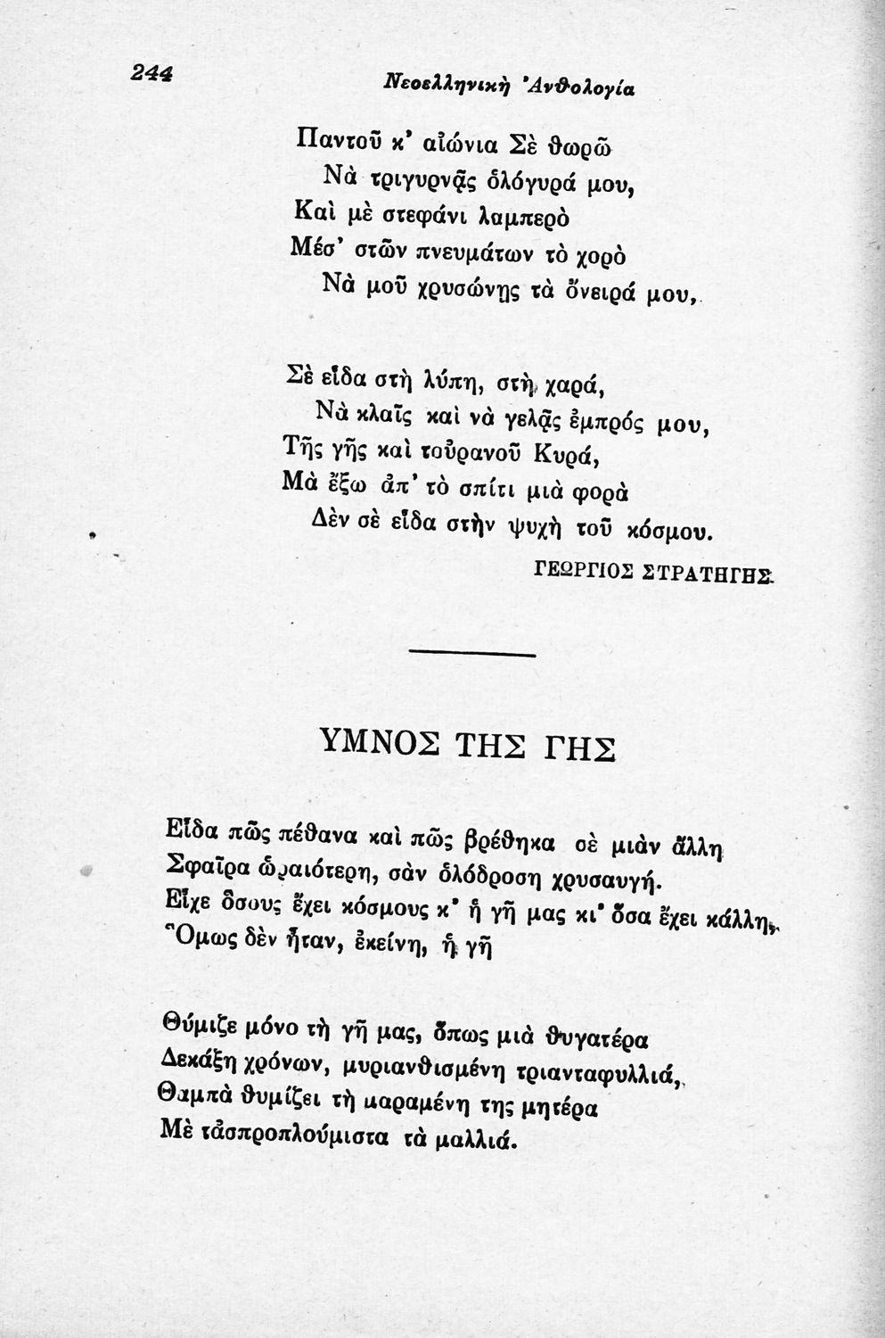 Σχολικό εγχειρίδιο Νέων Ελληνικών για τις τρεις τάξεις των Διδασκαλείων και Γ΄, Δ΄ Γυμνασίου. Ανθολόγιο νεοελληνικής ποίησης με αποσπάσματα από επικά, λυρικά και δραματικά ποιήματα. Περιέχει παράρτημα δυσνόητων λέξεων και βιογραφίες των ποιητών. Η θεματολογία είναι γύρω από την οικογενειακή ζωή και τα ιστορικά γεγονότα της χώρας.