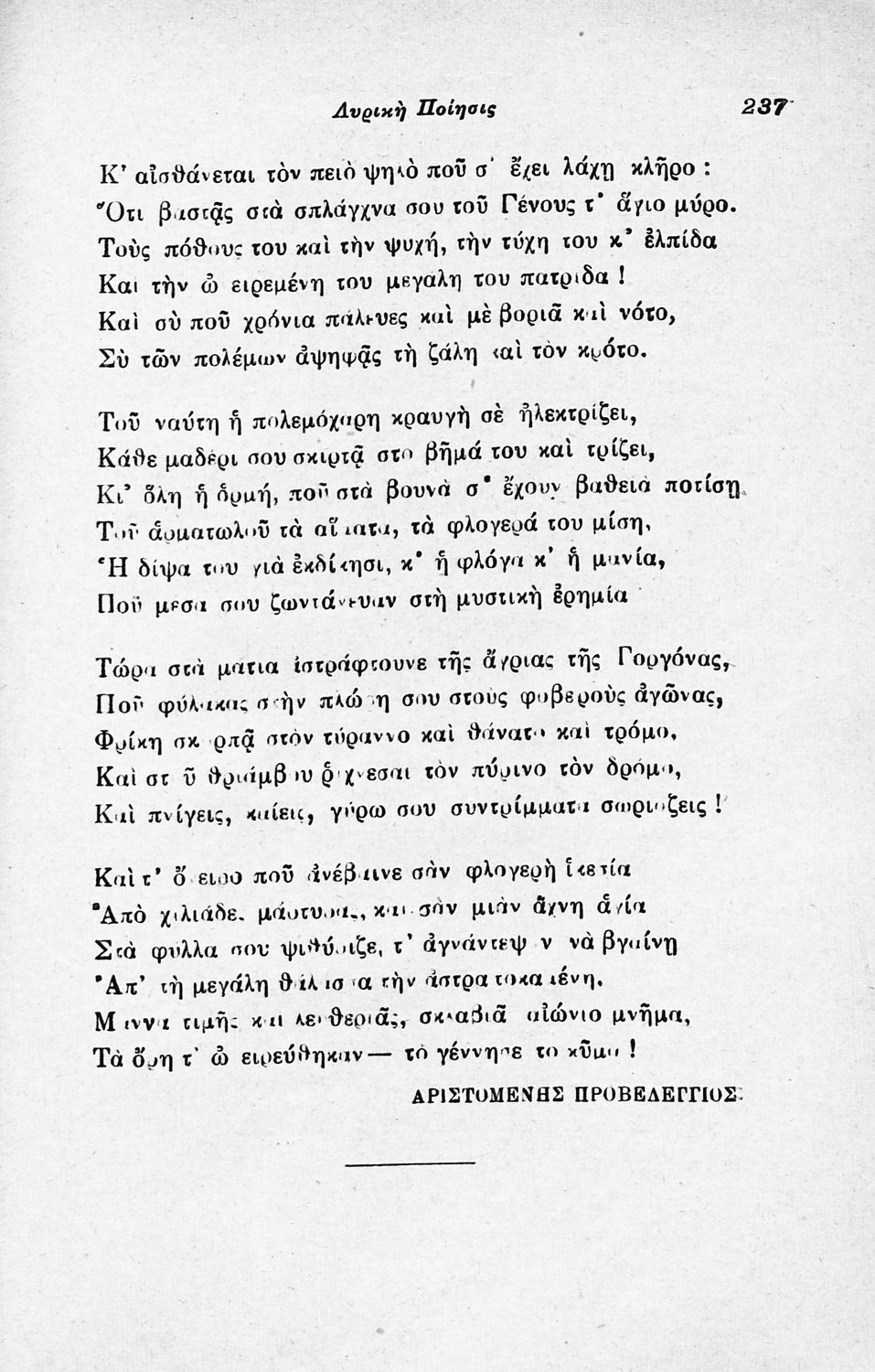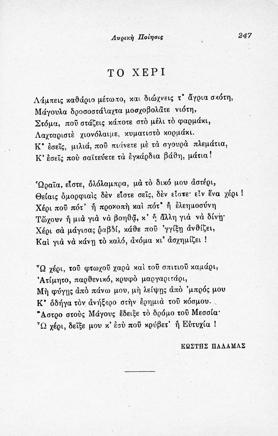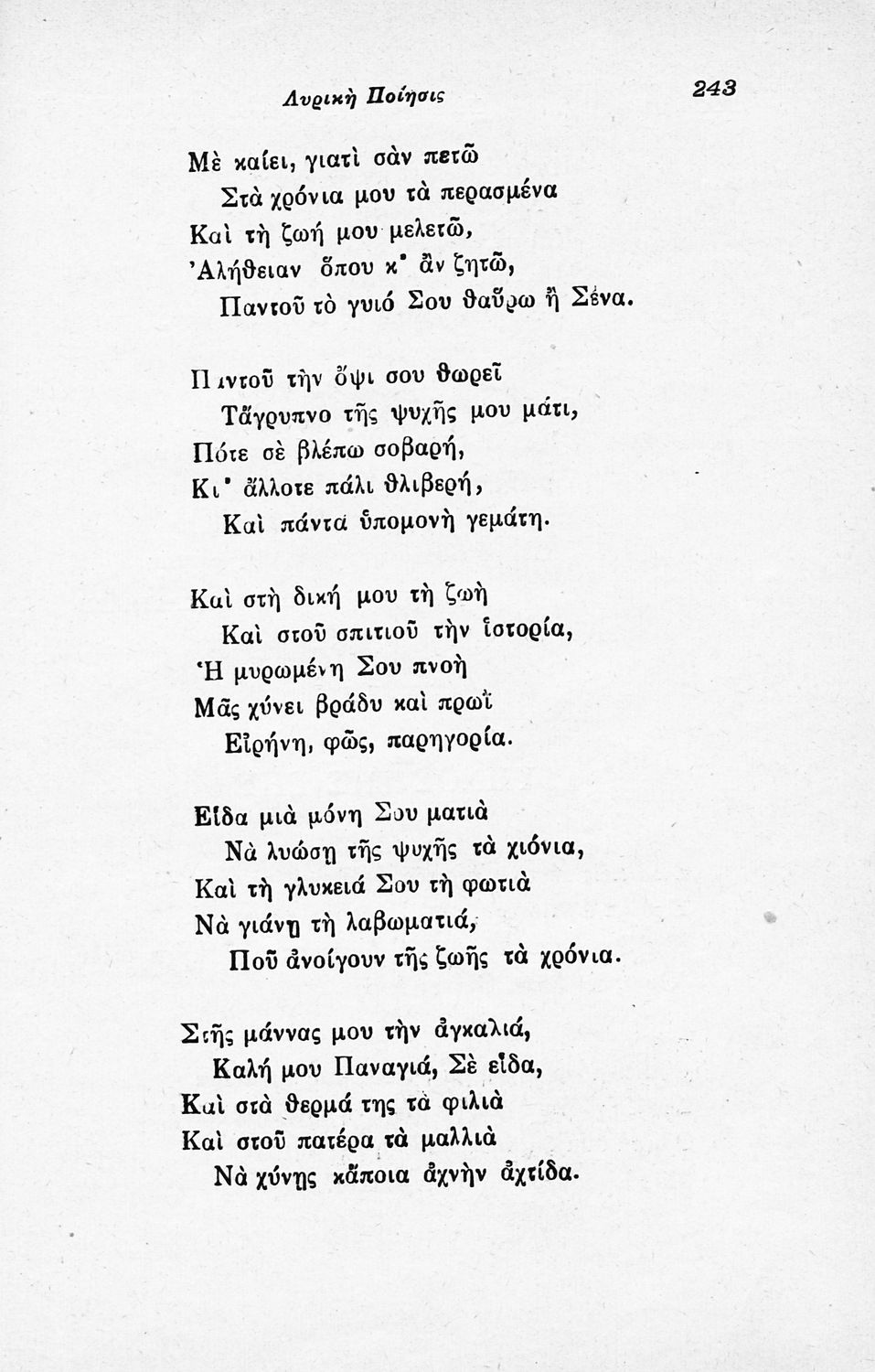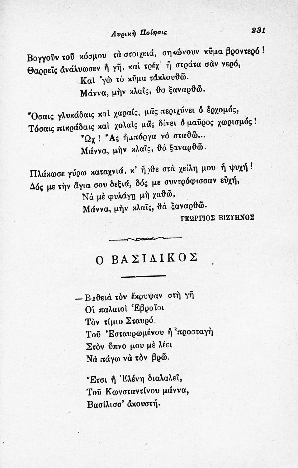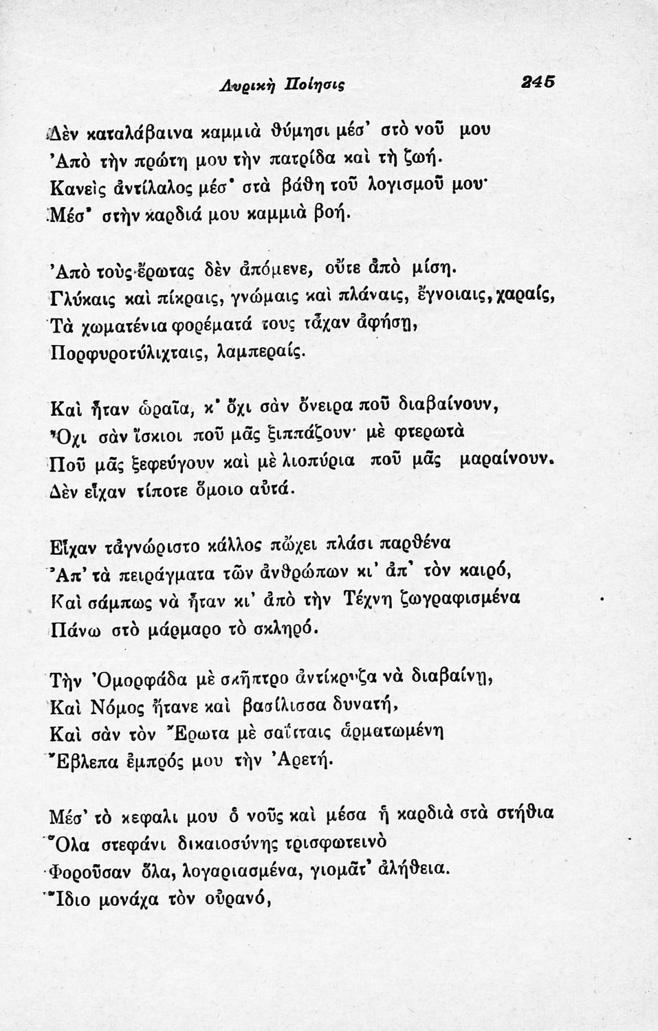 Σχολικό εγχειρίδιο Νέων Ελληνικών για τις τρεις τάξεις των Διδασκαλείων και Γ΄, Δ΄ Γυμνασίου. Ανθολόγιο νεοελληνικής ποίησης με αποσπάσματα από επικά, λυρικά και δραματικά ποιήματα. Περιέχει παράρτημα δυσνόητων λέξεων και βιογραφίες των ποιητών. Η θεματολογία είναι γύρω από την οικογενειακή ζωή και τα ιστορικά γεγονότα της χώρας.