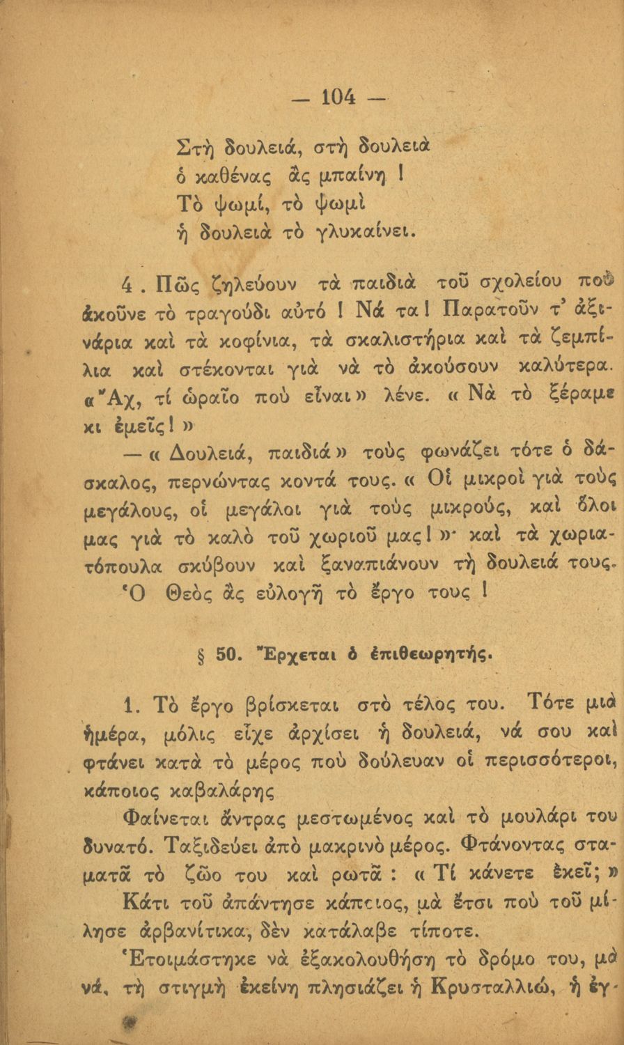 Αναγνωστικό Δ΄ Δημοτικού που περιέχει πεζά και ποιήματα με περιεχόμενο διδακτικό και ηθικοπλαστικό εμπνευσμένα από την ελληνική ιστορία και μυθολογία, και την αγροτική και κοινωνική ζωή.