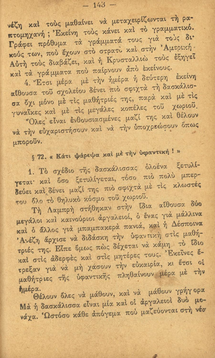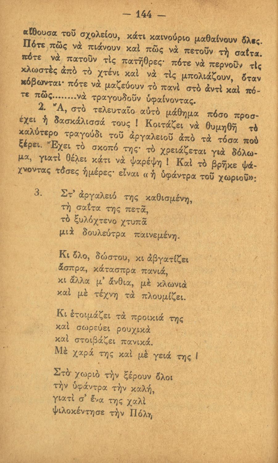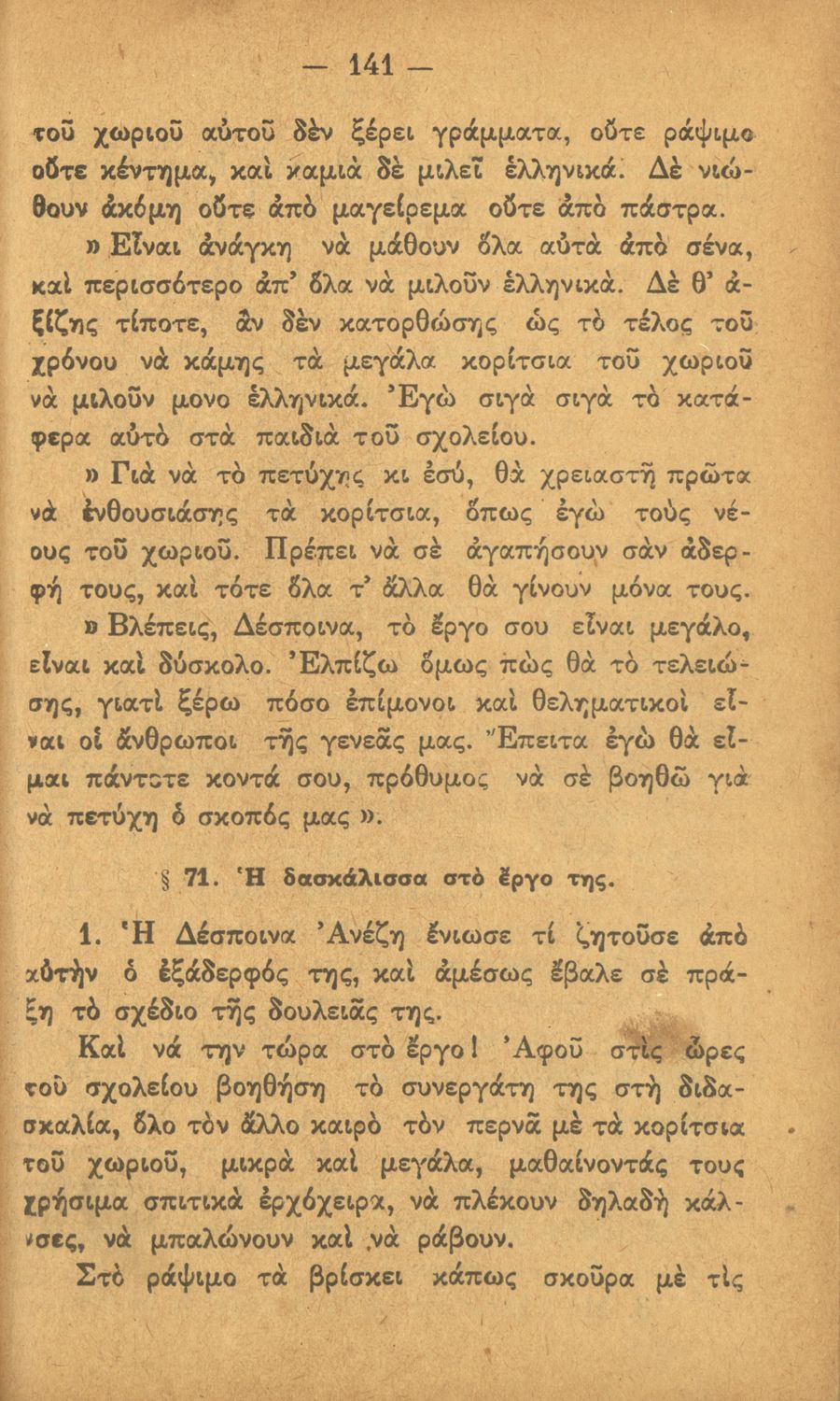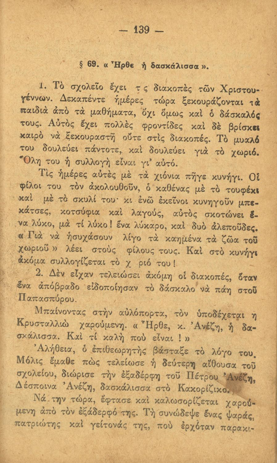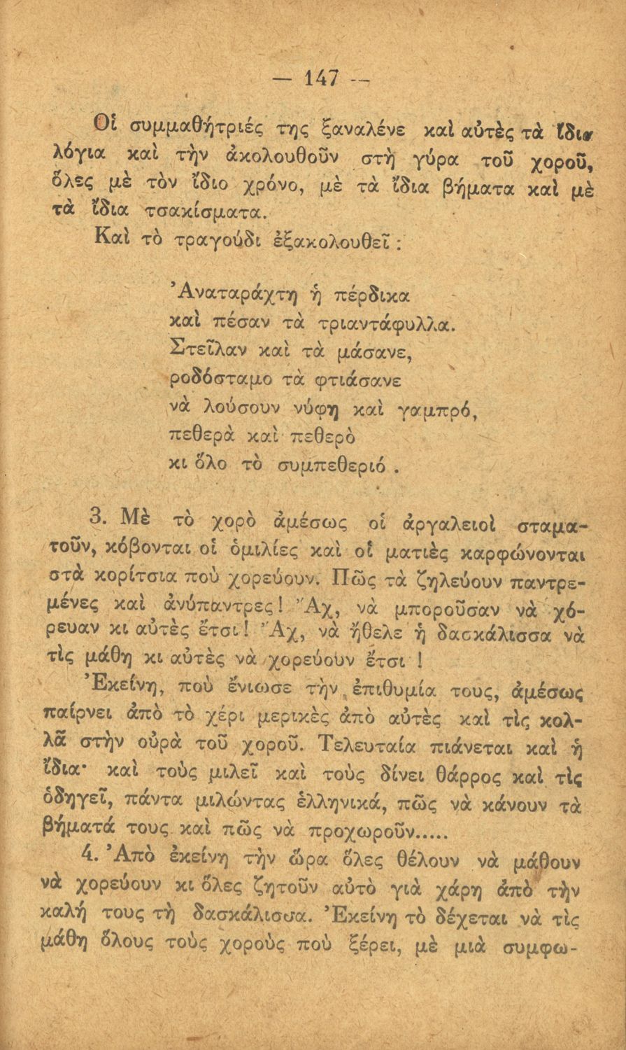 Αναγνωστικό Δ΄ Δημοτικού που περιέχει πεζά και ποιήματα με περιεχόμενο διδακτικό και ηθικοπλαστικό εμπνευσμένα από την ελληνική ιστορία και μυθολογία, και την αγροτική και κοινωνική ζωή.