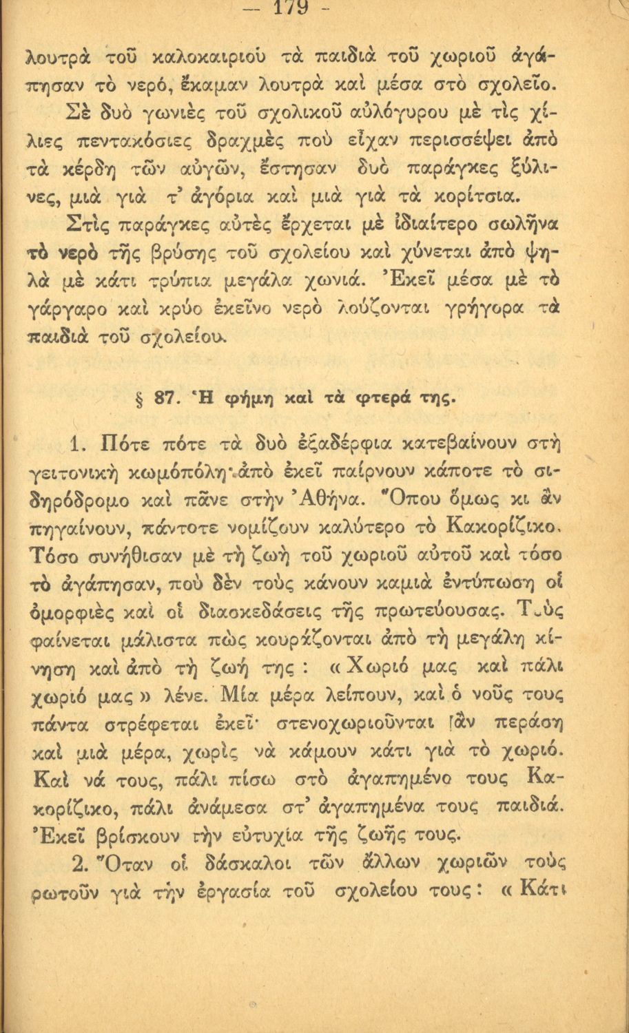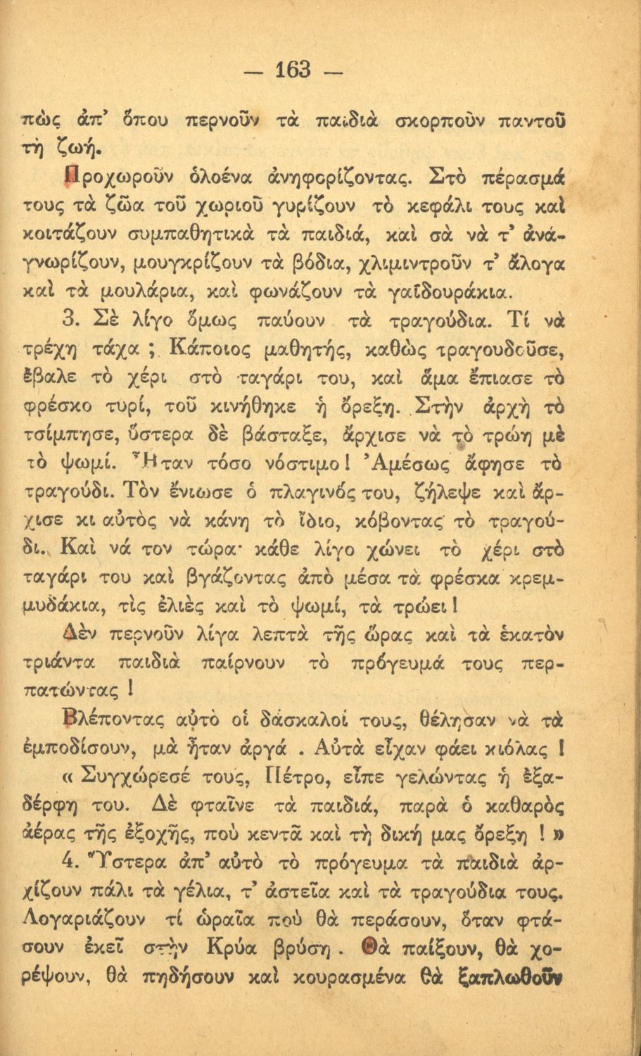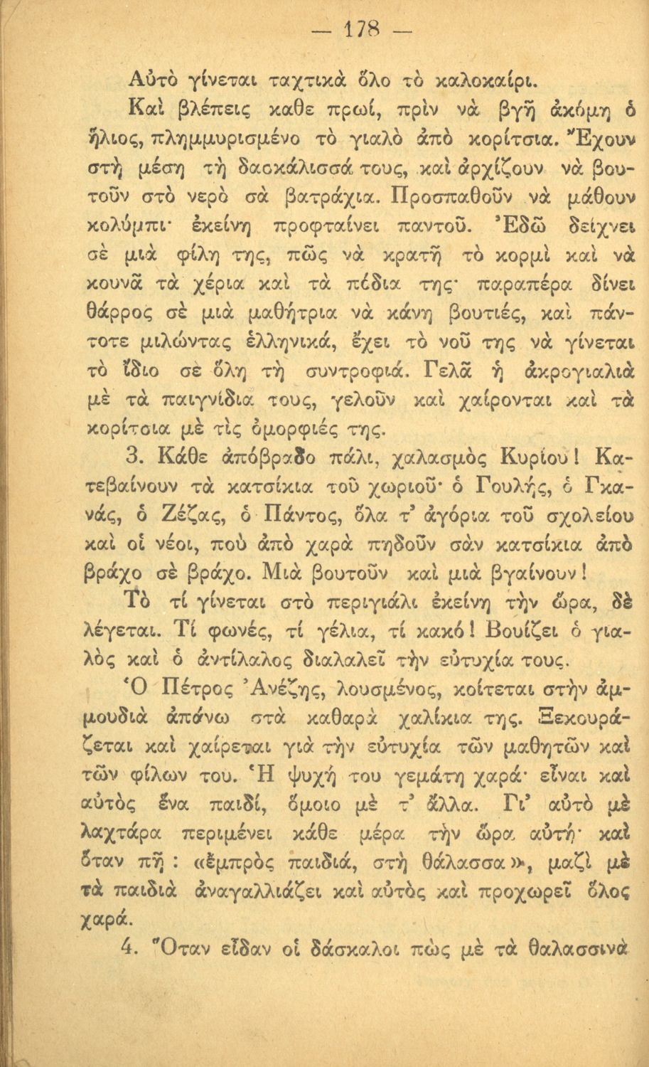 Αναγνωστικό Δ΄ Δημοτικού που περιέχει πεζά και ποιήματα με περιεχόμενο διδακτικό και ηθικοπλαστικό εμπνευσμένα από την ελληνική ιστορία και μυθολογία, και την αγροτική και κοινωνική ζωή.