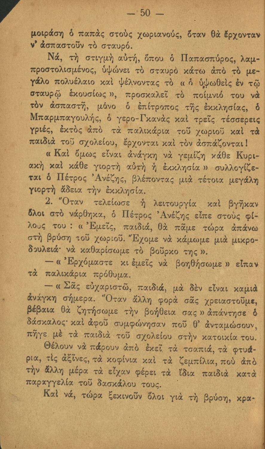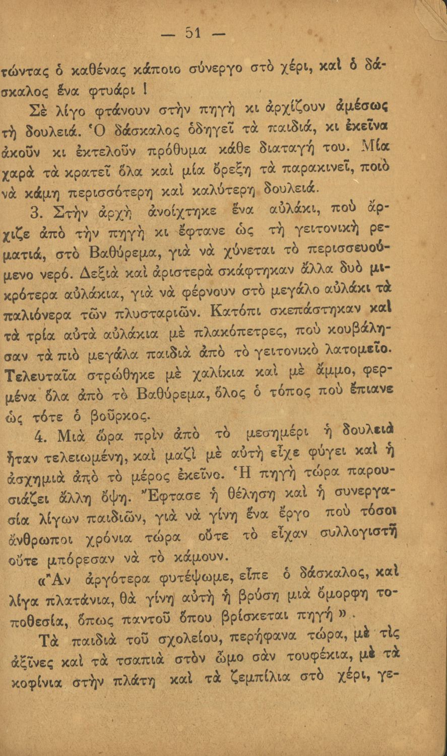 Αναγνωστικό Δ΄ Δημοτικού που περιέχει πεζά και ποιήματα με περιεχόμενο διδακτικό και ηθικοπλαστικό εμπνευσμένα από την ελληνική ιστορία και μυθολογία, και την αγροτική και κοινωνική ζωή.