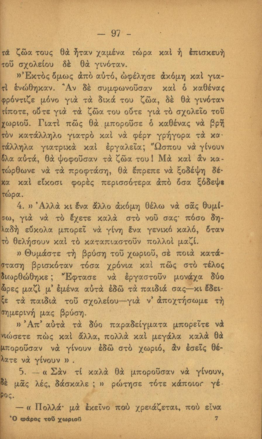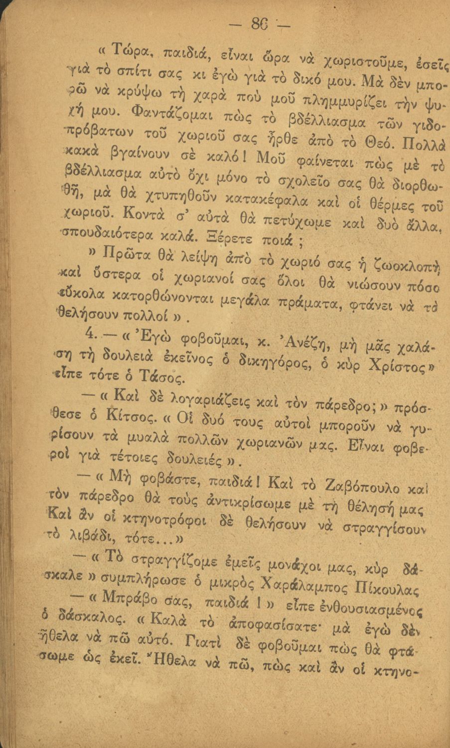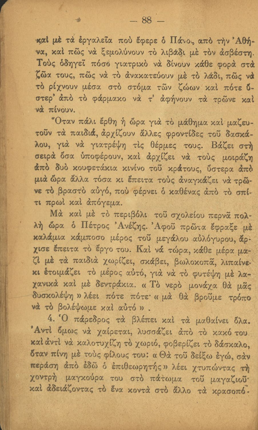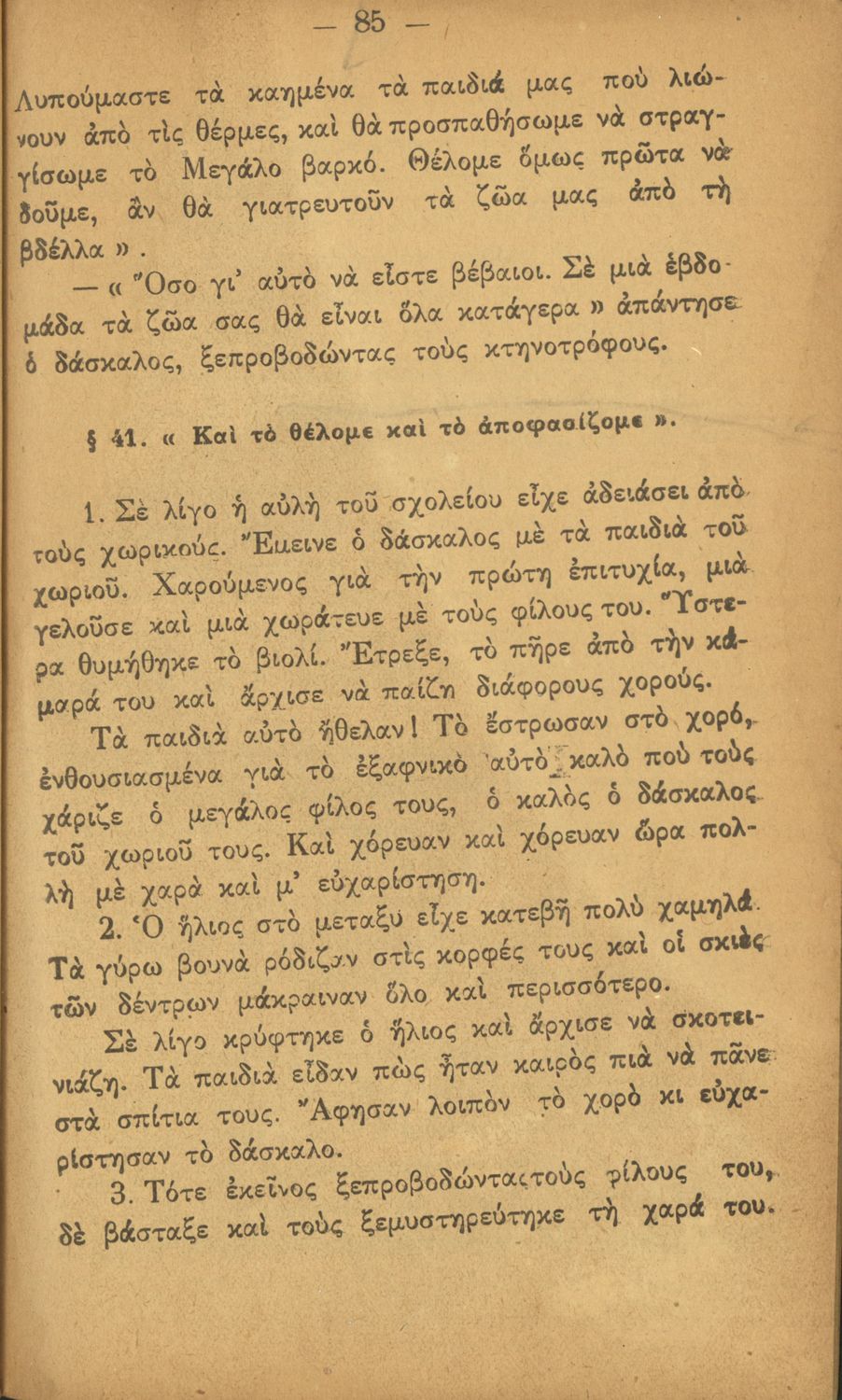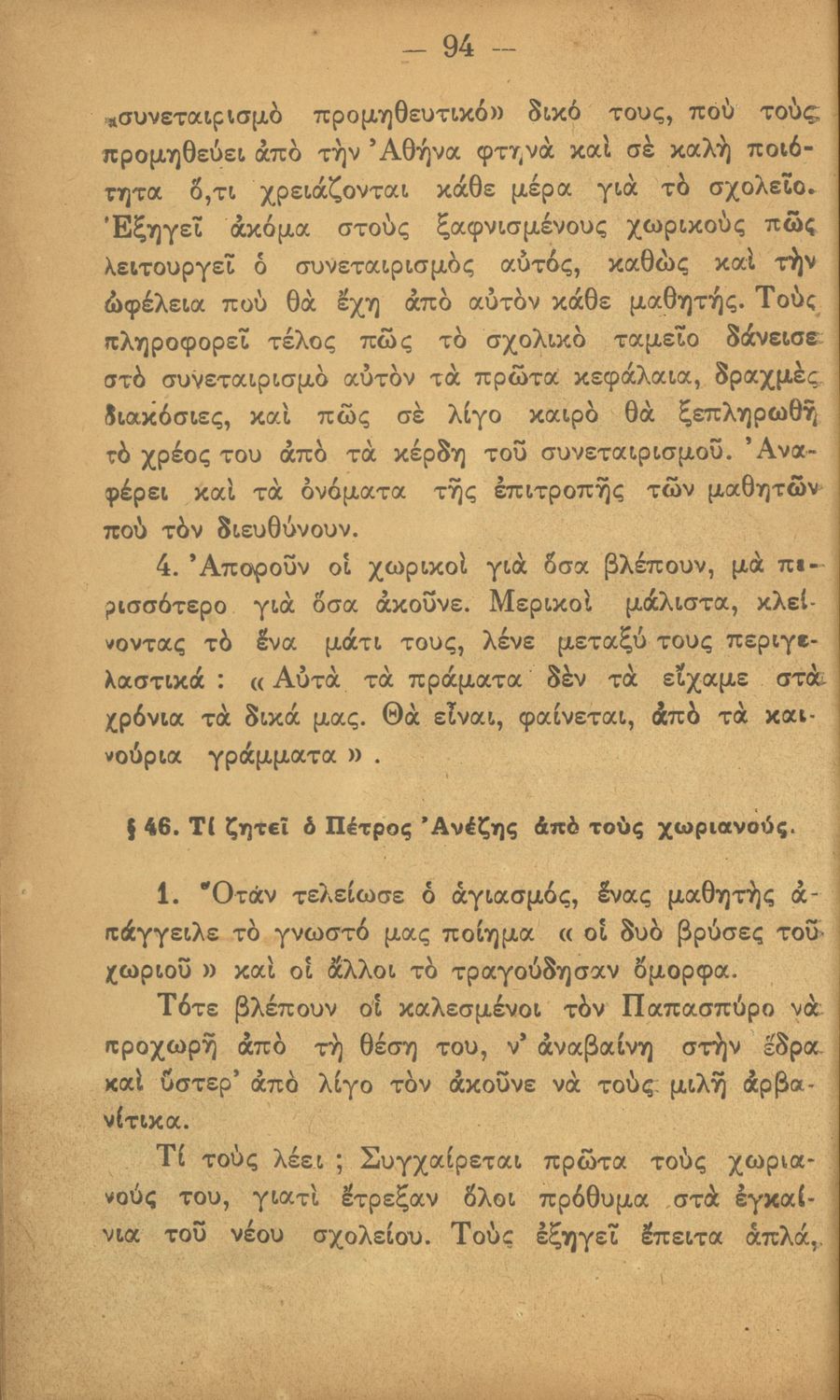Αναγνωστικό Δ΄ Δημοτικού που περιέχει πεζά και ποιήματα με περιεχόμενο διδακτικό και ηθικοπλαστικό εμπνευσμένα από την ελληνική ιστορία και μυθολογία, και την αγροτική και κοινωνική ζωή.