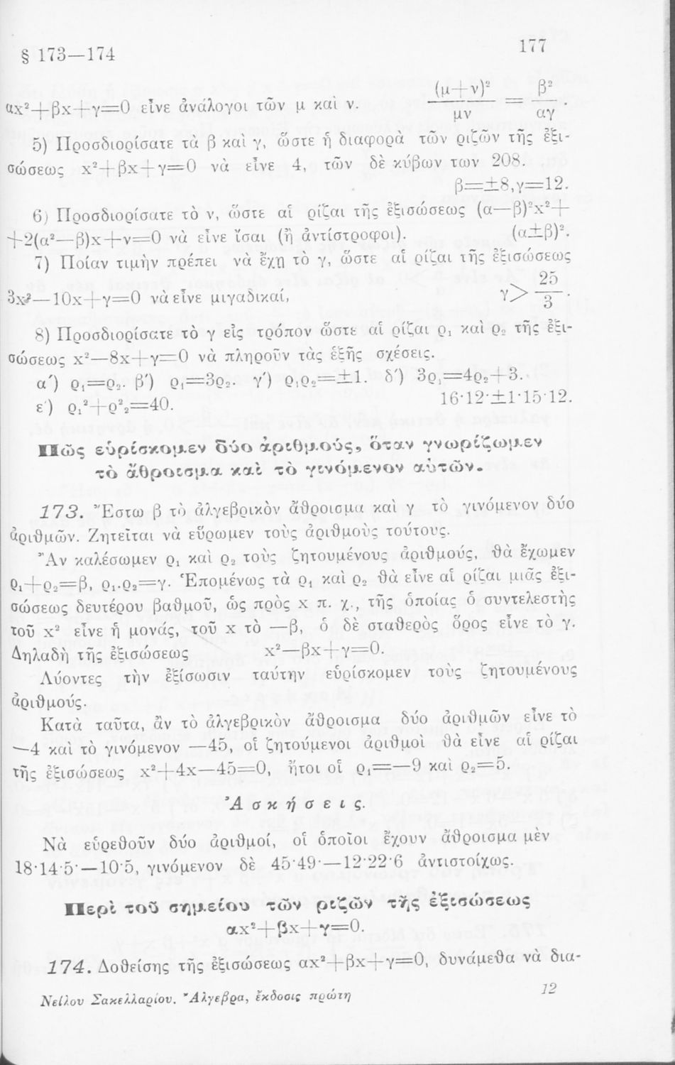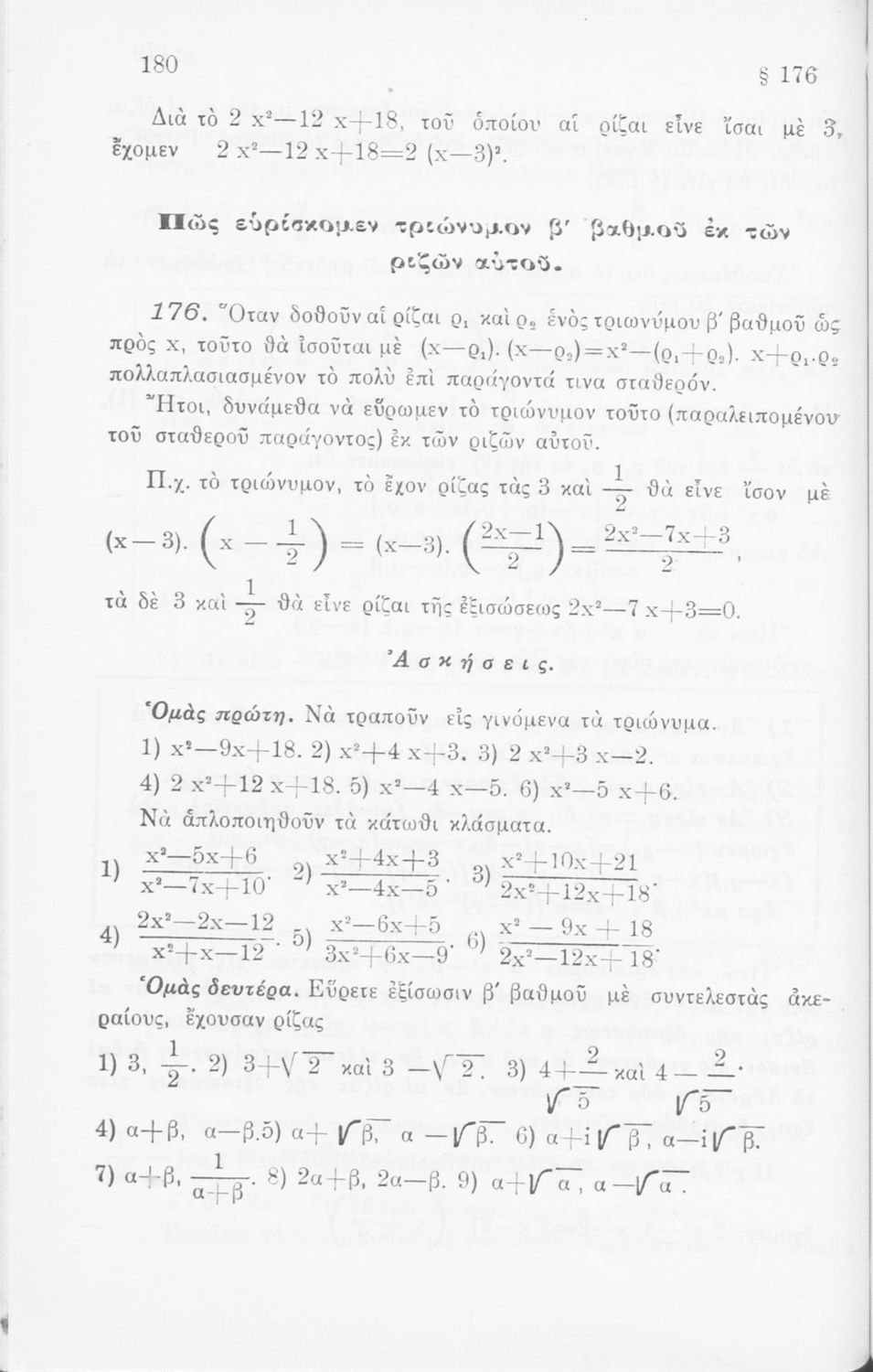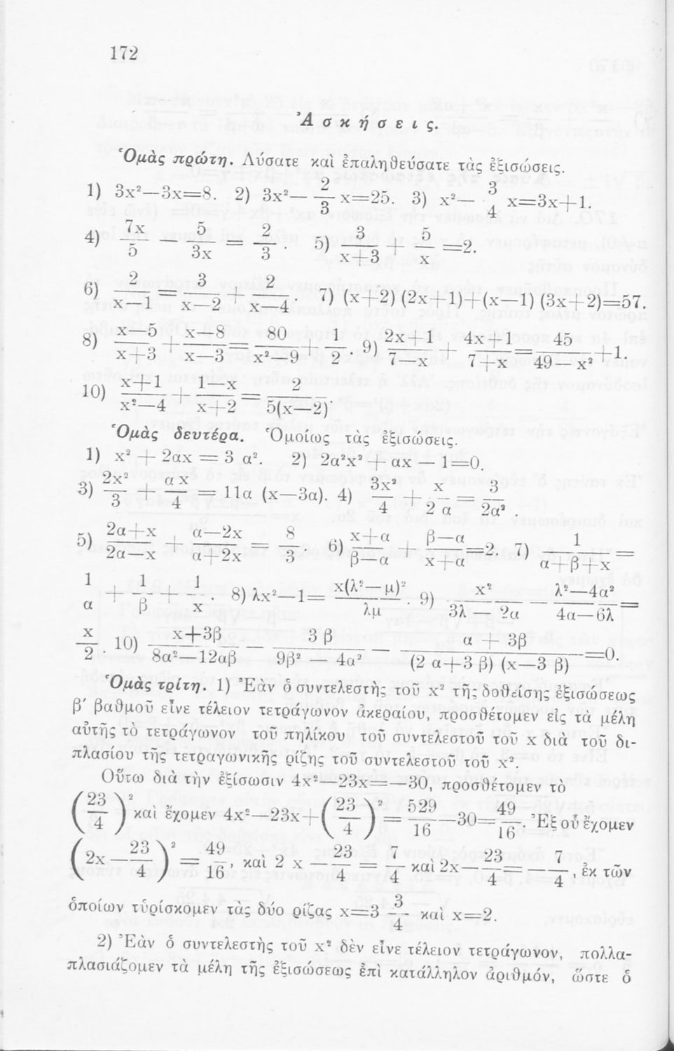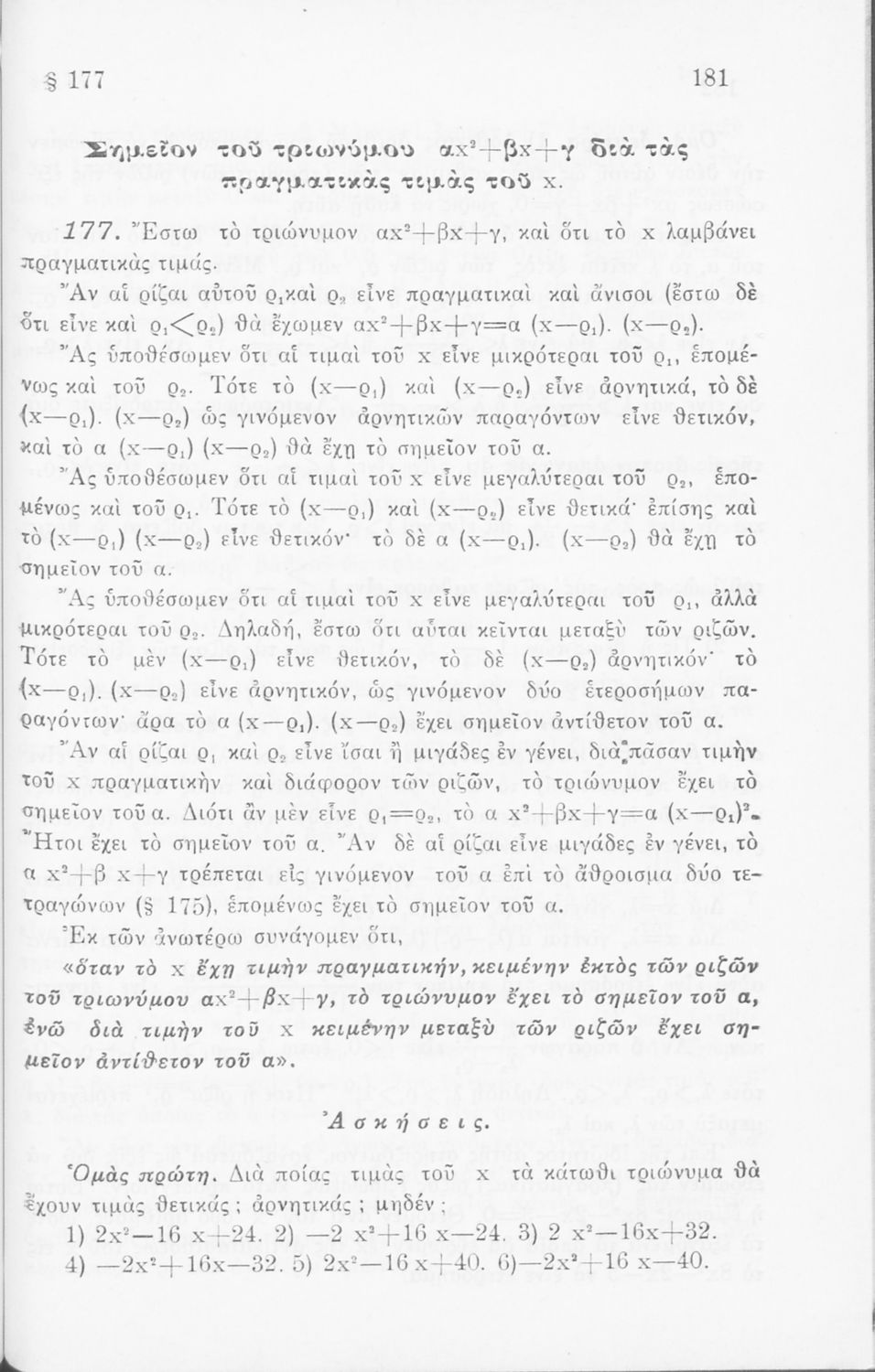 Σχολικό εγχειρίδιο Άλγεβρας για τα Γυμνάσια χωρισμένο σε θεωρία και ασκήσεις. Ο συγγραφέας ήταν καθηγητής στο Πανεπιστήμιο Αθηνών.