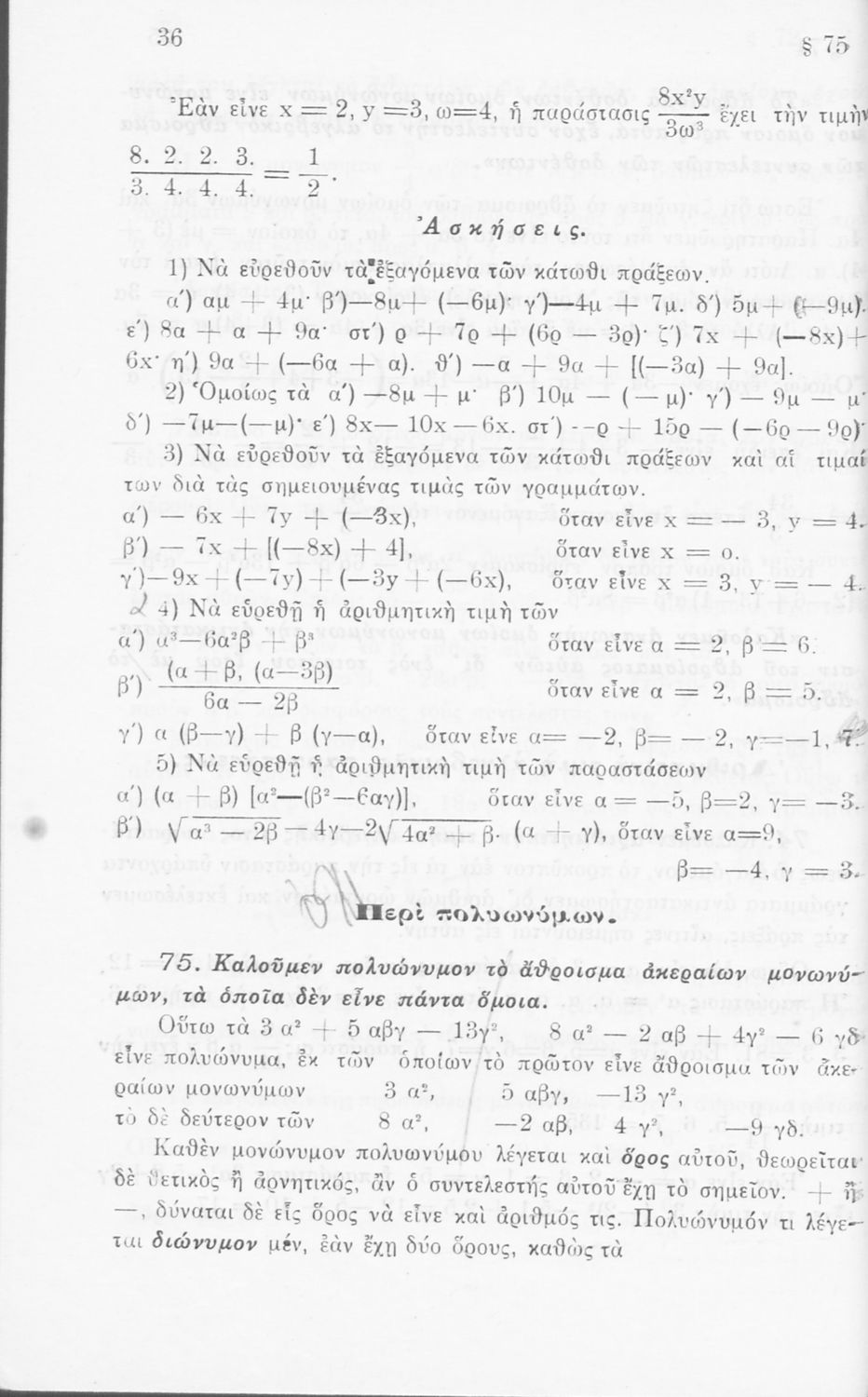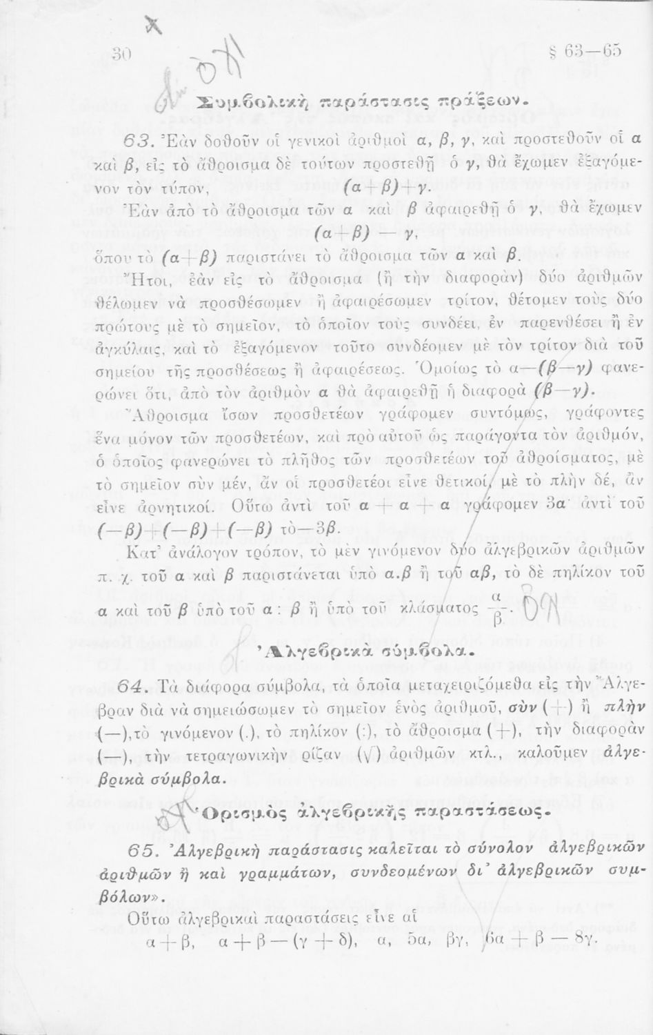 Βαθμίδα εκπαίδευσης: Δευτεροβάθμια Τάξη: Γυμνάσιο Μάθημα: Μαθηματικά Γλώσσα: Απλή καθαρεύουσα Παρουσίαση περιεχομένου: Σχολικό εγχειρίδιο Άλγεβρας για τα Γυμνάσια χωρισμένο σε θεωρία και ασκήσεις. Ο συγγραφέας ήταν καθηγητής στο Πανεπιστήμιο Αθηνών. |
