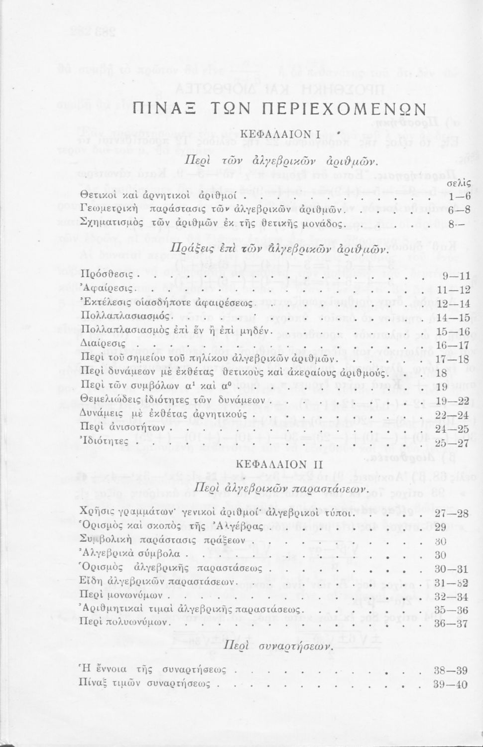 Παρουσίαση περιεχομένου: Σχολικό εγχειρίδιο Άλγεβρας για τα Γυμνάσια χωρισμένο σε θεωρία και ασκήσεις. Ο συγγραφέας ήταν καθηγητής στο Πανεπιστήμιο Αθηνών.