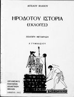 Σχολικό εγχειρίδιο Αρχαίων Ελληνικών Α΄ Γυμνασίου που περιλαμβάνει εισαγωγή στη ζωή και το έργο του Ηρόδοτου, και αποσπάσματα από τα 9 βιβλία της Ιστορίας του σε μετάφραση. Φέρει το σύμβολο της δικτατορίας.