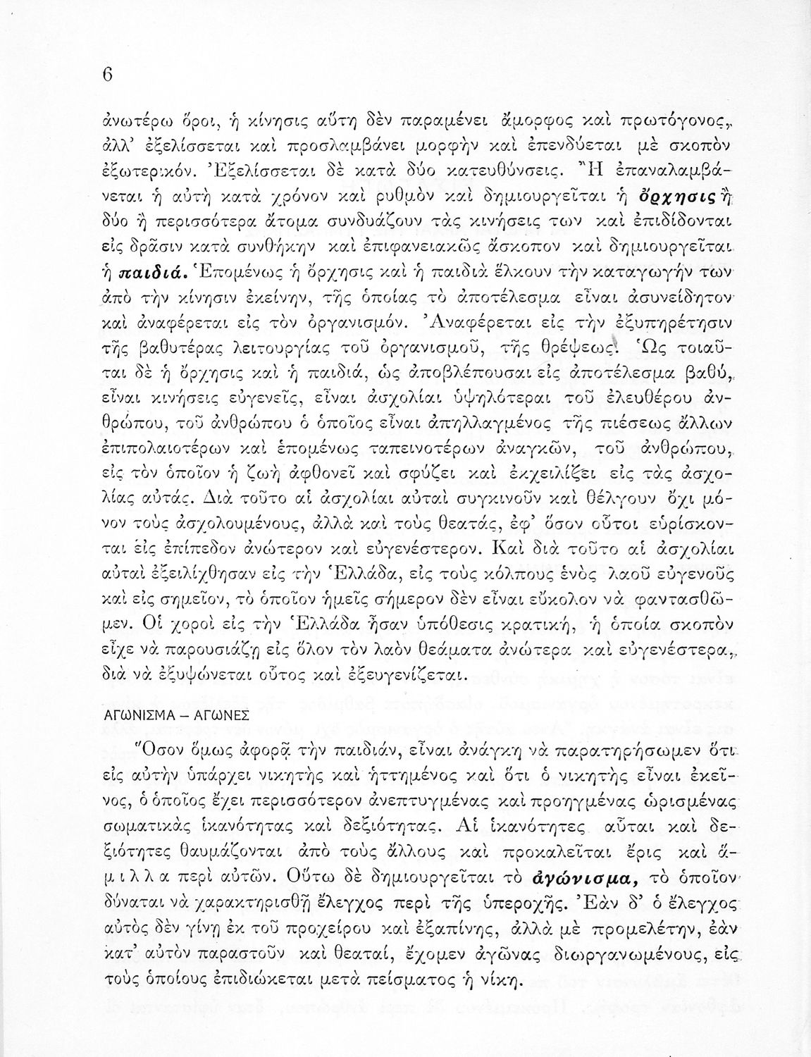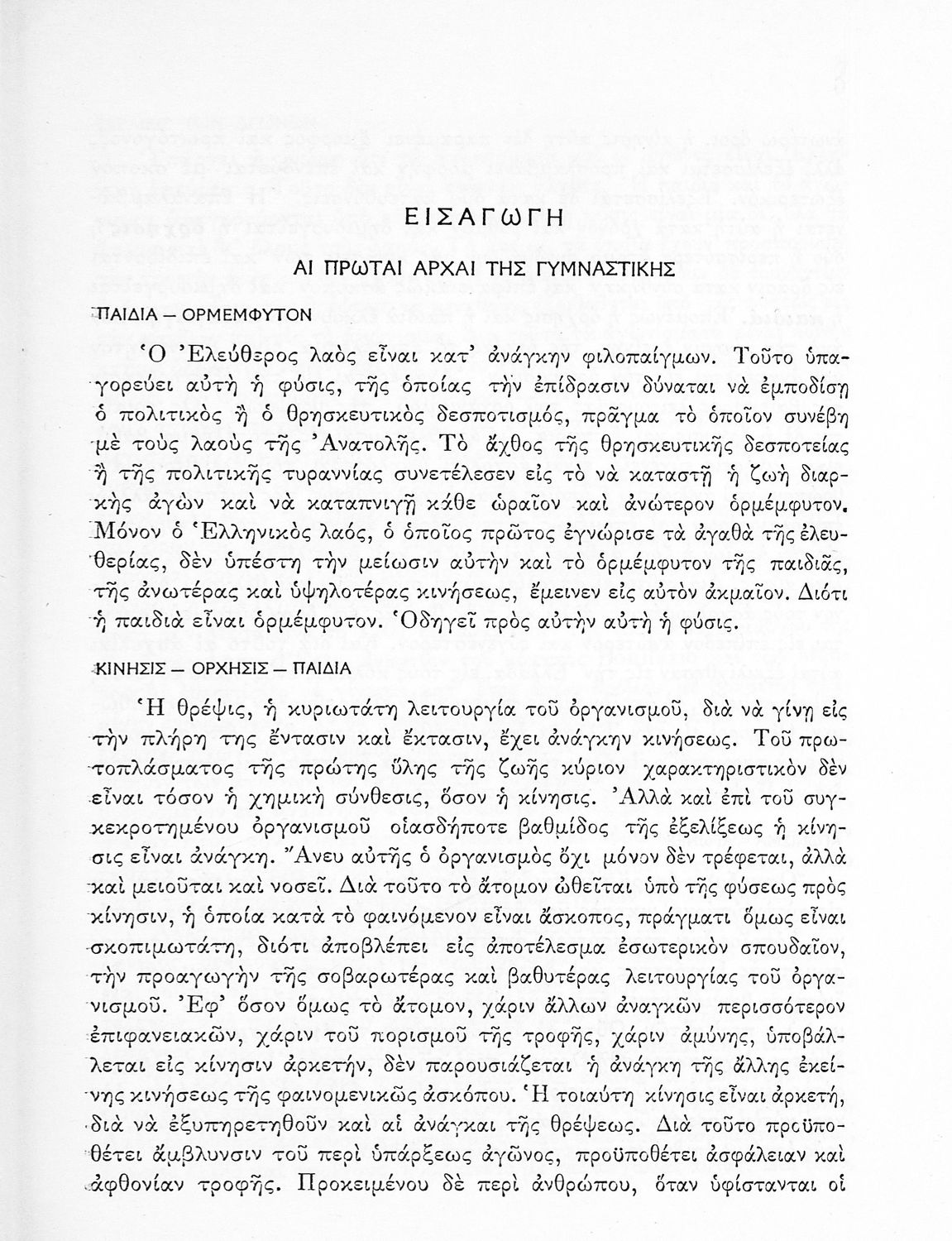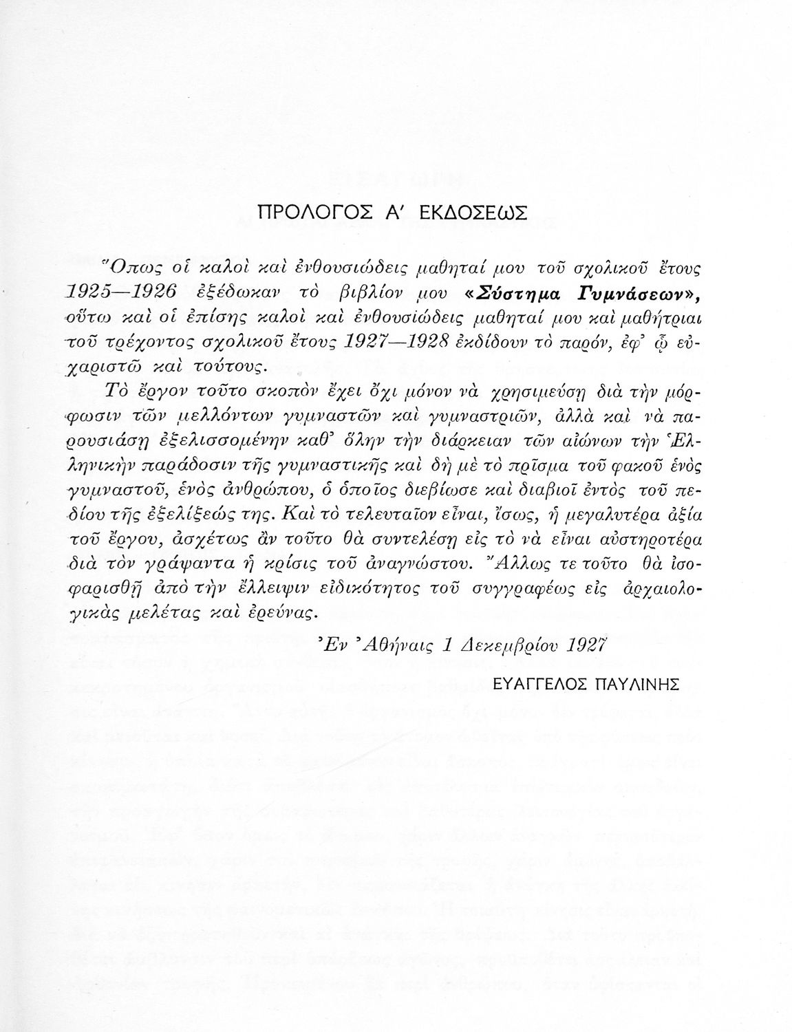 Παρουσίαση περιεχομένου: Παιδαγωγικό βοήθημα που αποσκοπεί στην επιμόρφωση των "μελλοντικών γυμναστών και γυμναστριών" και να παρουσιάσει την ιστορική εξέλιξη της ελληνικής παράδοσης στην γυμναστική. Ο συγγραφέας ήταν πρώην γενικός επιθεωρητής της γυμναστικής.