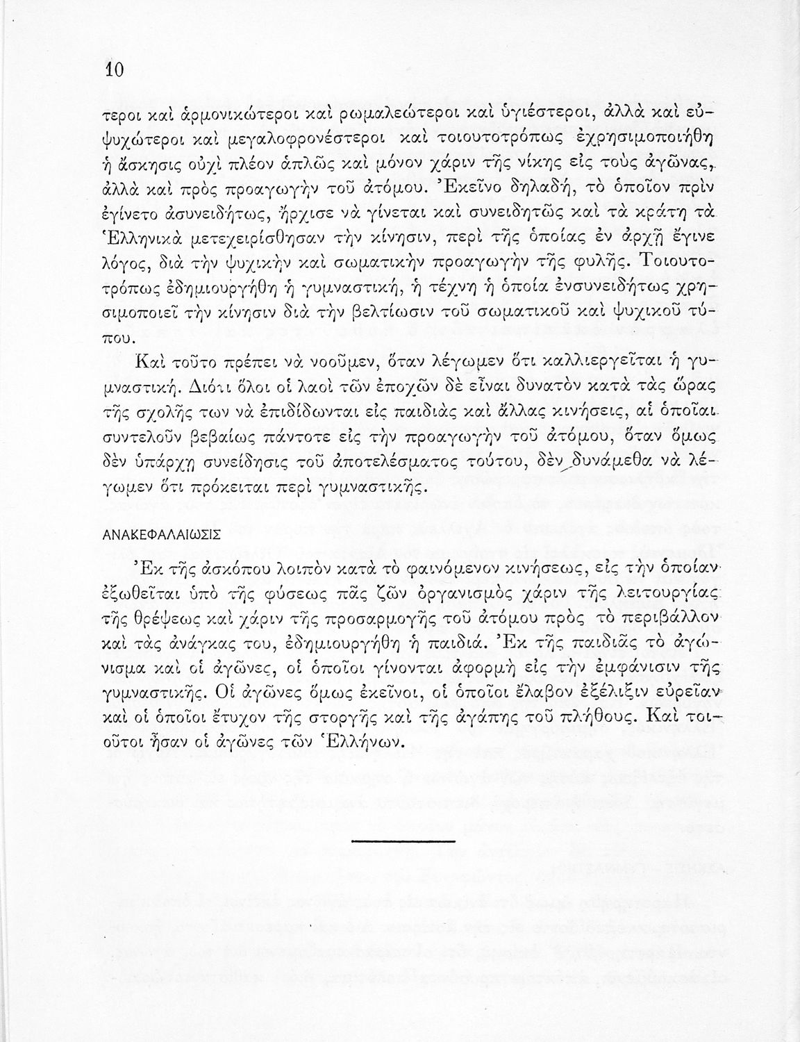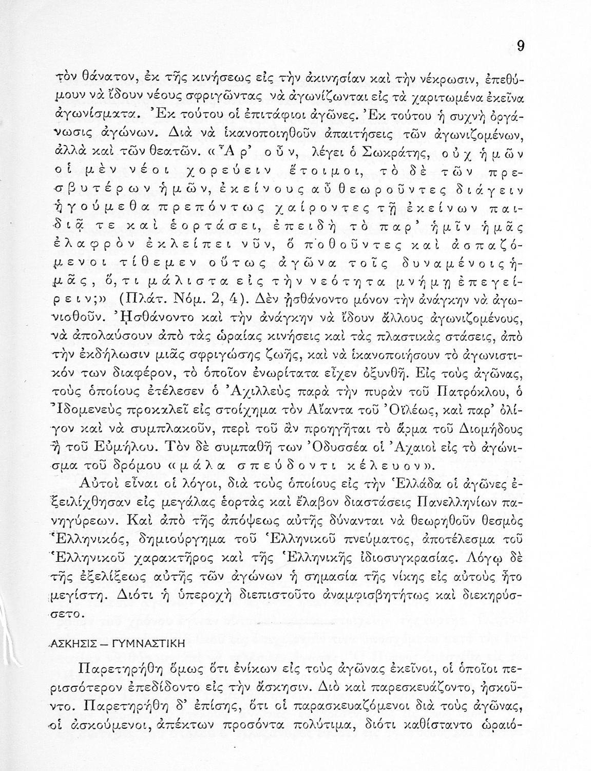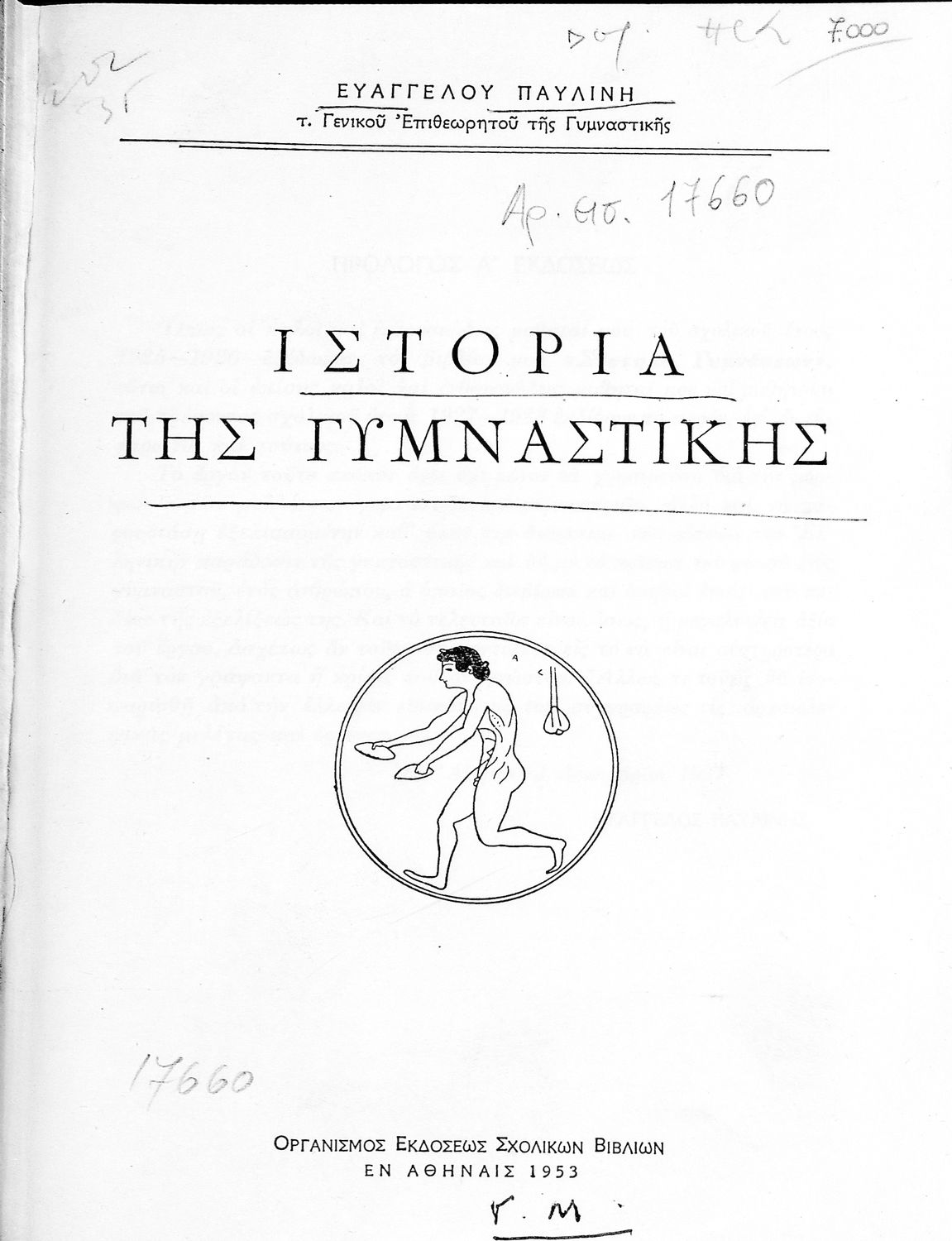 Παιδαγωγικό βοήθημα που αποσκοπεί στην επιμόρφωση των "μελλοντικών γυμναστών και γυμναστριών" και να παρουσιάσει την ιστορική εξέλιξη της ελληνικής παράδοσης στην γυμναστική. Ο συγγραφέας ήταν πρώην γενικός επιθεωρητής της γυμναστικής.