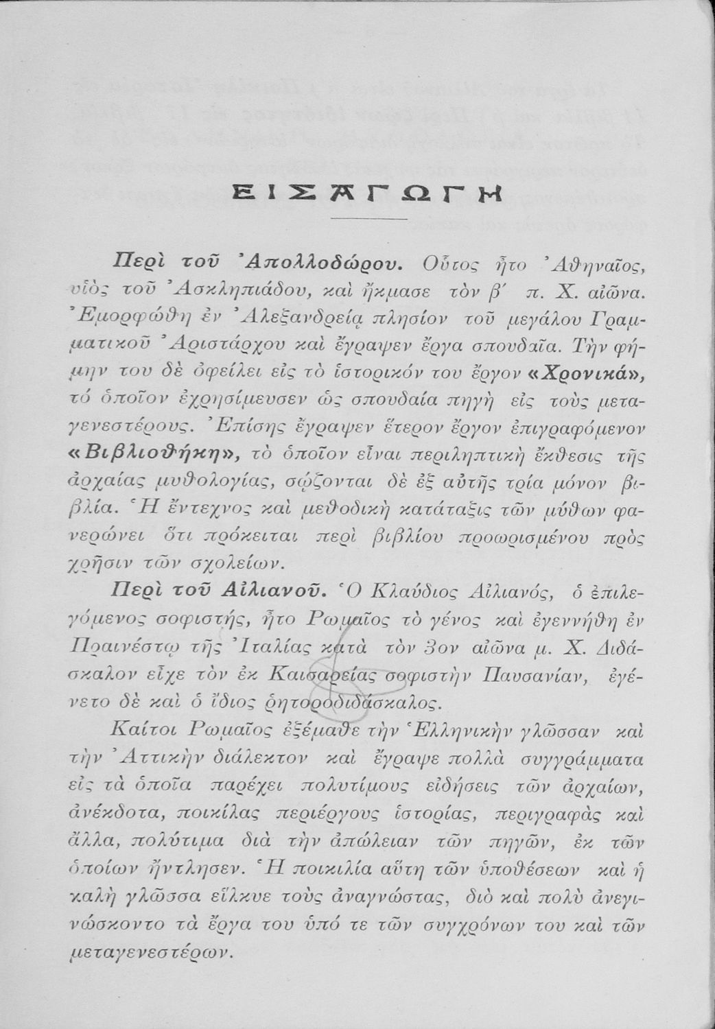 Σχολικό εγχειρίδιο Αρχαίων Ελληνικών Α΄ Γυμνασίου και Πρακτικού Λυκείου που περιλαμβάνει εισαγωγή στη ζωή και το έργο των Απολλόδωρου και Αιλιανού, αποσπάσματα από τη Βιβλιοθήκη του Απολλόδωρου και την Ποικίλη