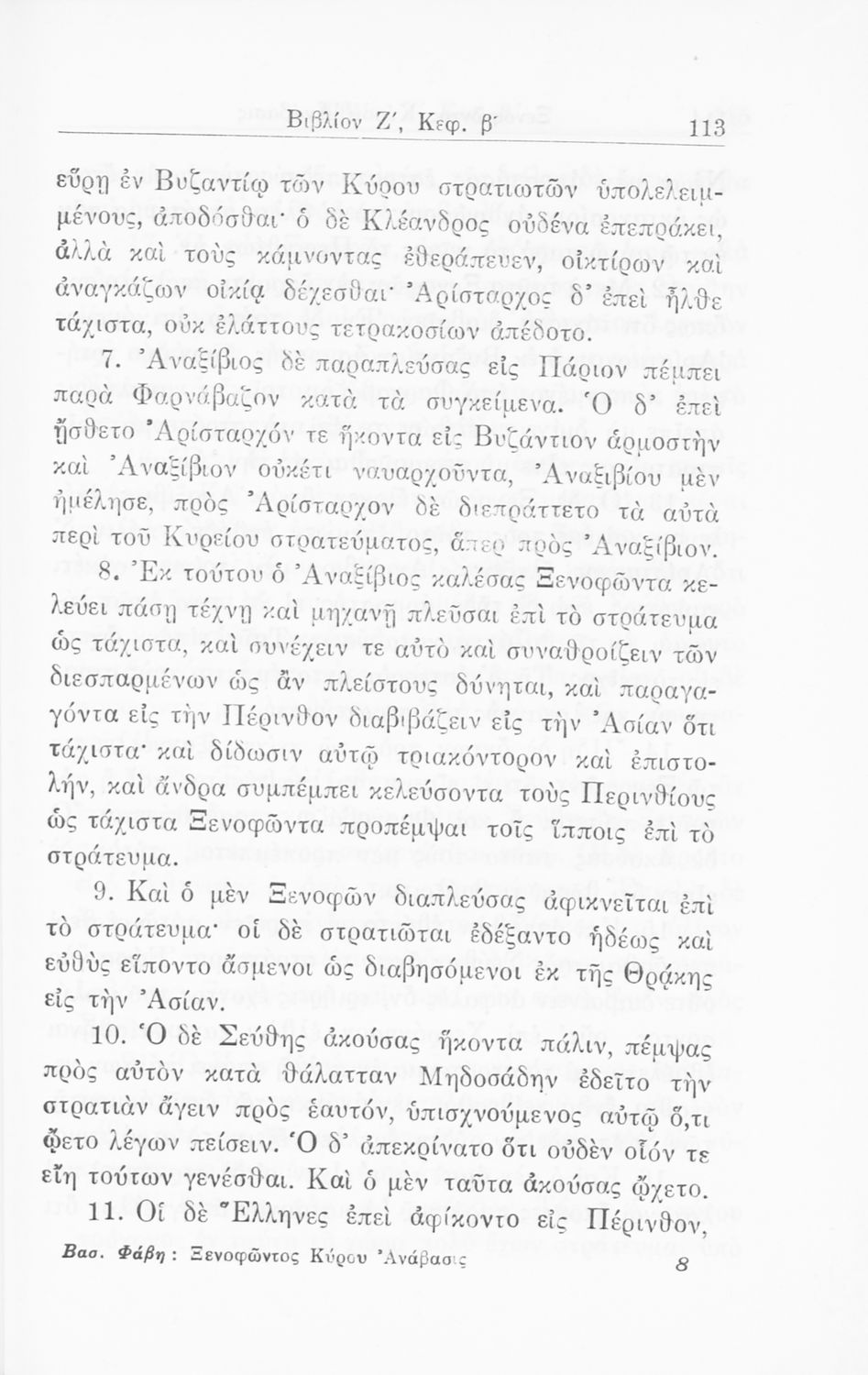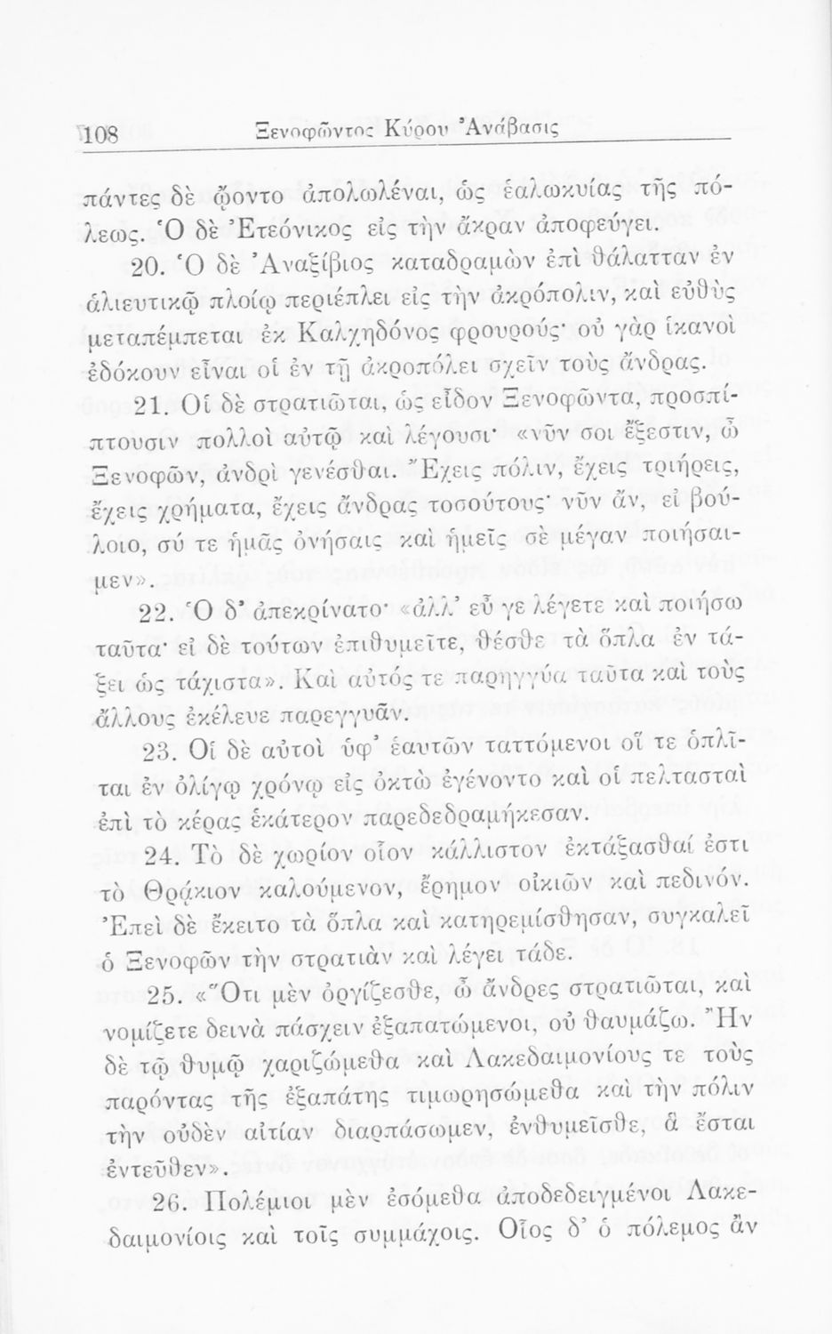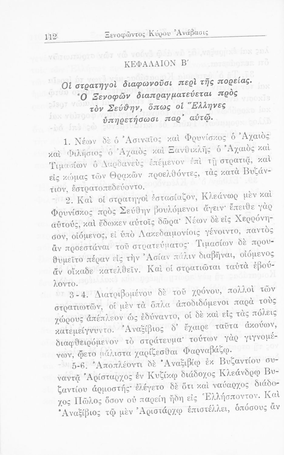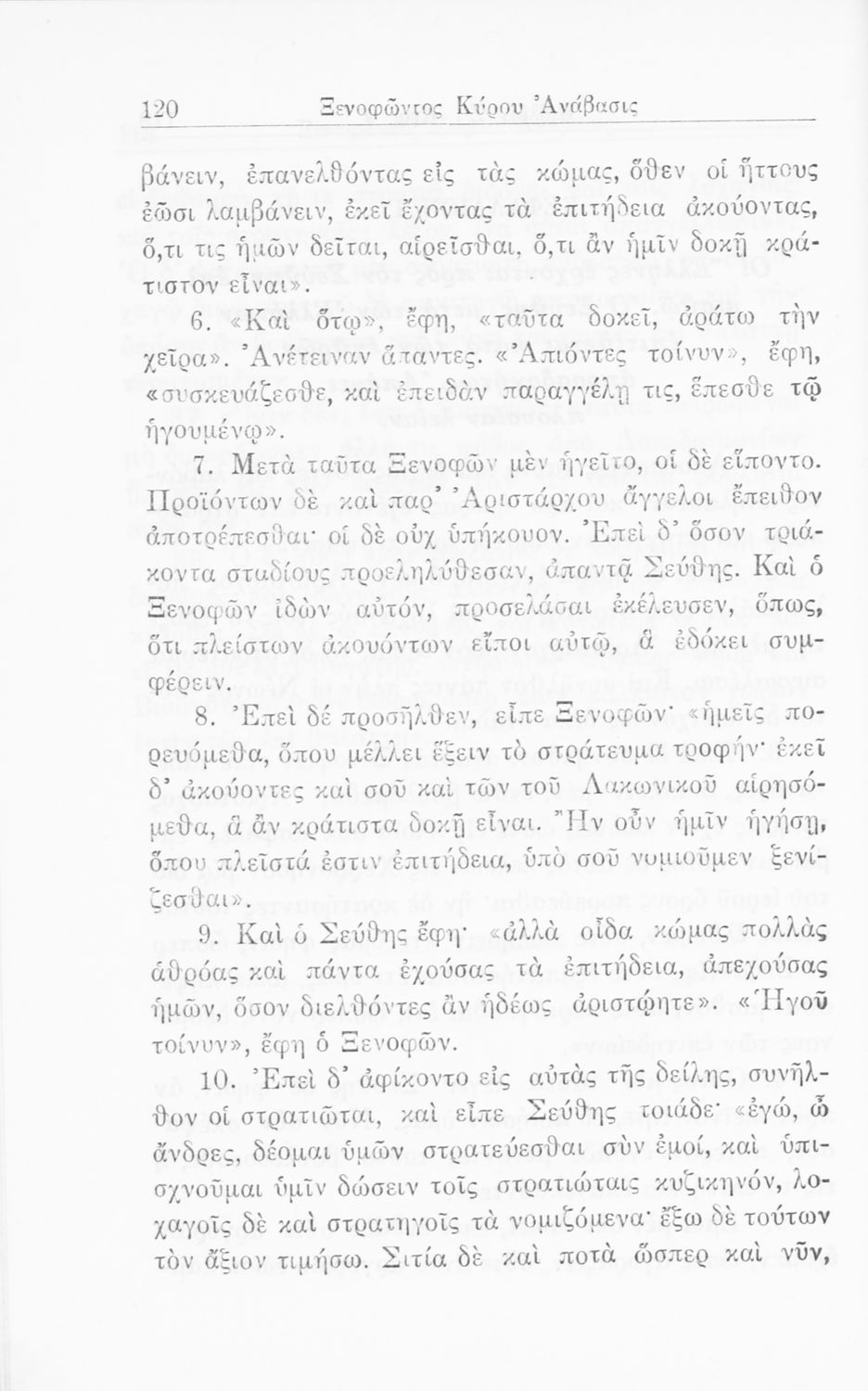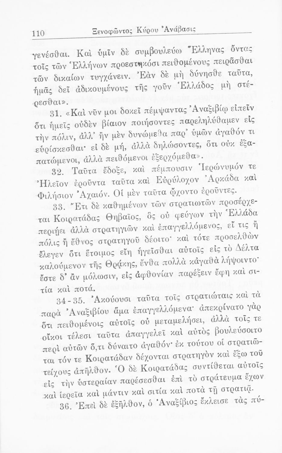 Σχολικό εγχειρίδιο Α΄ και Β΄ Γυμνασίου για το μάθημα των Αρχαίων. Περιλαμβάνει κείμενα κατ΄ επιλογή από το έργο του Ξενοφώντα Κύρου Ανάβαση από το πρωτότυπο. Περιέχει πραγματολογικά σχόλια και λεξιλογικές παρατηρήσεις του συγγραφέα. Εγκρίθηκε για μια δεκαετία από το σχολικό έτος 1931-1932.