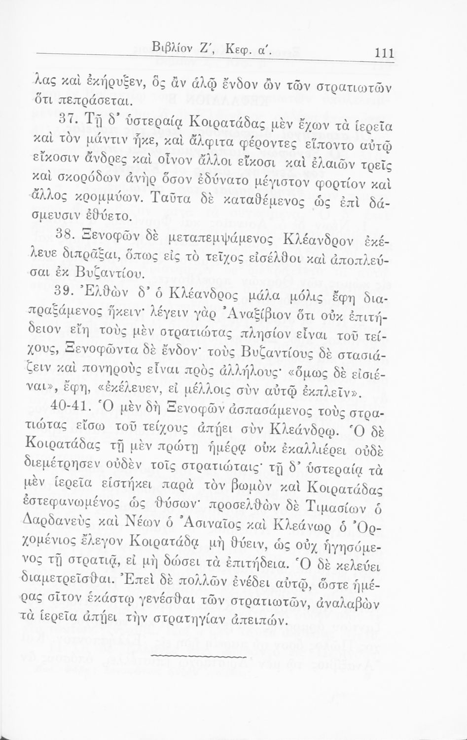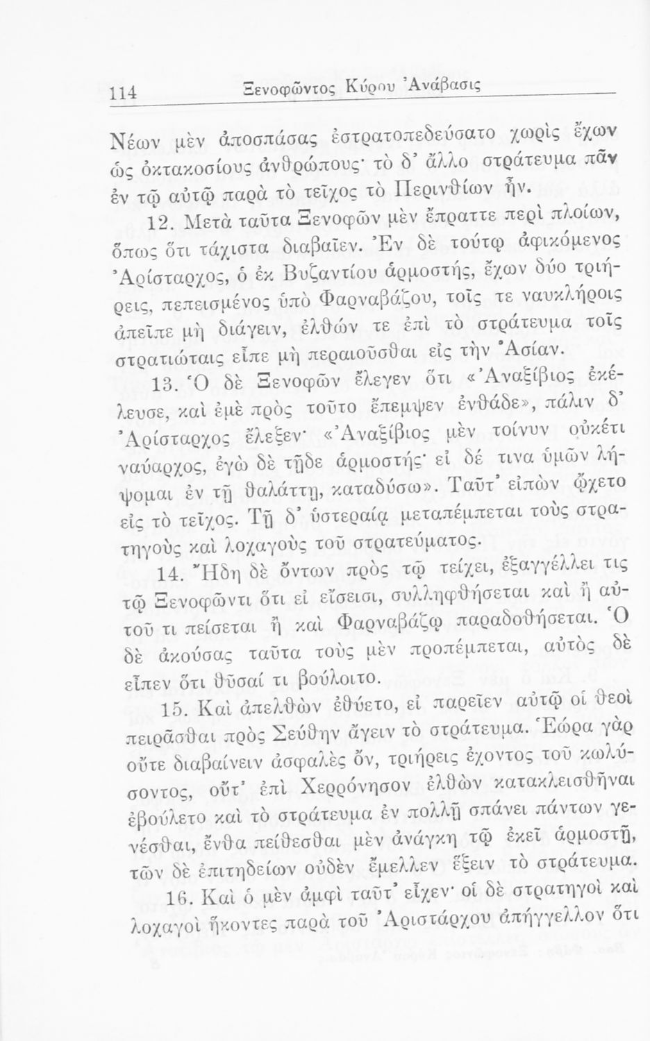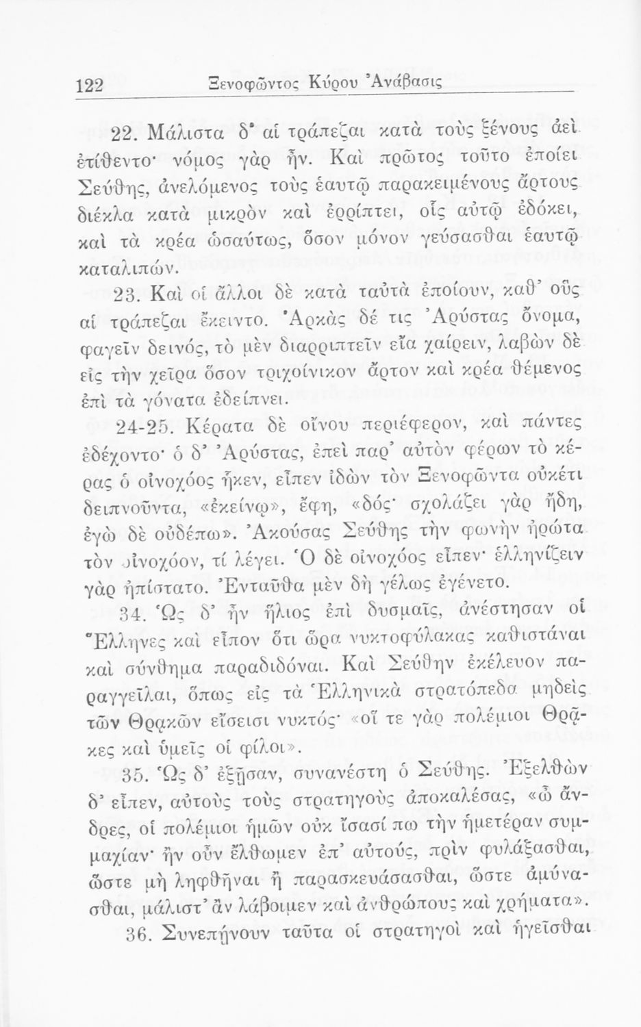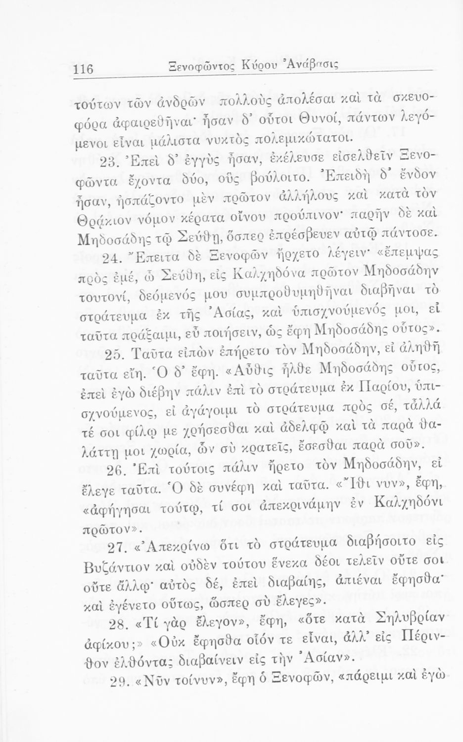 Σχολικό εγχειρίδιο Α΄ και Β΄ Γυμνασίου για το μάθημα των Αρχαίων. Περιλαμβάνει κείμενα κατ΄ επιλογή από το έργο του Ξενοφώντα Κύρου Ανάβαση από το πρωτότυπο. Περιέχει πραγματολογικά σχόλια και λεξιλογικές παρατηρήσεις του συγγραφέα. Εγκρίθηκε για μια δεκαετία από το σχολικό έτος 1931-1932.