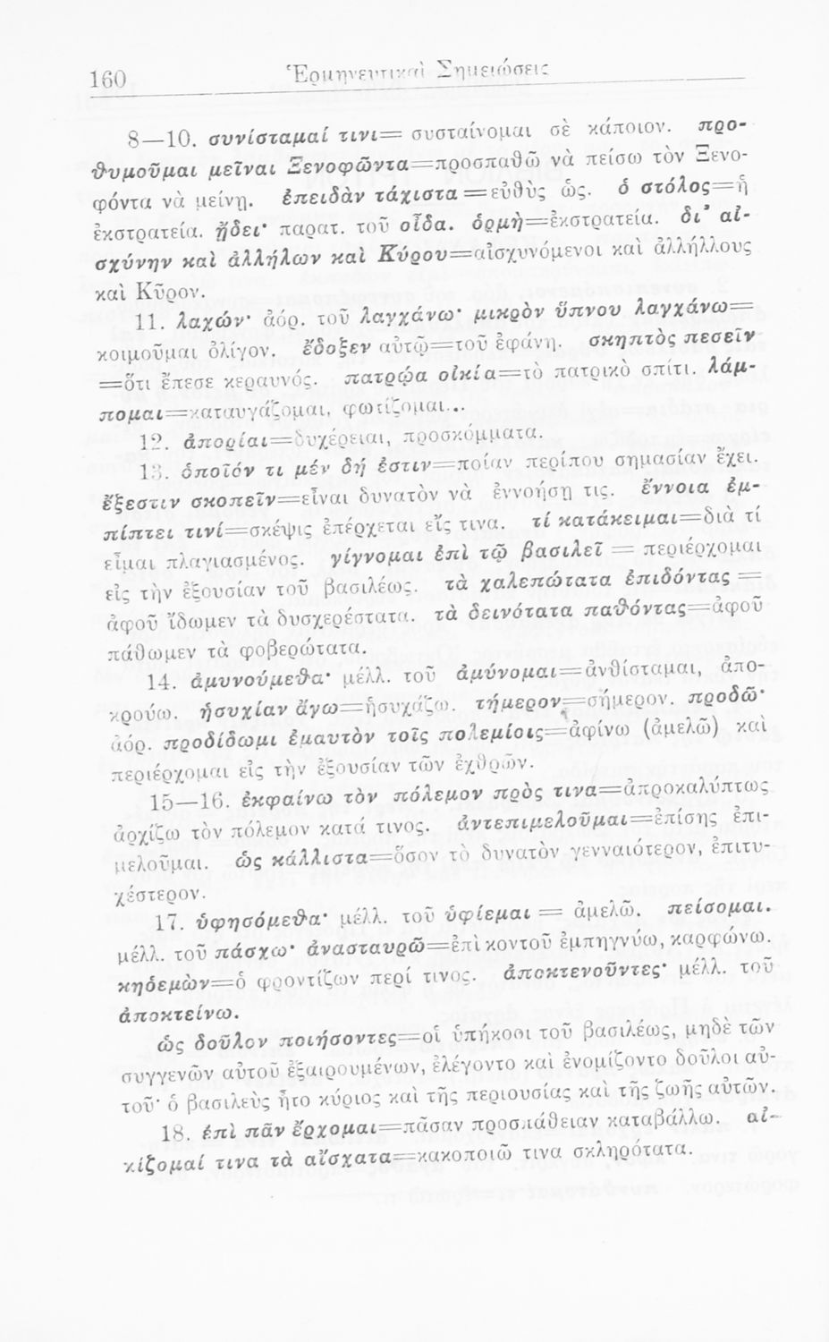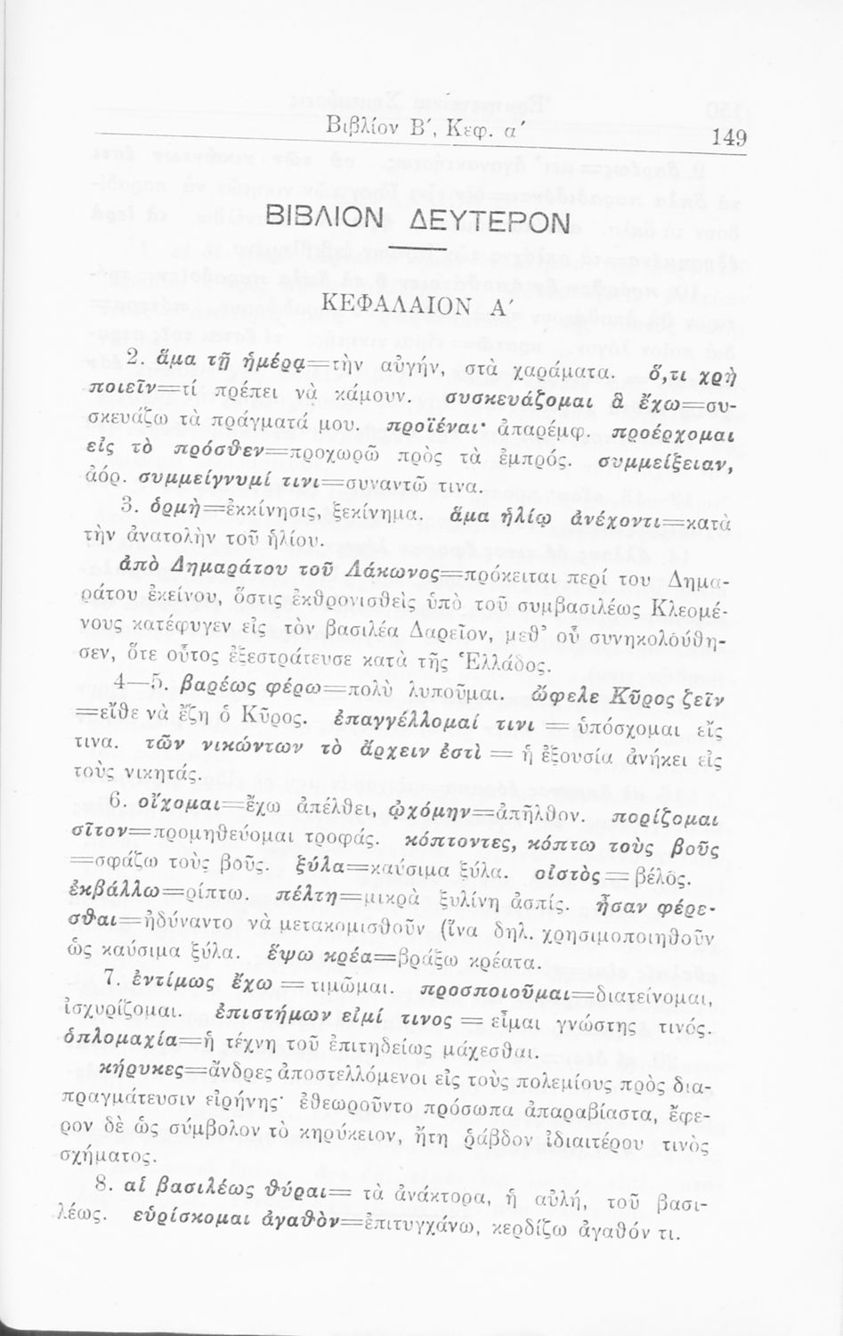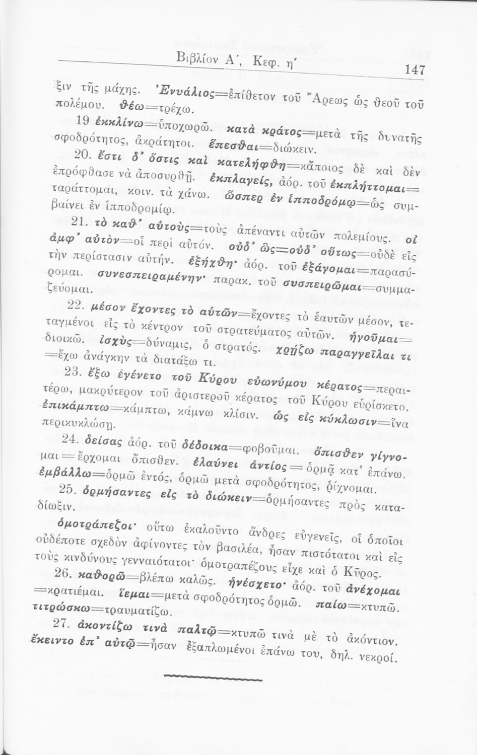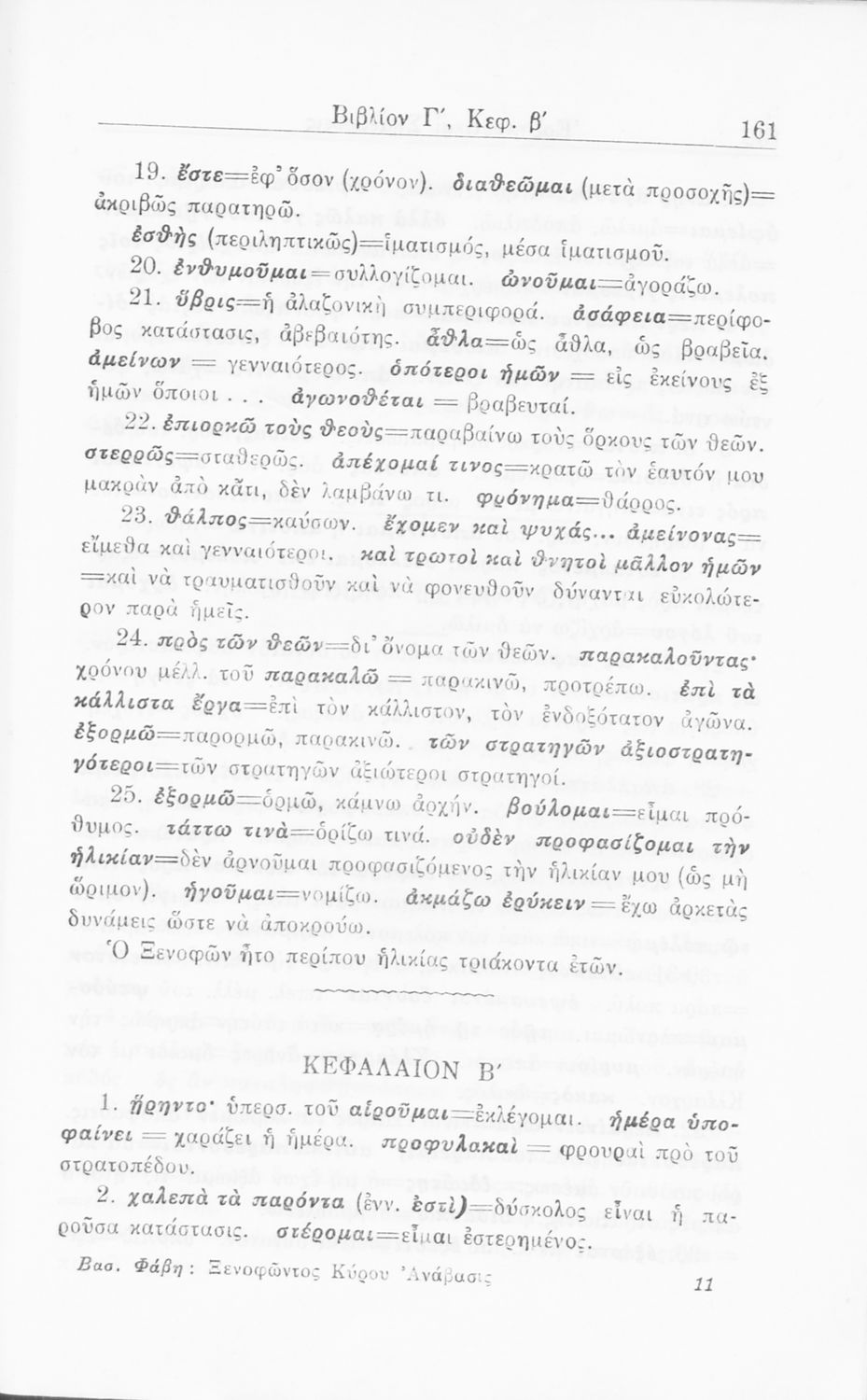 Σχολικό εγχειρίδιο Α΄ και Β΄ Γυμνασίου για το μάθημα των Αρχαίων. Περιλαμβάνει κείμενα κατ΄ επιλογή από το έργο του Ξενοφώντα Κύρου Ανάβαση από το πρωτότυπο. Περιέχει πραγματολογικά σχόλια και λεξιλογικές παρατηρήσεις του συγγραφέα. Εγκρίθηκε για μια δεκαετία από το σχολικό έτος 1931-1932.