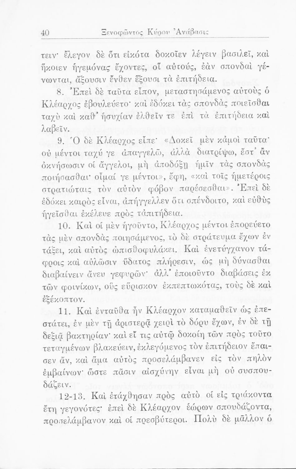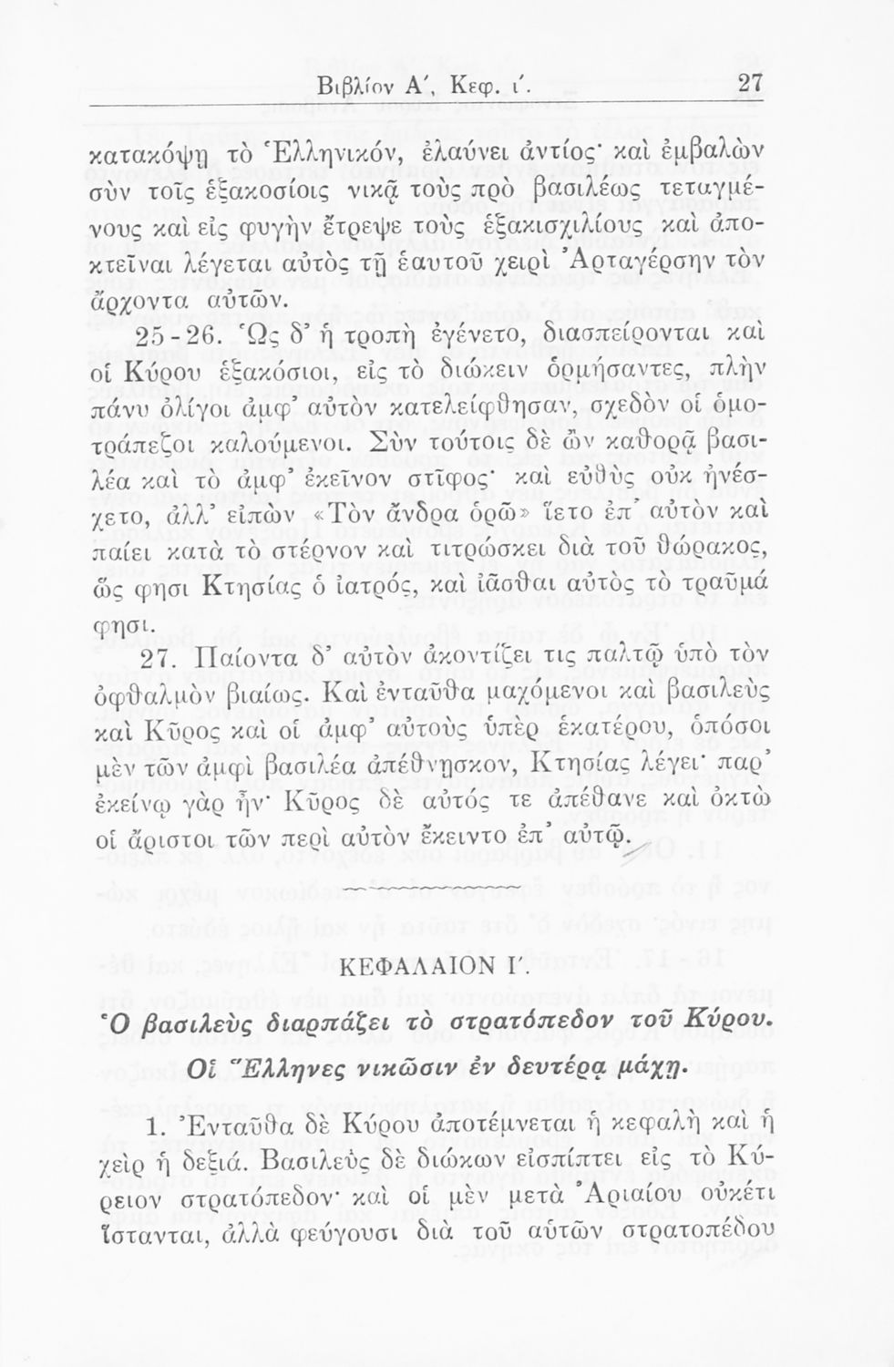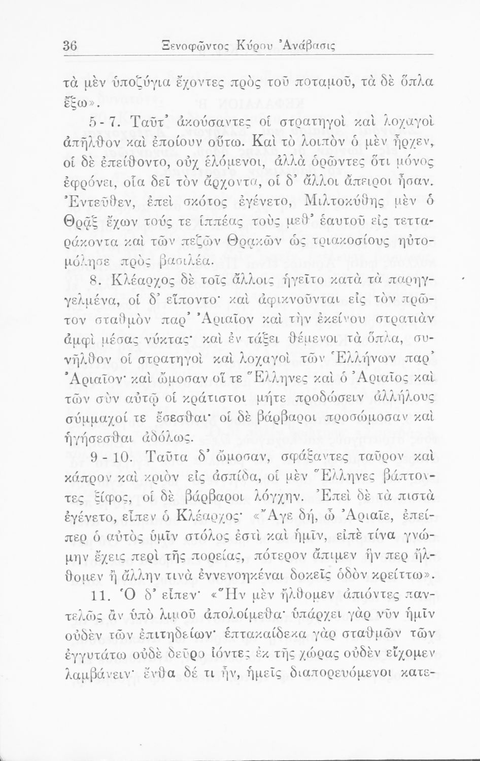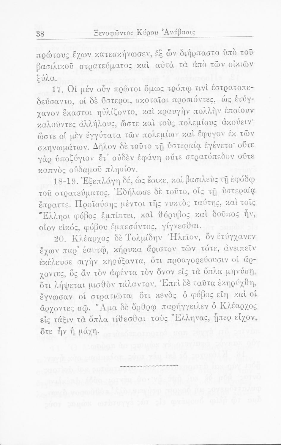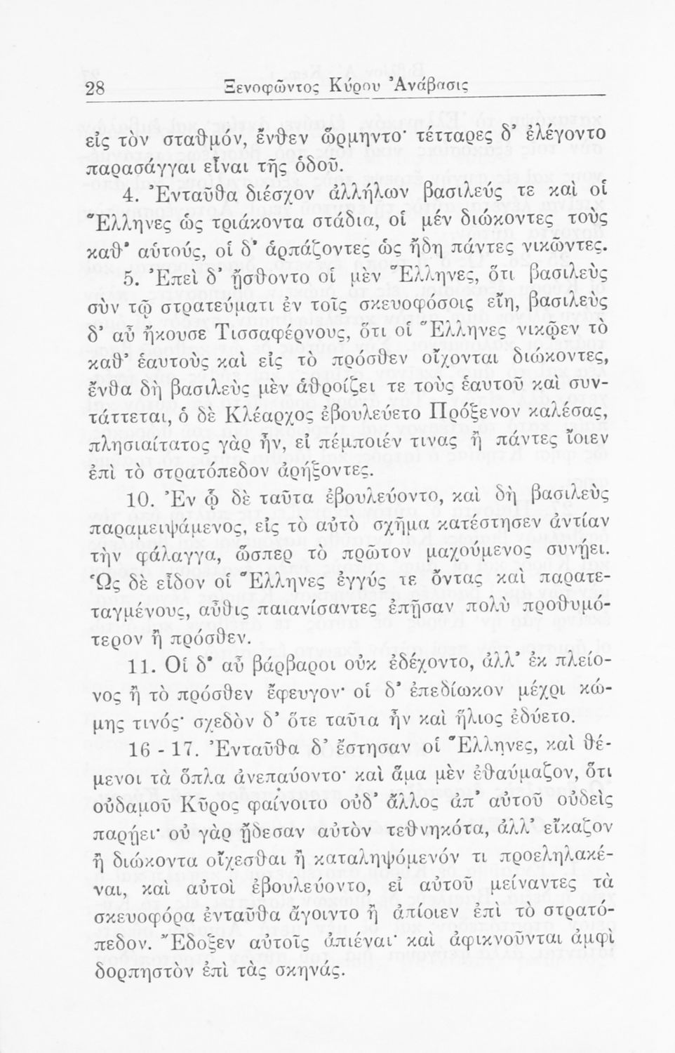 Σχολικό εγχειρίδιο Α΄ και Β΄ Γυμνασίου για το μάθημα των Αρχαίων. Περιλαμβάνει κείμενα κατ΄ επιλογή από το έργο του Ξενοφώντα Κύρου Ανάβαση από το πρωτότυπο. Περιέχει πραγματολογικά σχόλια και λεξιλογικές παρατηρήσεις του συγγραφέα. Εγκρίθηκε για μια δεκαετία από το σχολικό έτος 1931-1932.