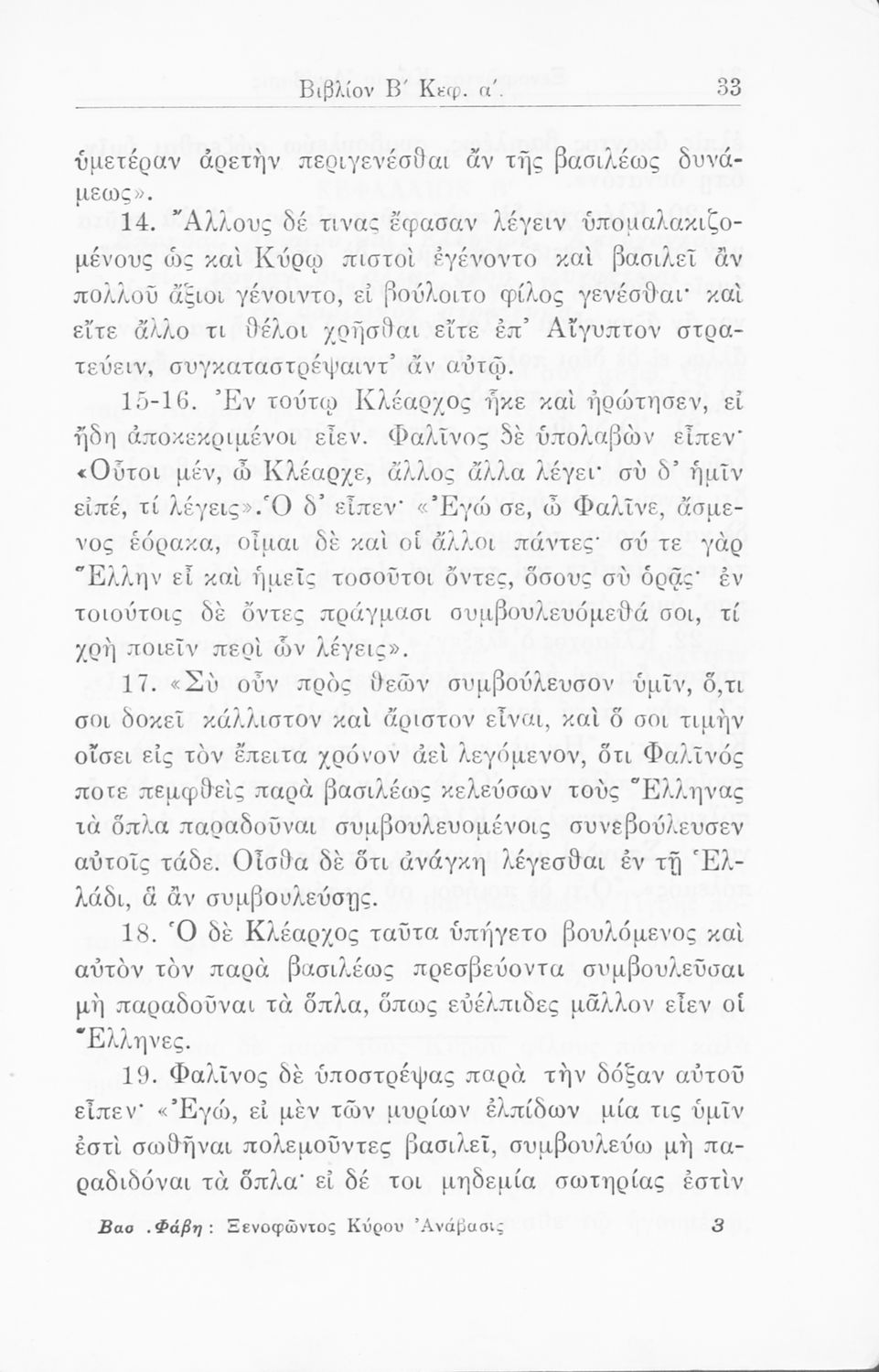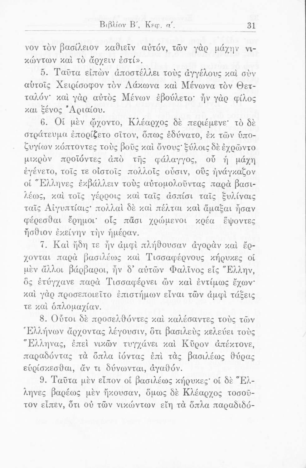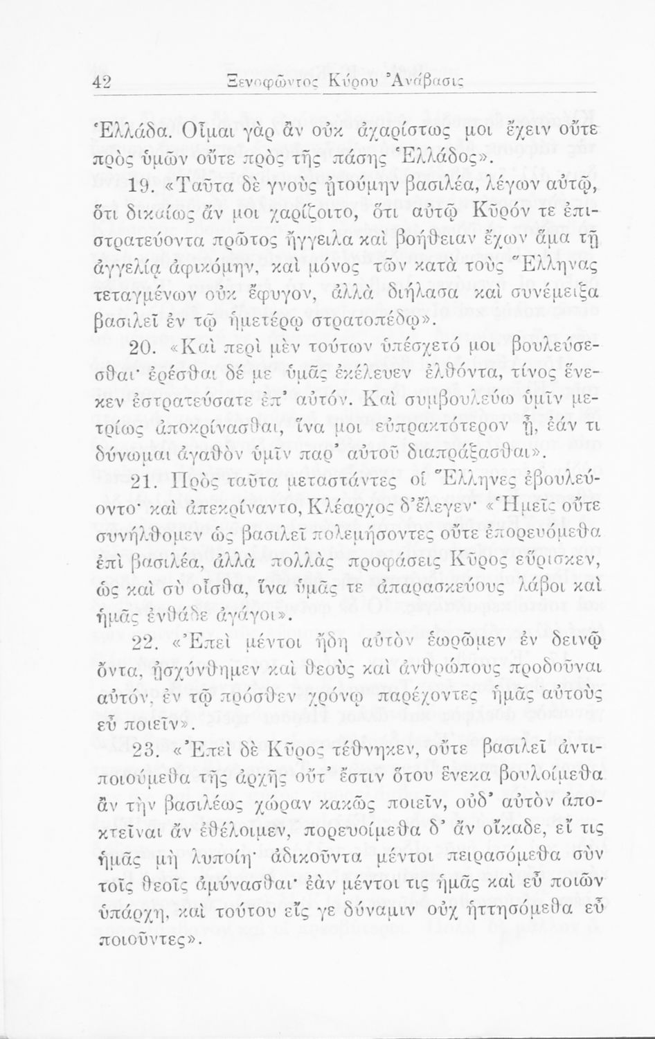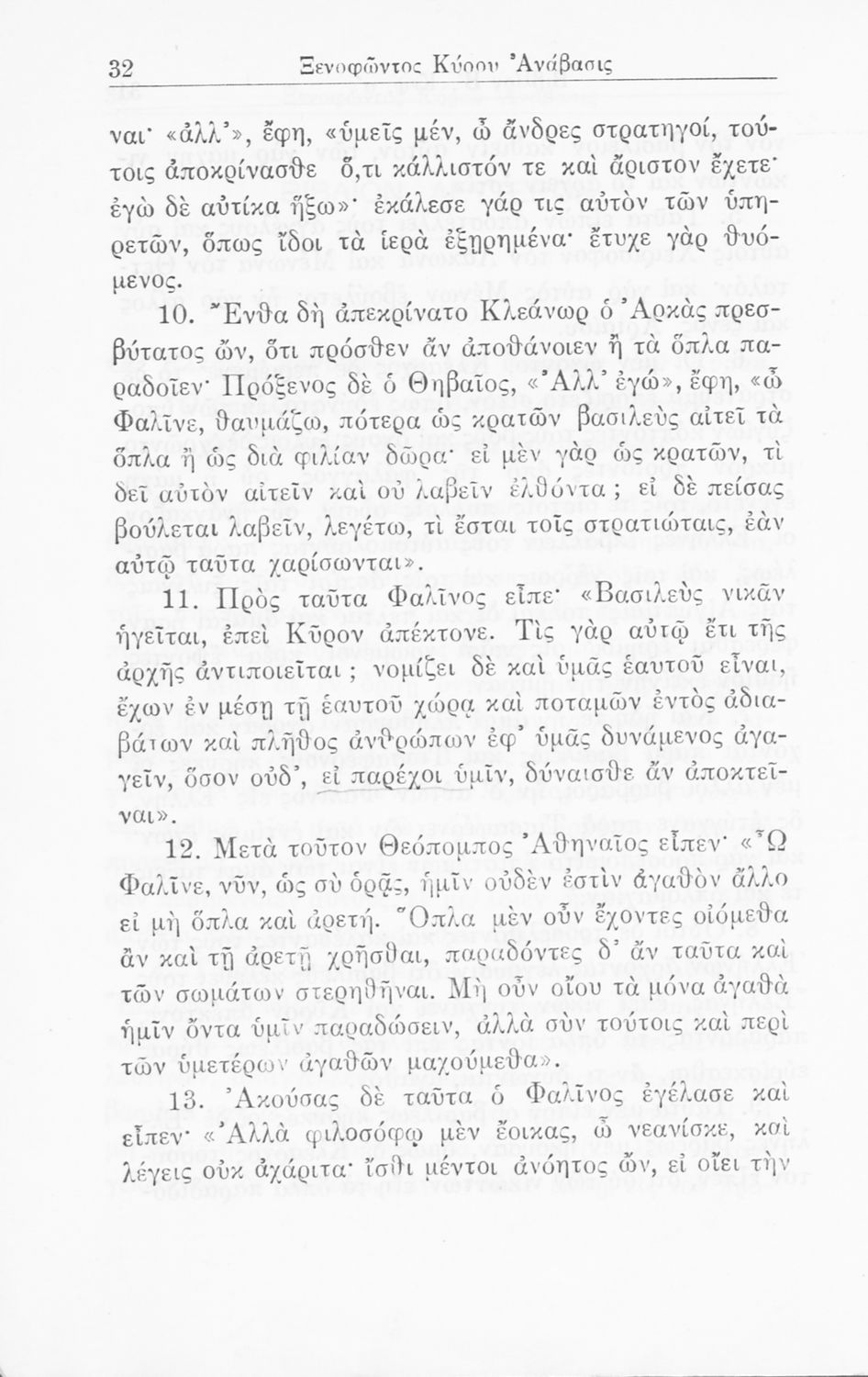 Σχολικό εγχειρίδιο Α΄ και Β΄ Γυμνασίου για το μάθημα των Αρχαίων. Περιλαμβάνει κείμενα κατ΄ επιλογή από το έργο του Ξενοφώντα Κύρου Ανάβαση από το πρωτότυπο. Περιέχει πραγματολογικά σχόλια και λεξιλογικές παρατηρήσεις του συγγραφέα. Εγκρίθηκε για μια δεκαετία από το σχολικό έτος 1931-1932.