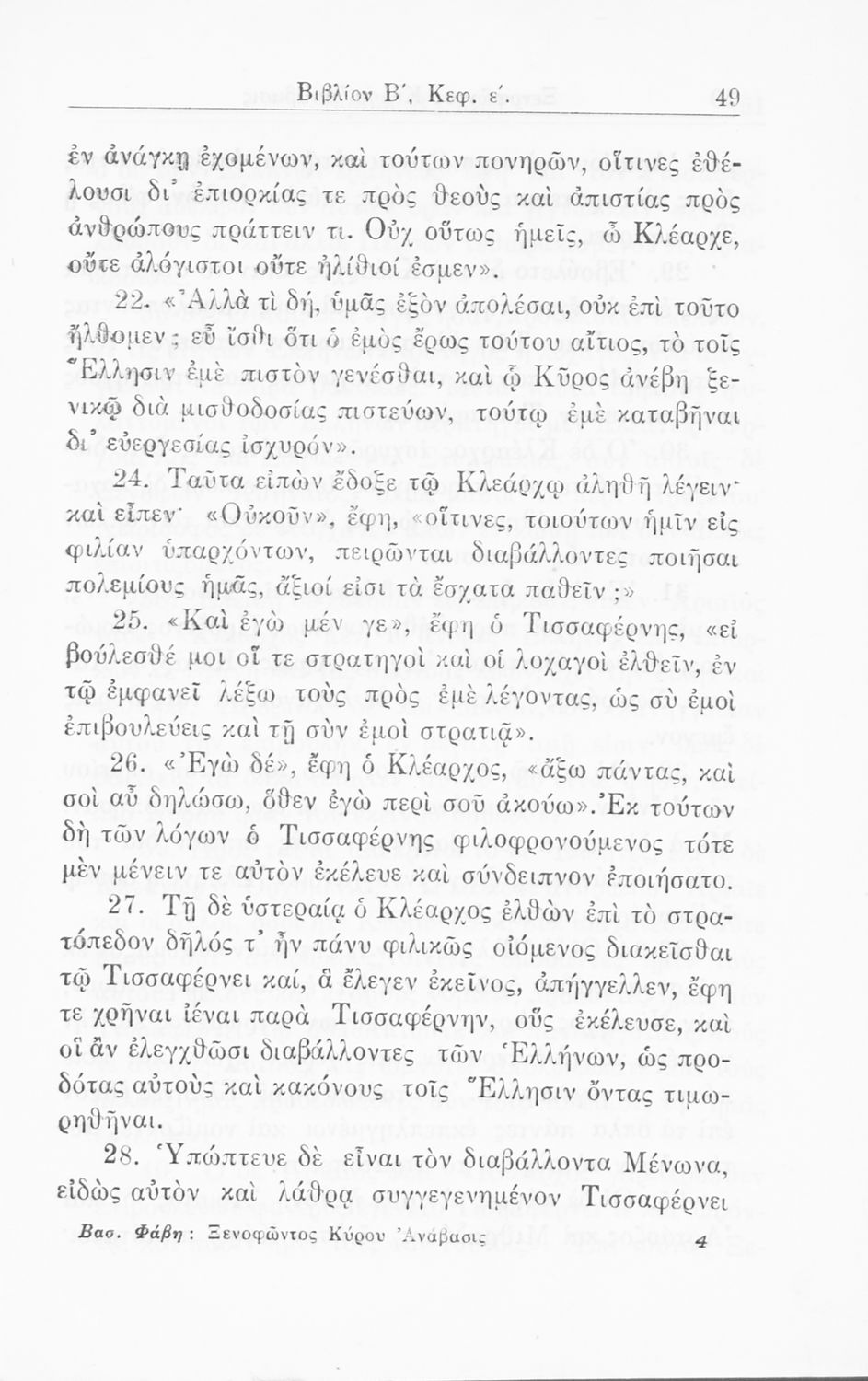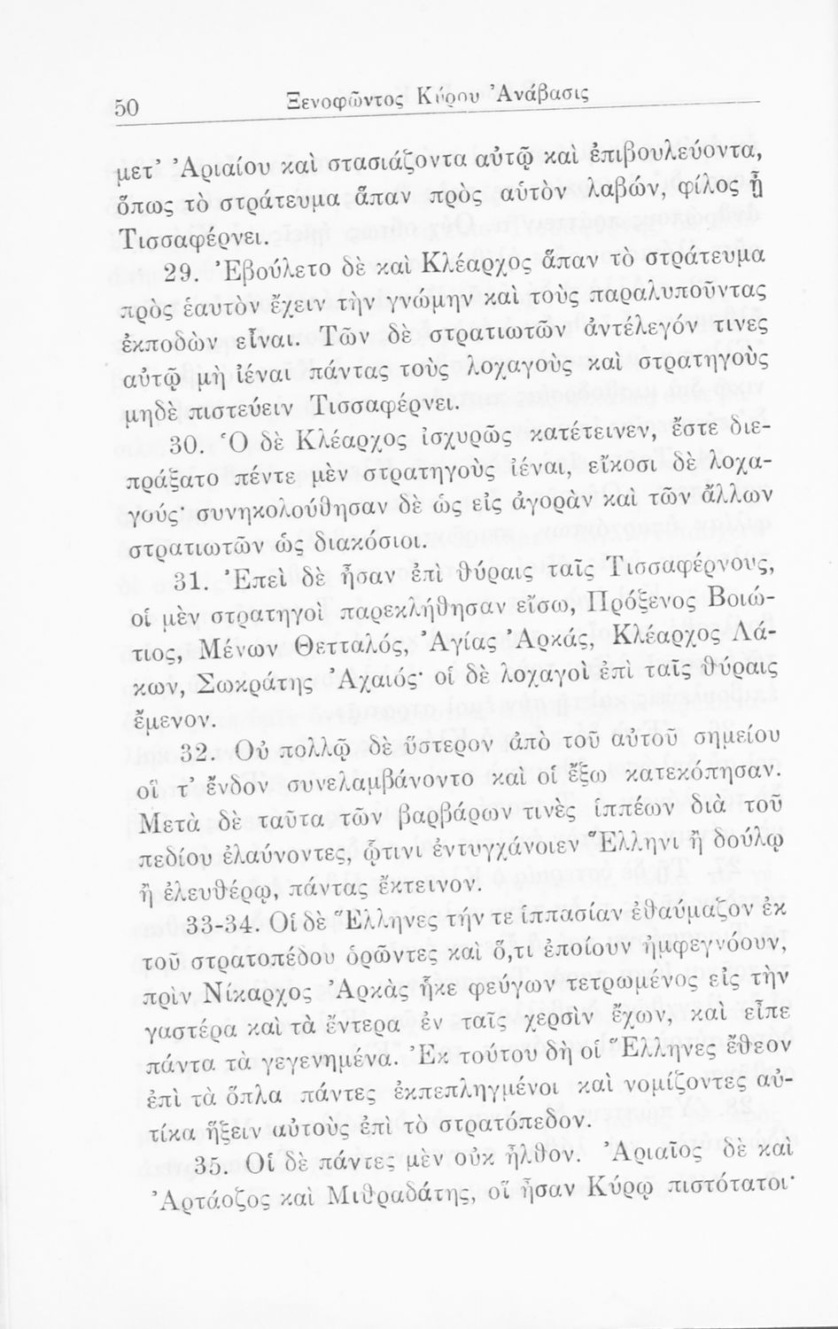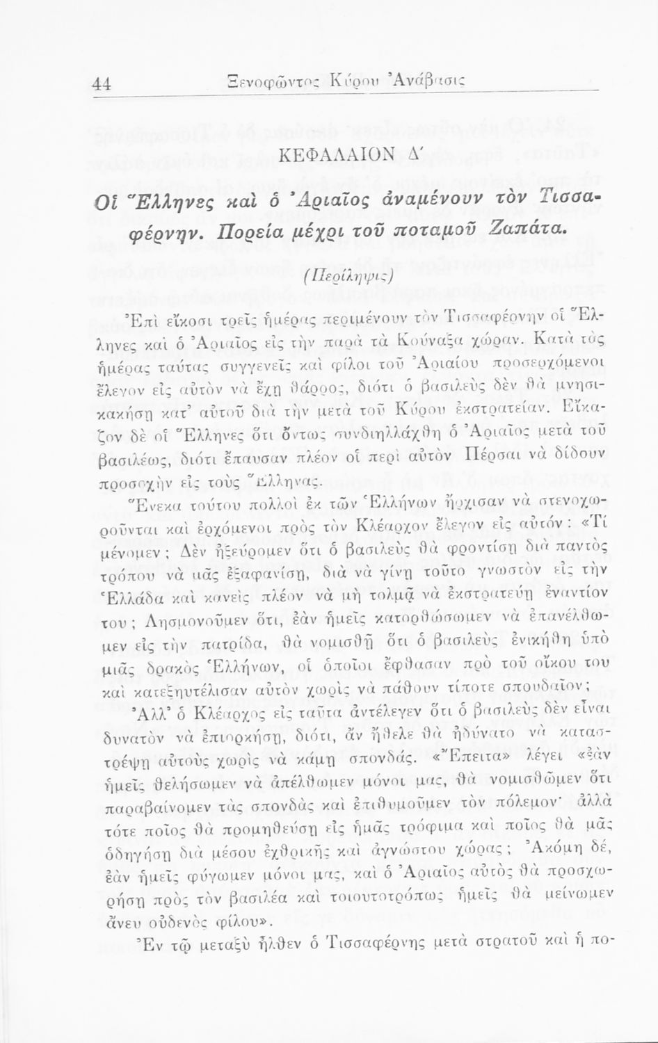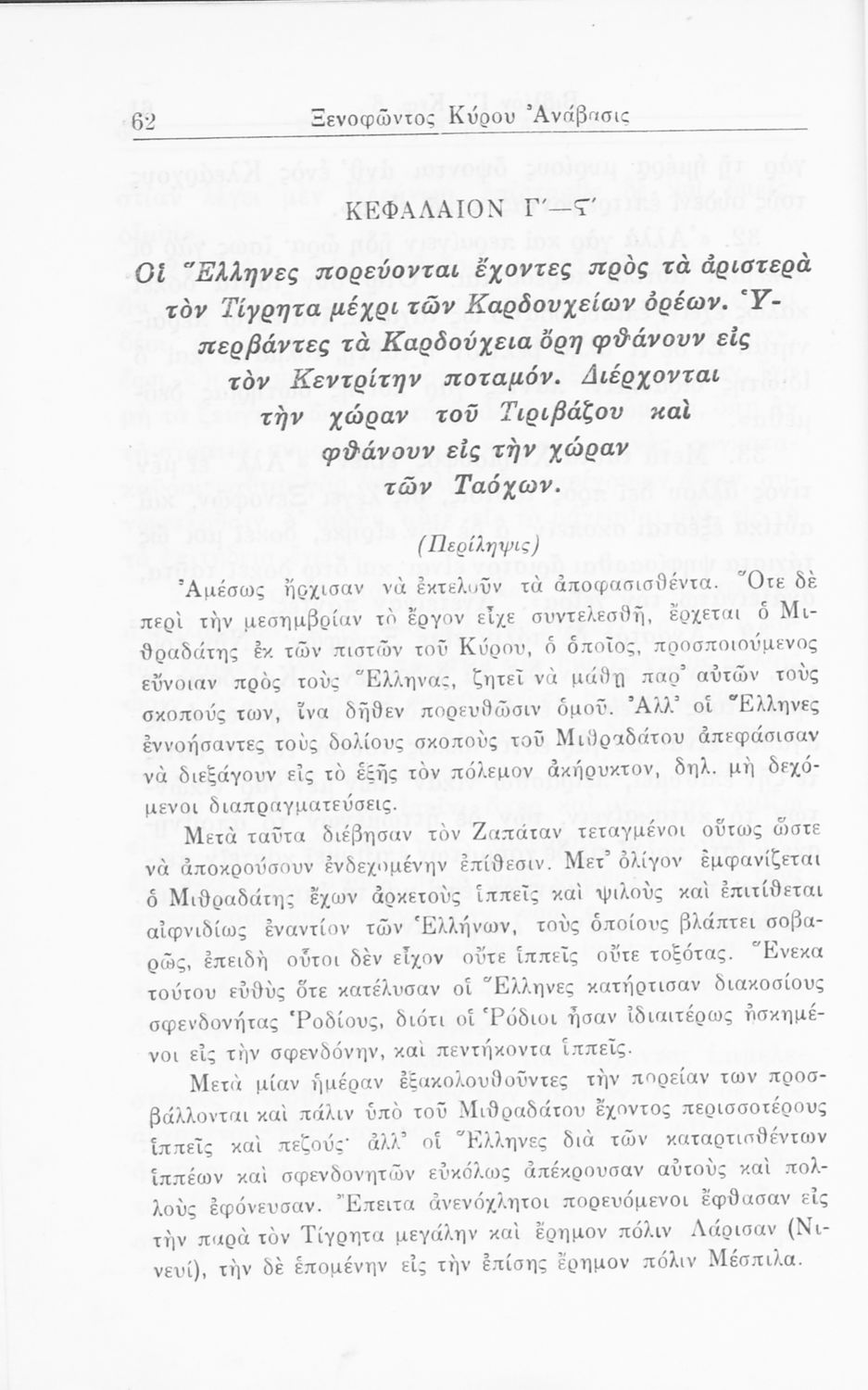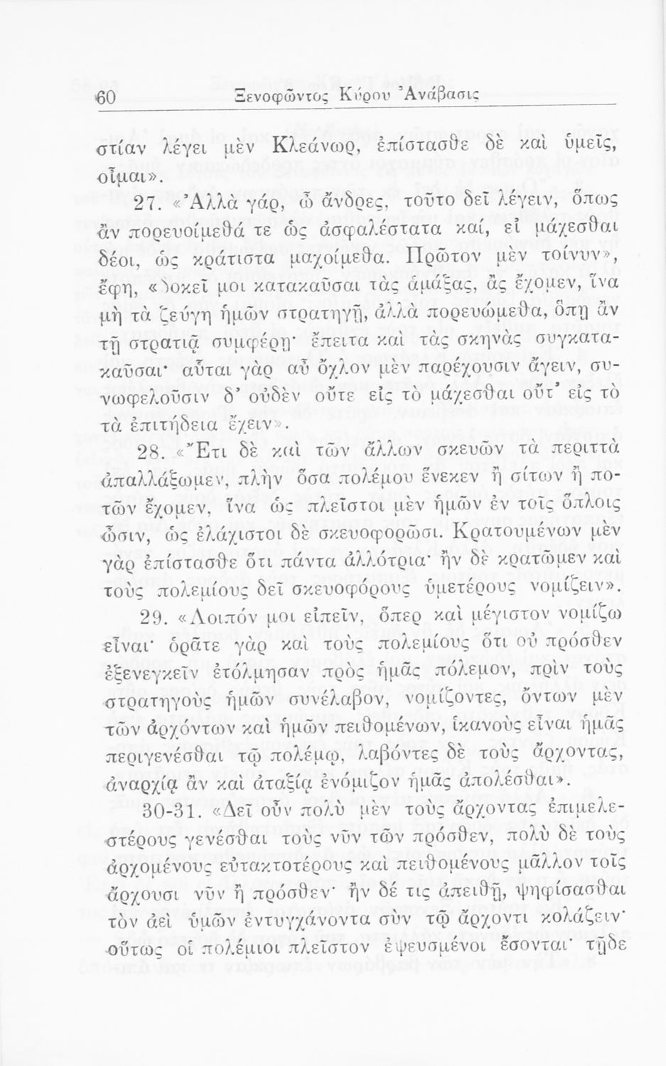 Σχολικό εγχειρίδιο Α΄ και Β΄ Γυμνασίου για το μάθημα των Αρχαίων. Περιλαμβάνει κείμενα κατ΄ επιλογή από το έργο του Ξενοφώντα Κύρου Ανάβαση από το πρωτότυπο. Περιέχει πραγματολογικά σχόλια και λεξιλογικές παρατηρήσεις του συγγραφέα. Εγκρίθηκε για μια δεκαετία από το σχολικό έτος 1931-1932.