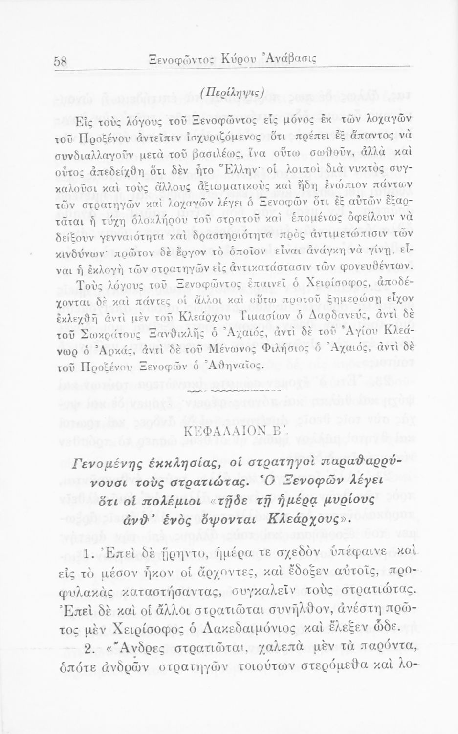 Σχολικό εγχειρίδιο Αρχαίων Ελληνικών Β' Ελληνικού Σχολείου που περιλαμβάνει αποσπάσματα από το έργο του Ξενοφώντα Κύρου Ανάβασις, ερμηνευτικές, γλωσσικές, γραμματικές και συντακτικές παρατηρήσεις, και ασκήσεις
