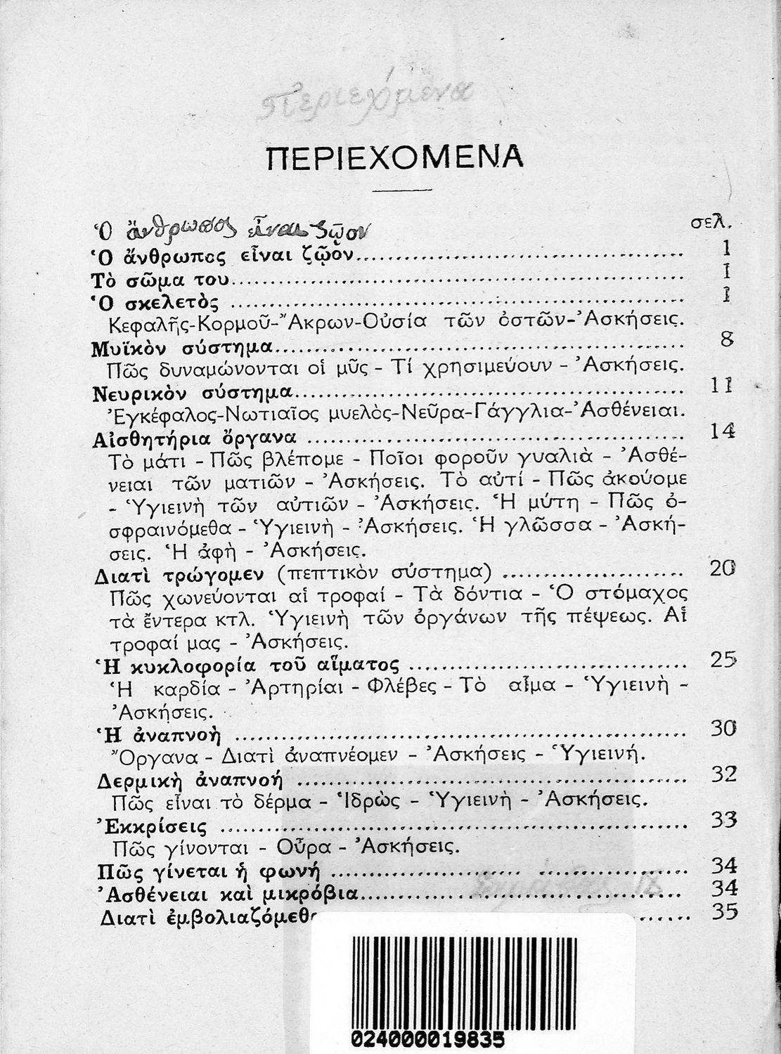 LDR 01049 2200193 4500 035 ## _a01-17664c 040 ## _aΙνστιτούτο Εκπαιδευτικής Πολιτικής 041 ## _ael 100 ## _aΗ. Κ Μπουλοχέρης _aΜάνος Μασούρης 110 ## _a17664c 245 0# _aΑνθρωπολογία και υγιεινή δια την ΣΤ΄ τάξη των Δημοτικών Σχολείων και συνδιδασκόμενες Ε΄ και ΣΤ΄ 260 ## _aΑθήνα _bΔημ. Δημητράκος _c1936 300 ## _a35 _bΕξώφυλλο (έγχρωμο), Σκίτσα (ασπρόμαυρα) _c17 520 ## _aΣχολικό εγχειρίδιο Ανθρωπολογίας και Υγιεινής ΣΤ΄ Δημοτικού που εστιάζει στην λειτουργία του ανθρώπινου σώματος. 521 ## _aΣΤ' Δημοτικού 522 ## _aΕλλάδα 546 ## _aΑπλή καθαρεύουσα 563 ## _aΣκληρό Εξώφυλλο 650 #4 _aΑνατομία _aΦυσιολογία