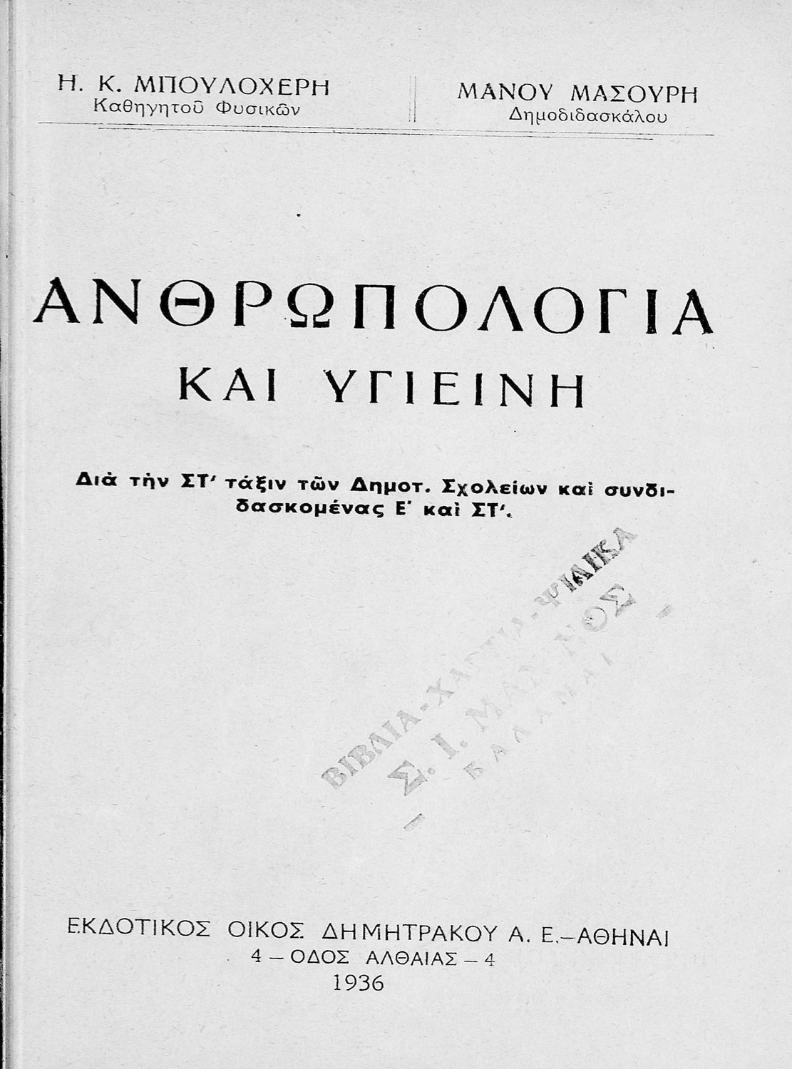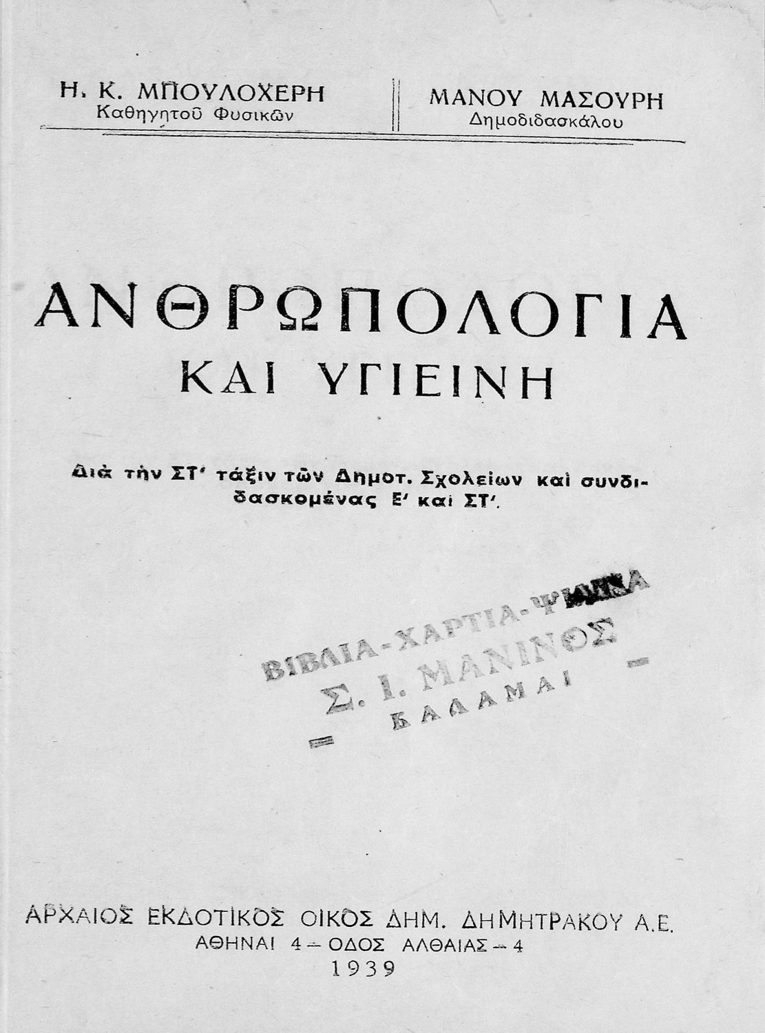 Κωδικός αναγνώρισης: 01-17664c Τίτλος: Ανθρωπολογία και υγιεινή δια την ΣΤ΄ τάξη των Δημοτικών Σχολείων και συνδιδασκόμενες Ε΄ και ΣΤ΄ Συγγραφέας: Η. Κ Μπουλοχέρης, Μάνος Μασούρης Μέγεθος και υπόστρωμα: Σχολικό εγχειρίδιο, 17εκ., σκληρό εξώφυλλο, 35 σελίδες. Εξώφυλλο (έγχρωμο), σκίτσα (ασπρόμαυρα). |