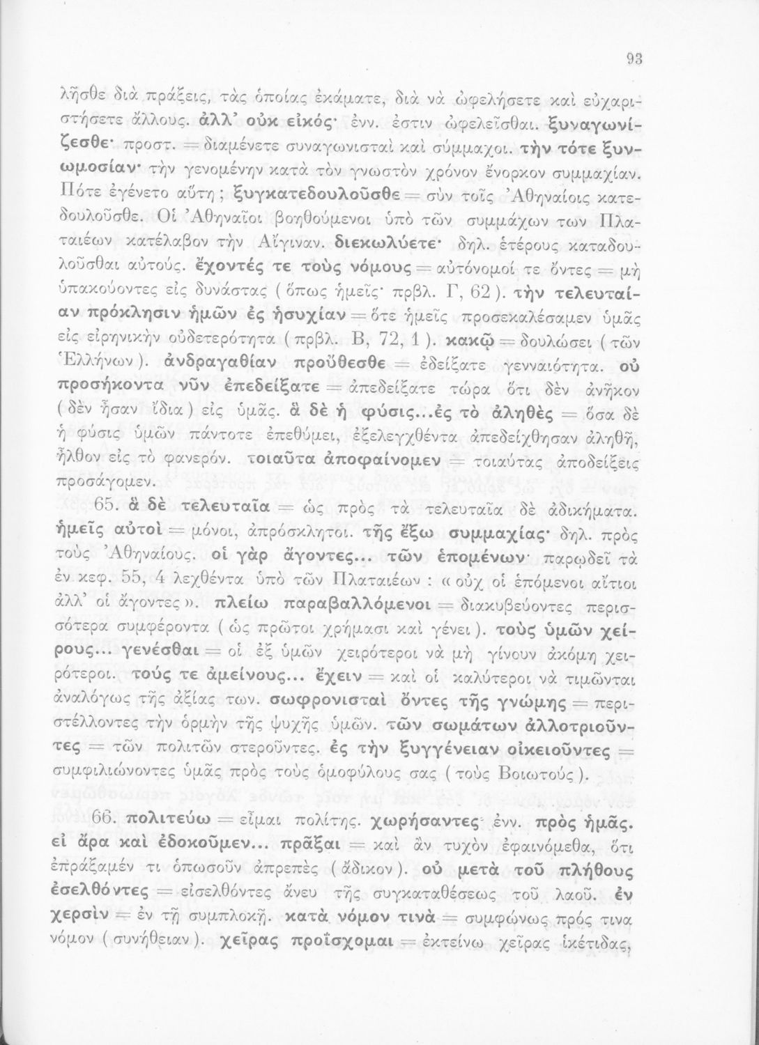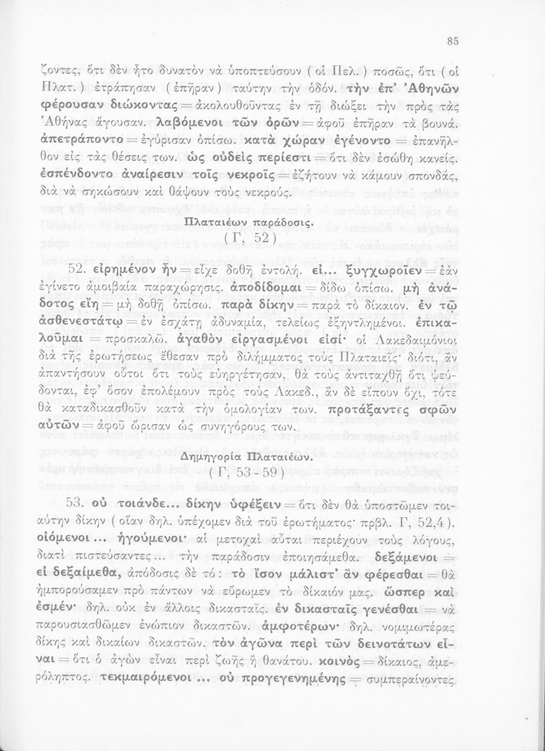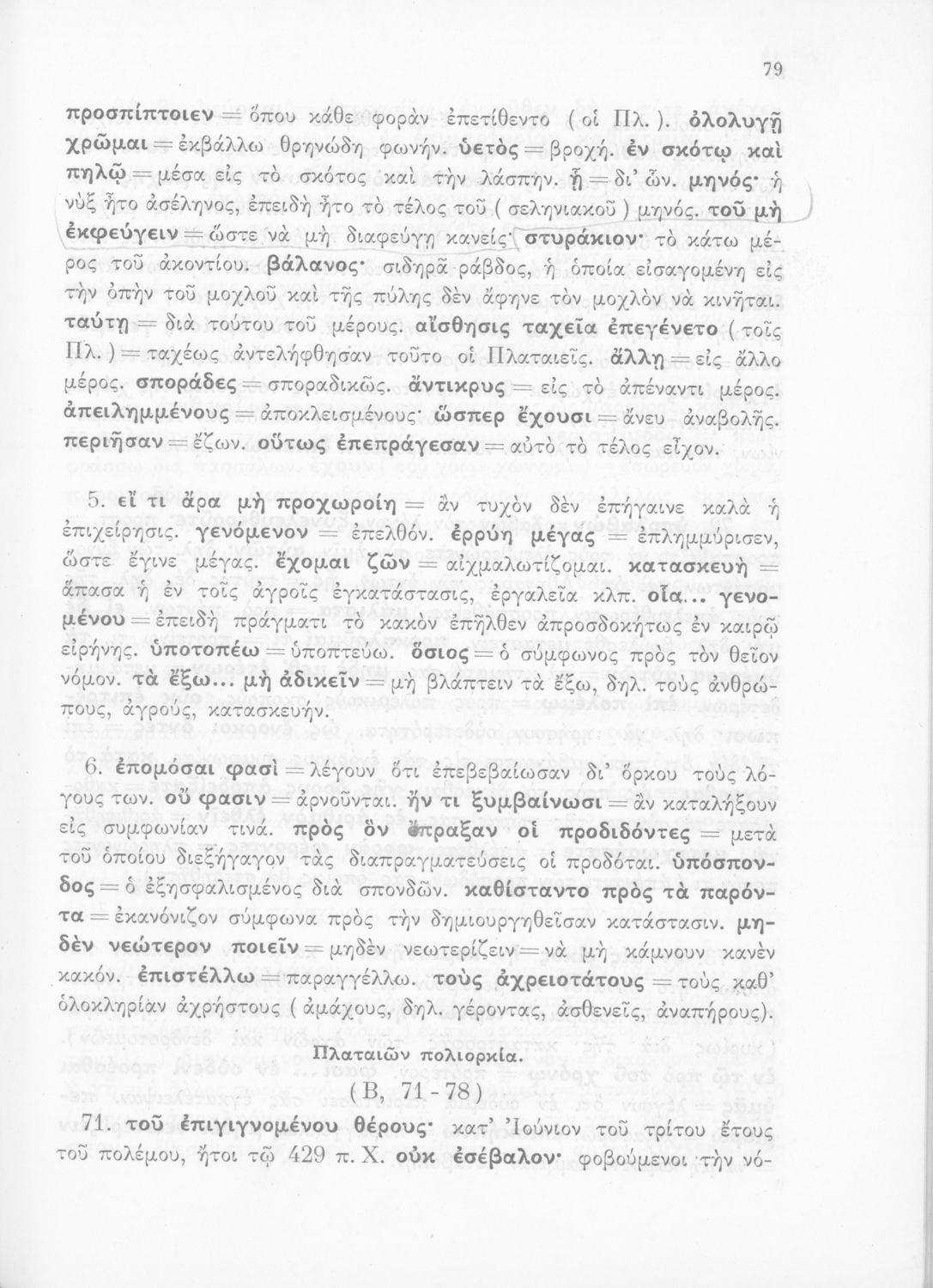 Σχολικό εγχειρίδιο Αρχαίων Ελληνικών για τις Δ΄, Ε΄ και ΣΤ΄ Γυμνασίου παλαιού τύπου που περιλαμβάνει σύντομο βιογραφικό σημείωμα του Θουκυδίδη, περιγραφή του ιστορικού πλαισίου, αποσπάσματα από τα Πλαταϊκά, τα