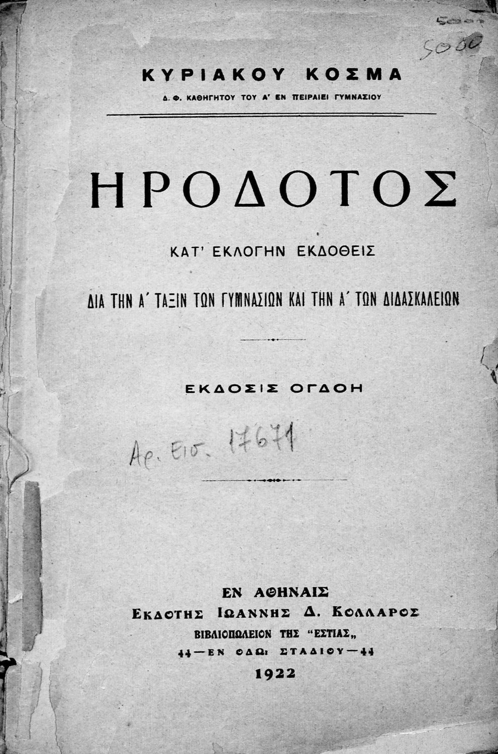Κωδικός αναγνώρισης: 01-17671 Τίτλος: Ηρόδοτος κατ΄ εκλογήν εκδοθείς δια την Α΄ Τάξιν των Γυμνασίων και την Α΄ των Διδασκαλείων Συγγραφέας: Ηρόδοτος, Κυριάκος Κοσμάς (σχόλια) Μέγεθος και υπόστρωμα: Σχολικό εγχειρίδιο, σκληρό εξώφυλλο, 227 σελίδες. |