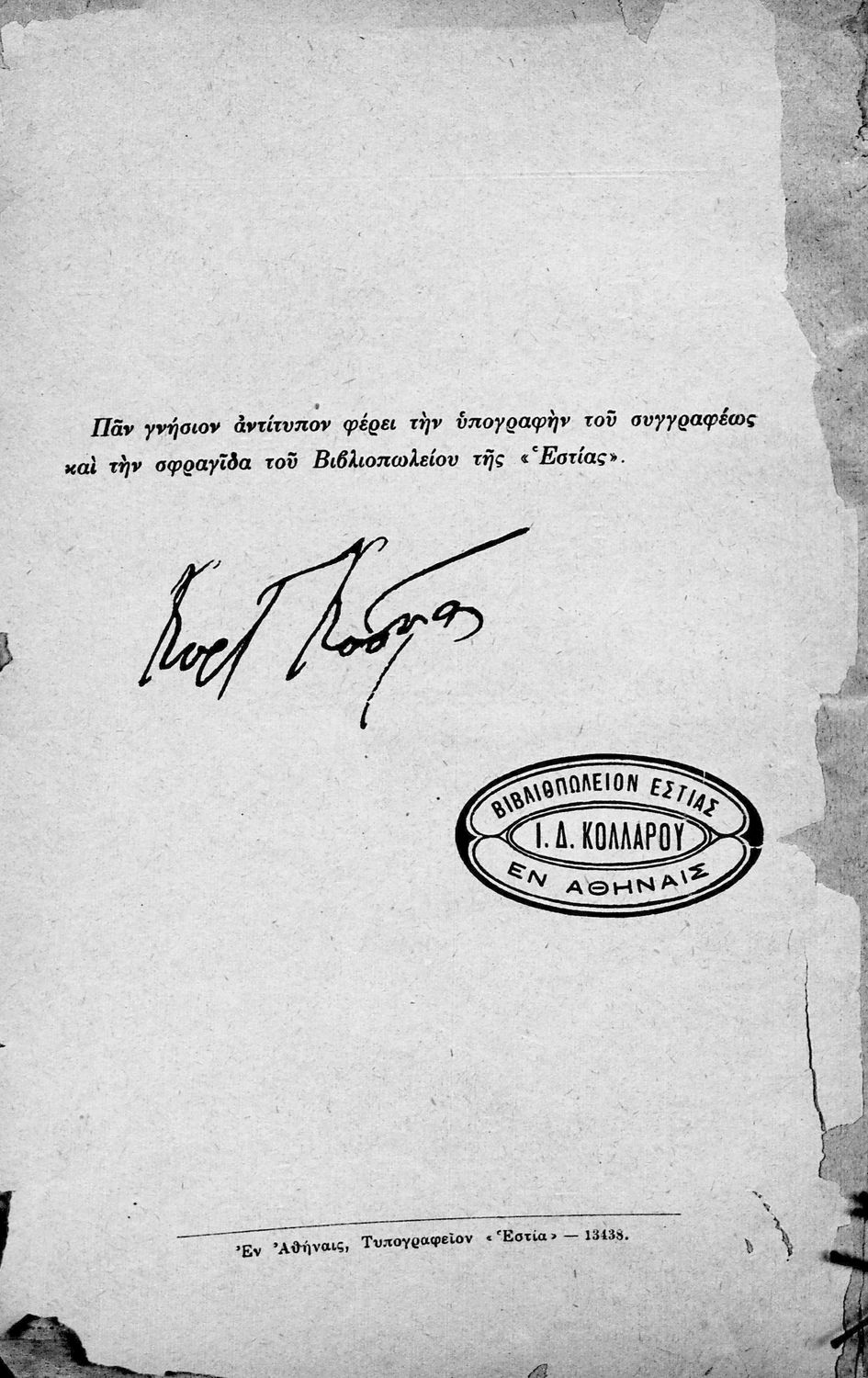 Εκδότης: Ιωάννης Δ. Κολλάρος, Βιβλιοπωλείο της "Εστίας" Έτος έκδοσης: 1922 Τόπος έκδοσης: Αθήνα Έκδοση: 8η |