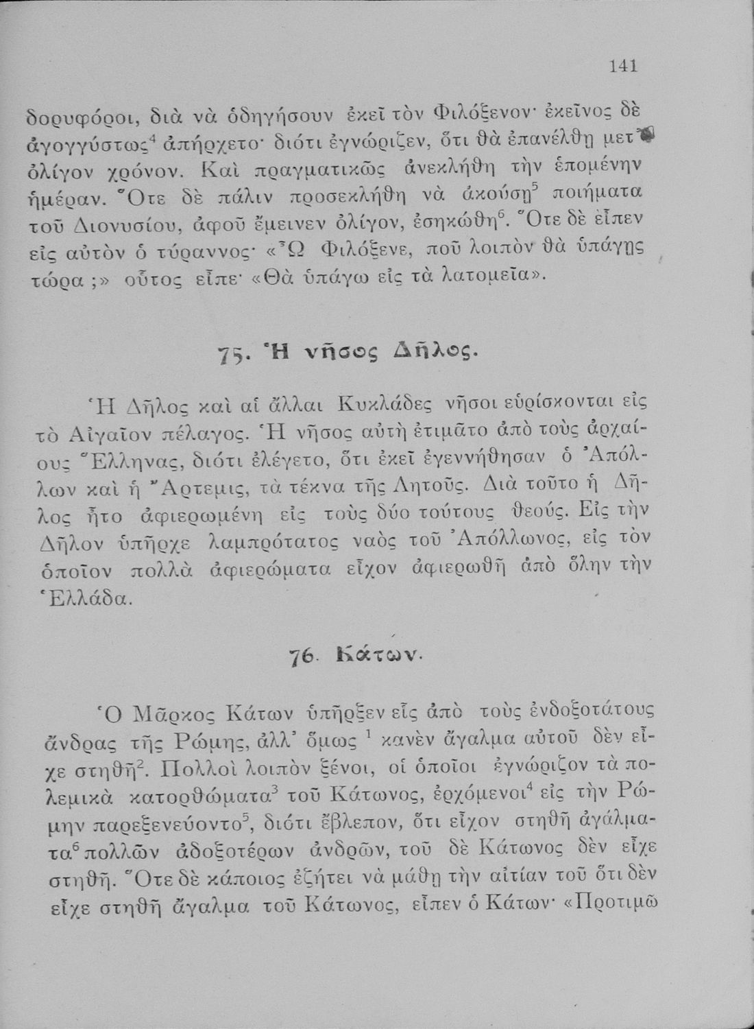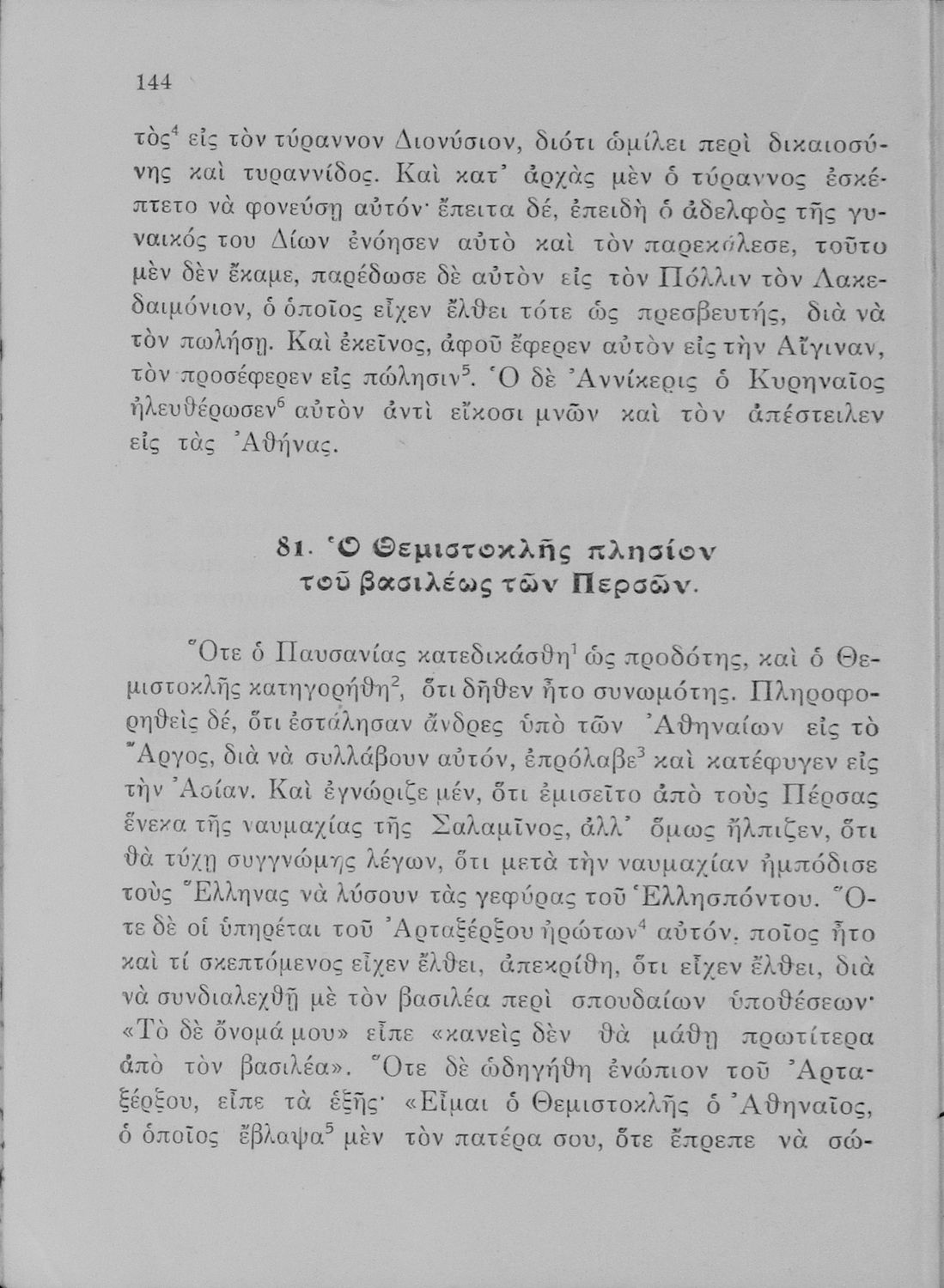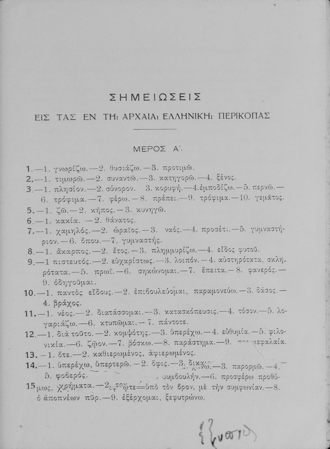 Σχολικό εγχειρίδιο Αρχαίων Ελληνικών Γυμνασίου που περιέχει κείμενα βασισμένα στην αρχαία ελληνική ιστορία και μυθολογία και γραμματικές, συντακτικές και ετυμολογικές παρατηρήσεις.