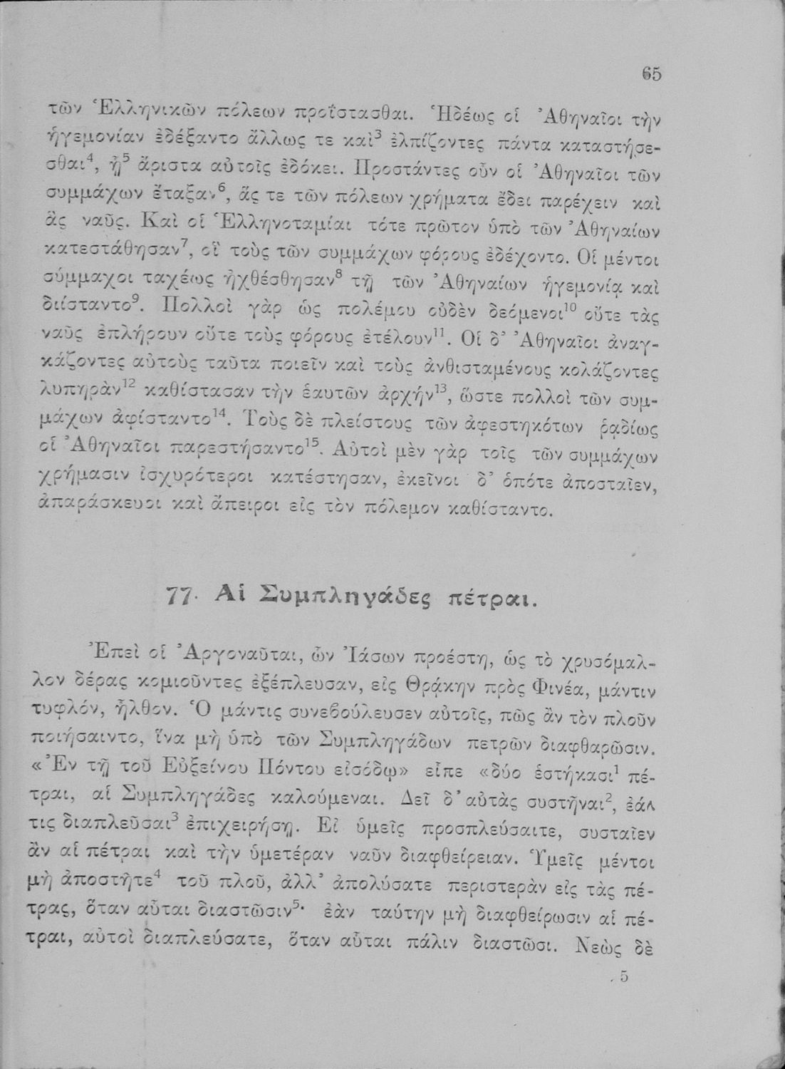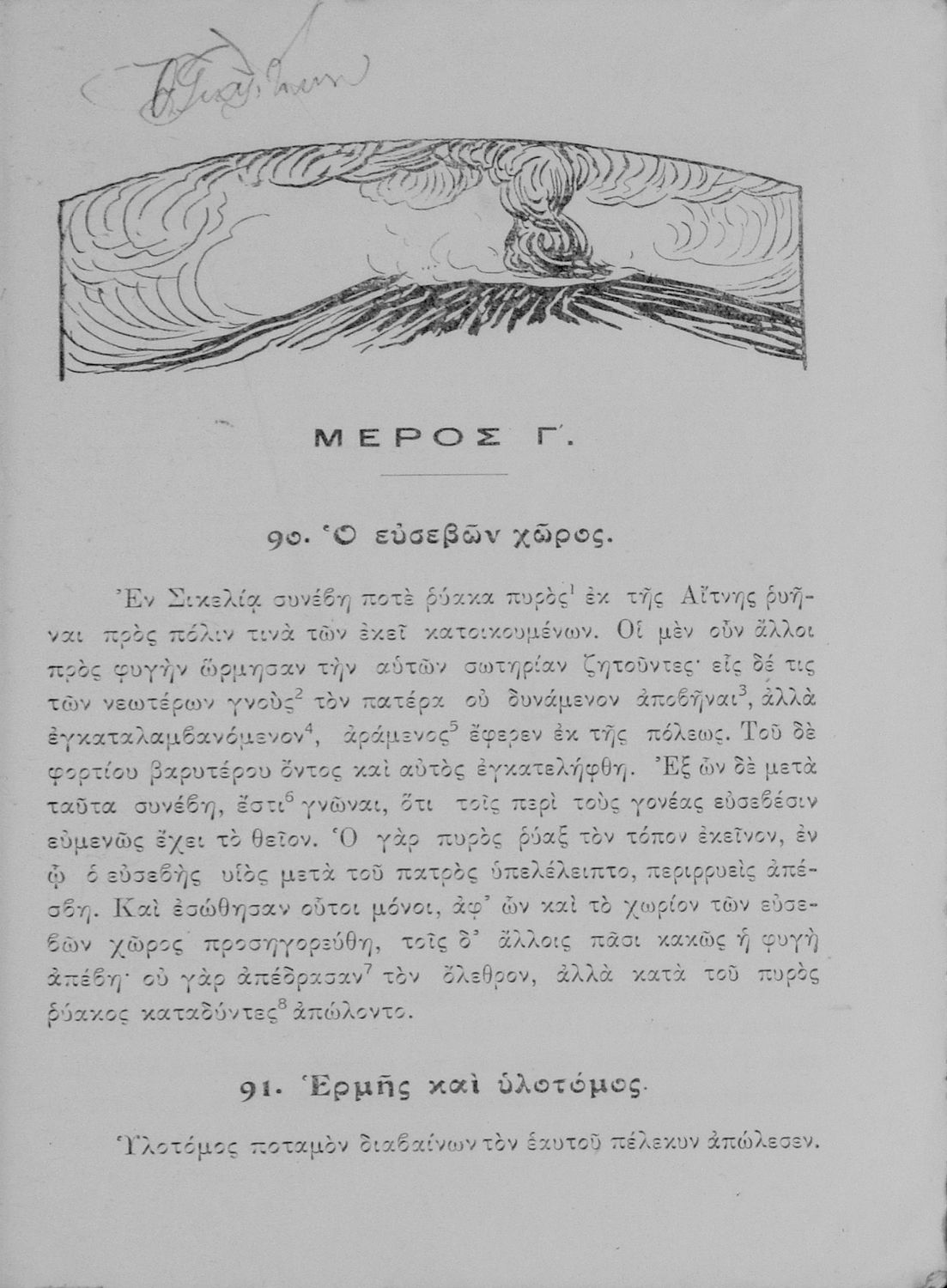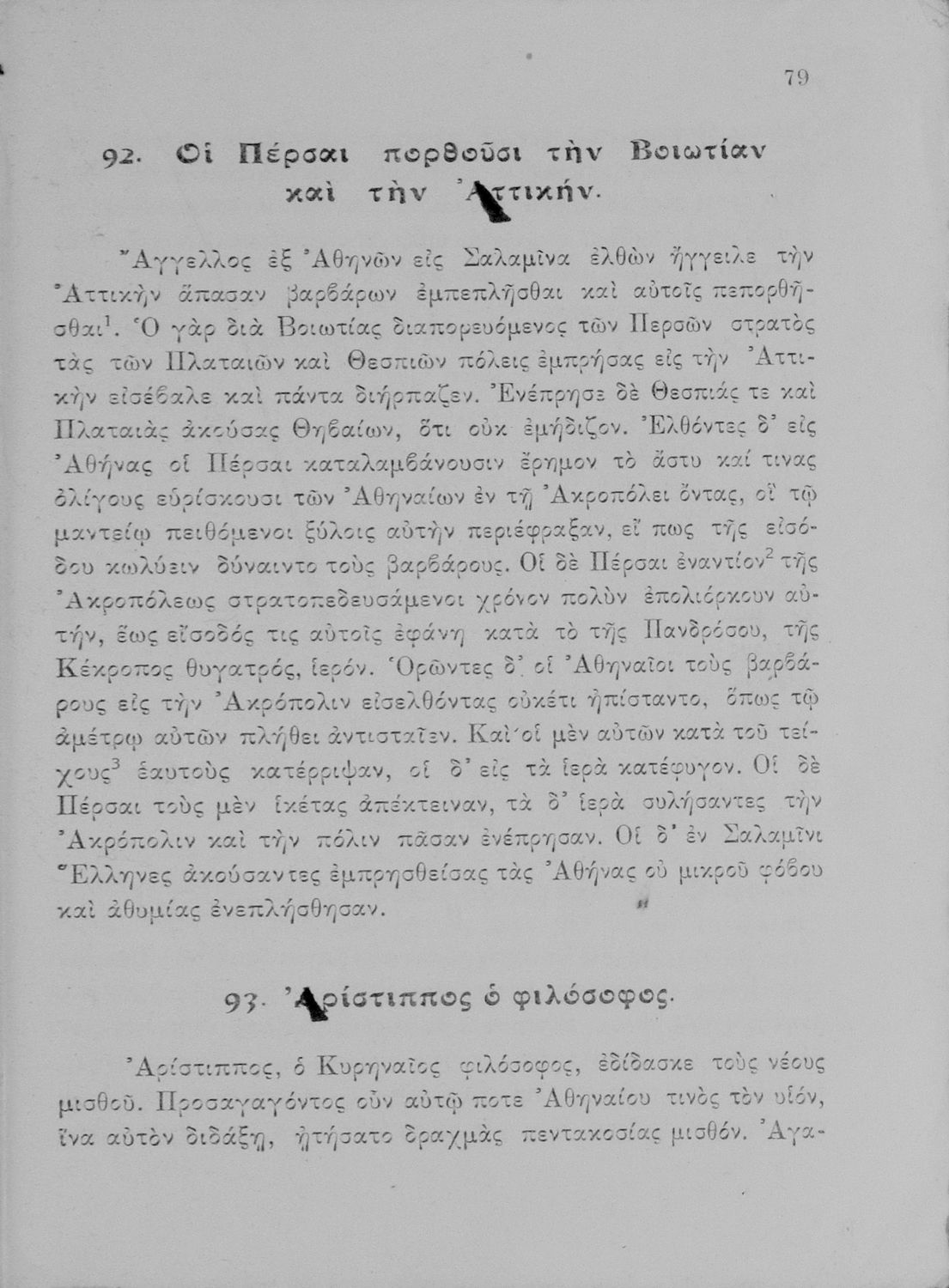 Σχολικό εγχειρίδιο Αρχαίων Ελληνικών Γυμνασίου που περιέχει κείμενα βασισμένα στην αρχαία ελληνική ιστορία και μυθολογία και γραμματικές, συντακτικές και ετυμολογικές παρατηρήσεις.